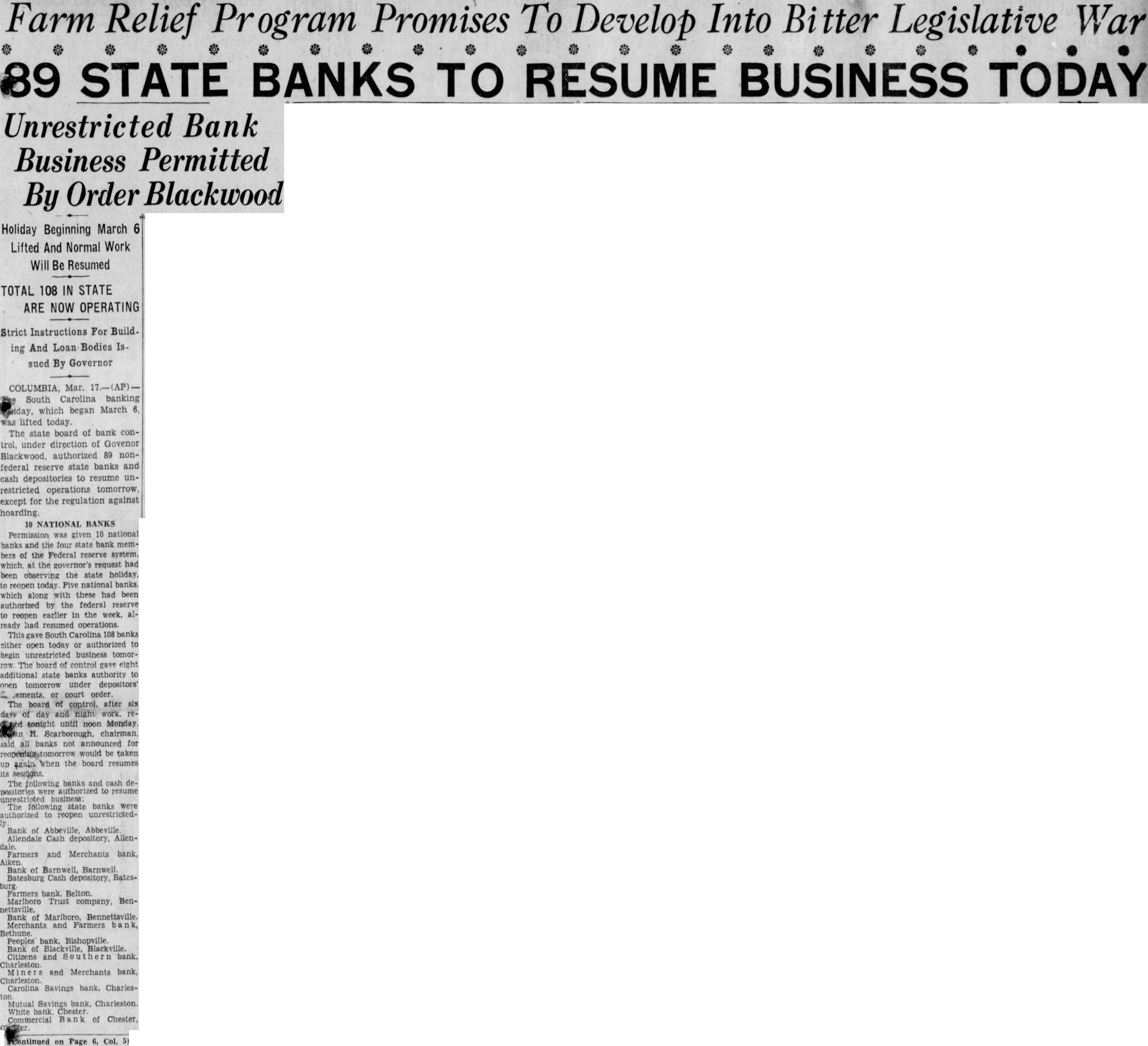 Farm Relief Program Promises To Develop Into Bitter Legislative War STATE BANKS TO RESUME BUSINESS TODAY Unrestricted Bank Business Permitted By Order Blackwood Holiday Beginning March Lifted And Normal Work Will Be Resumed TOTAL 108 IN STATE ARE NOW OPERATING Strict Instructions For Building And Loan Bodies Issued By Governor COLUMBIA, Mar. South Carolina banking which began March lifted today. The state board of bank control, under direction of Govenor Blackwood, authorized 89 nonfederal reserve state banks and cash depositories to resume unrestricted operations tomorrow, except the regulation against 10 NATIONAL BANKS Permission was given 10 national banks and four state bank members of the Federal reserve system, which at the request had been observing the state holiday. to reopen today. Five national banks. which along with these had been authorized by the federal reserve to reopen earlier in the week, already had resumed operations. South Carolina 108 banks either open today authorized to begin unrestricted business tomorrow. The board control gave eight additional state banks authority to open tomorrow under depositors' Lements, or court order. The board of control. after six of day and retonight until noon Monday. H. Scarborough. chairman. all banks not announced for would be taken again when the board resumes its The following banks and cash deto resume business: The state banks were authorized to reopen unrestrictedBank of Abbeville, Abbeville Allendale Cash depository, AllenFarmers and Merchants bank, Aiken. Bank of Barnwell, Barnwell Batesburg Cash depository. Batesburg Farmers bank, Belton. Marlboro Trust company, Bennettsville. Bank Marlboro, Bennettsville. and Farmers Bethune. Peoples bank, Bishopville. Bank of Blackville, Blackville. Citizens and bank, and Merchants bank, Charleston. Carolina Savings bank, Charles- Mutual Savings bank, Charleston White Chester. Commercial Bank of Chester, Continued on Page 6, Col.