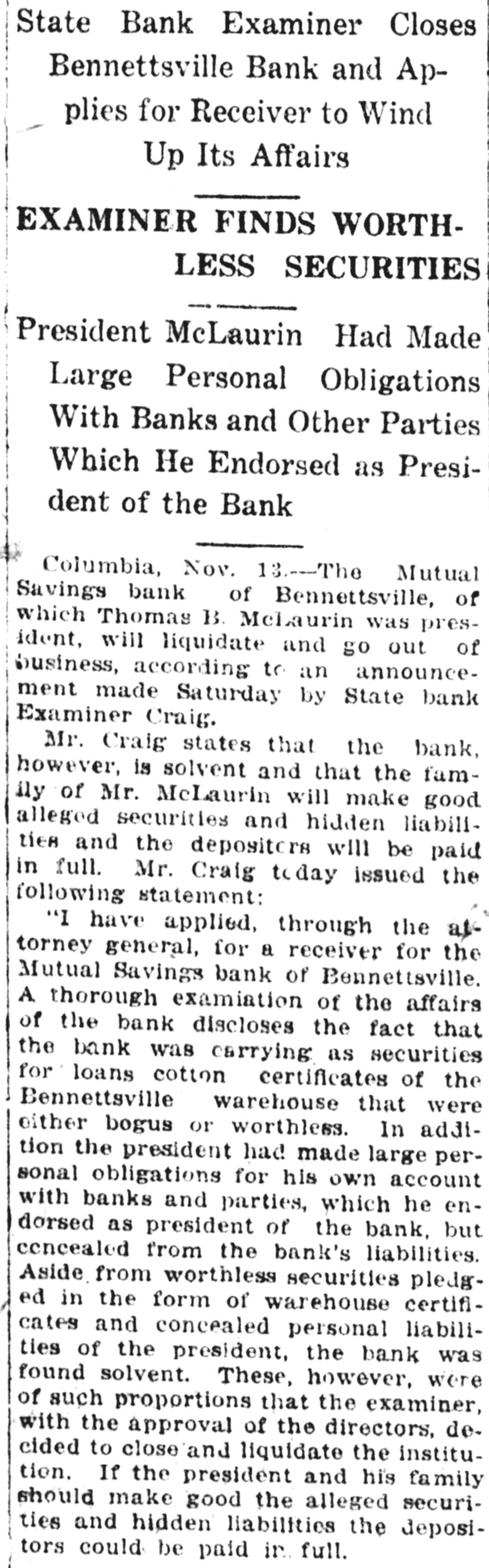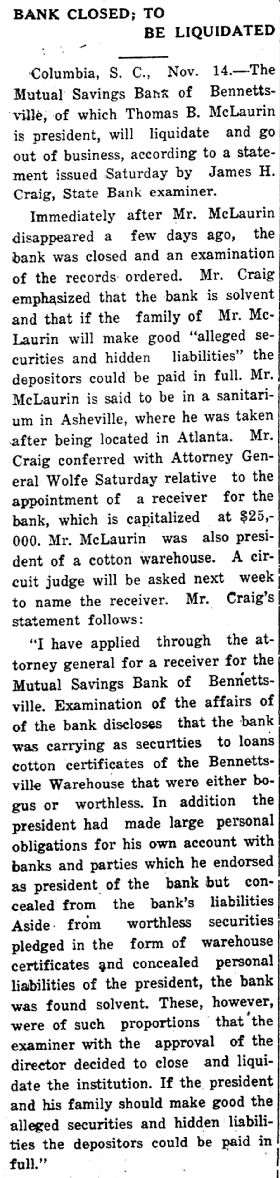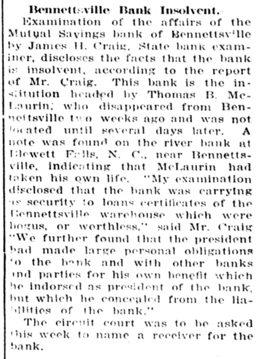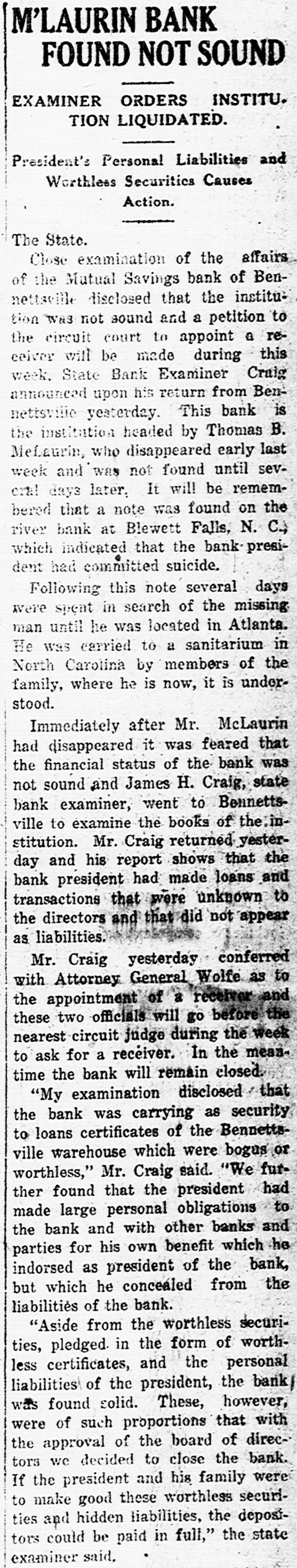 M'LAURIN BANK FOUND NOT SOUND EXAMINER ORDERS INSTITU. TION LIQUIDATED. President's Personal Liabilities and Worthlees Securities Causes Action. The State. Close examination of the affairs of the Mutual Savings bank of Bennettsville disclosed that the institution was not sound and a petition to the circuit court to appoint a receiver will be made during this week. State Bank Examiner Craig announced upon his return from Bennettsvitte yeaterday. This bank is the institution headed by Thomas B. MeLaurin, who disappeared early last week and was not found until sevcral days later. It will be remembered that a note was found on the river bank at Blewett Falls, N. C., which indicated that the bank president had committed suicide. Following this note several days were spent in search of the missing man until he was located in Atlanta. He was carried to a sanitarium in North Carolina by members of the family, where he is now, it is understood. Immediately after Mr. McLaurin had disappeared it was feared that the financial status of the bank was not sound and James H. Craig, state bank examiner, went to Bennettsville to examine the books of the.institution. Mr. Craig returned yesterday and his report shows that the bank president had made loans and transactions that were unknown to the directors and that did not appear as liabilities. Mr. Craig yesterday conferred with Attorney General Wolfe as to the appointment of a receiver and these two officials will go before the nearest circuit judge during the week to ask for a receiver. In the meantime the bank will remain elosed. "My examination disclosed / that the bank was carrying as security to loans certificates of the Bennettsville warehouse which were bogus or worthless," Mr. Craig said. "We further found that the president had made large personal obligations to the bank and with other banks and parties for his own benefit which he indorsed as president of the bank, but which he concealed from the liabilities of the bank. "Aside from the worthless securities, pledged. in the form of worthless certificates, and the personal liabilities of the president, the bank was found solid. These, however, were of such proportions that with the approval of the board of directors we decided to close the bank. If the president and his family were to make good these worthless securities and hidden liabilities, the depositors could be paid in full," the state examiner said.