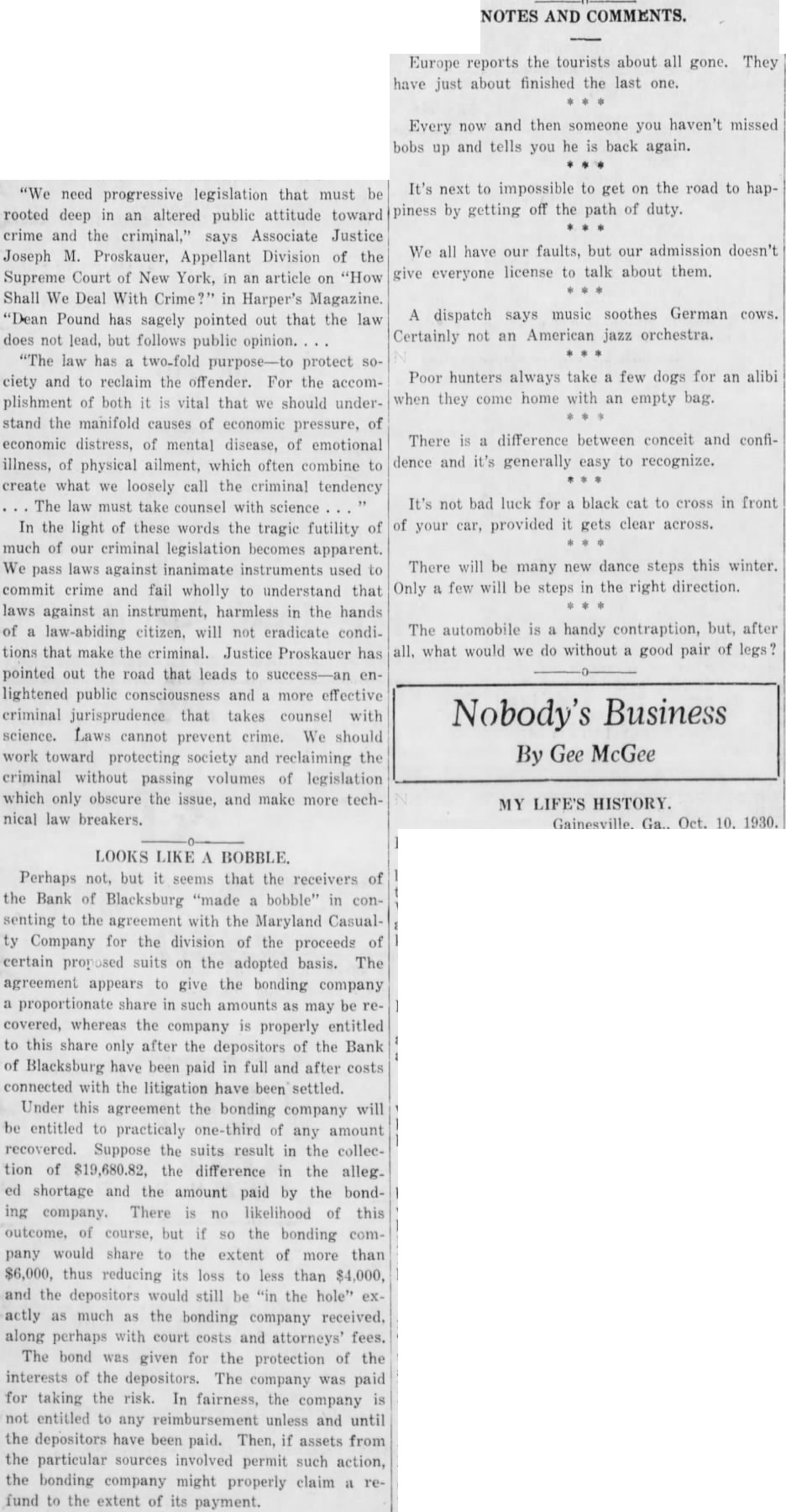 We all have our faults, but admission doesn't give everyone license to talk about them. dispatch says music soothes German cows. Certainly not an American jazz orchestra. next to impossible to get on the road to hapneed progressive legislation that must be piness by getting off the path of duty. rooted deep an altered public attitude toward crime and the criminal," says Associate Justice Joseph M. Proskauer, Appellant Division of the Supreme Court New York, in article "How Shall We Deal With in Harper's Magazine. "Dean Pound has sagely pointed out that the law does not lead, but follows public opinion. law two-fold protect Poor hunters always take few dogs for an alibi ciety and to reclaim the offender. For the accomwhen they come home with an empty bag. plishment of both vital that should understand the manifold causes of economic pressure, of There difference between conceit and confieconomic distress, of mental disease, of emotional dence and generally easy to recognize. of physical ailment, which often combine create what loosely call the criminal tendency not bad luck for black cat to cross in front The must take counsel with science In the light of these words the tragic futility of your car, provided gets clear across. much of our criminal legislation becomes apparent. There will be many new dance steps this winter. pass laws against inanimate instruments used commit crime and fail wholly to understand that Only few will be steps in the right direction. laws against an instrument, harmless in the hands The automobile handy contraption, but, after law-abiding citizen, will not eradicate conditions that make the criminal. Justice Proskauer what would do without good pair of pointed out the road that leads to lightened public consciousness and more effective Business criminal jurisprudence takes counsel with Nobody's science. Laws cannot prevent crime. We should work toward protecting society and reclaiming the By Gee criminal without passing volumes of legislation which only obscure the issue, and make more techMY LIFE'S HISTORY. nical law breakers. Gainesville, Ga., Oct. 10, 1930.