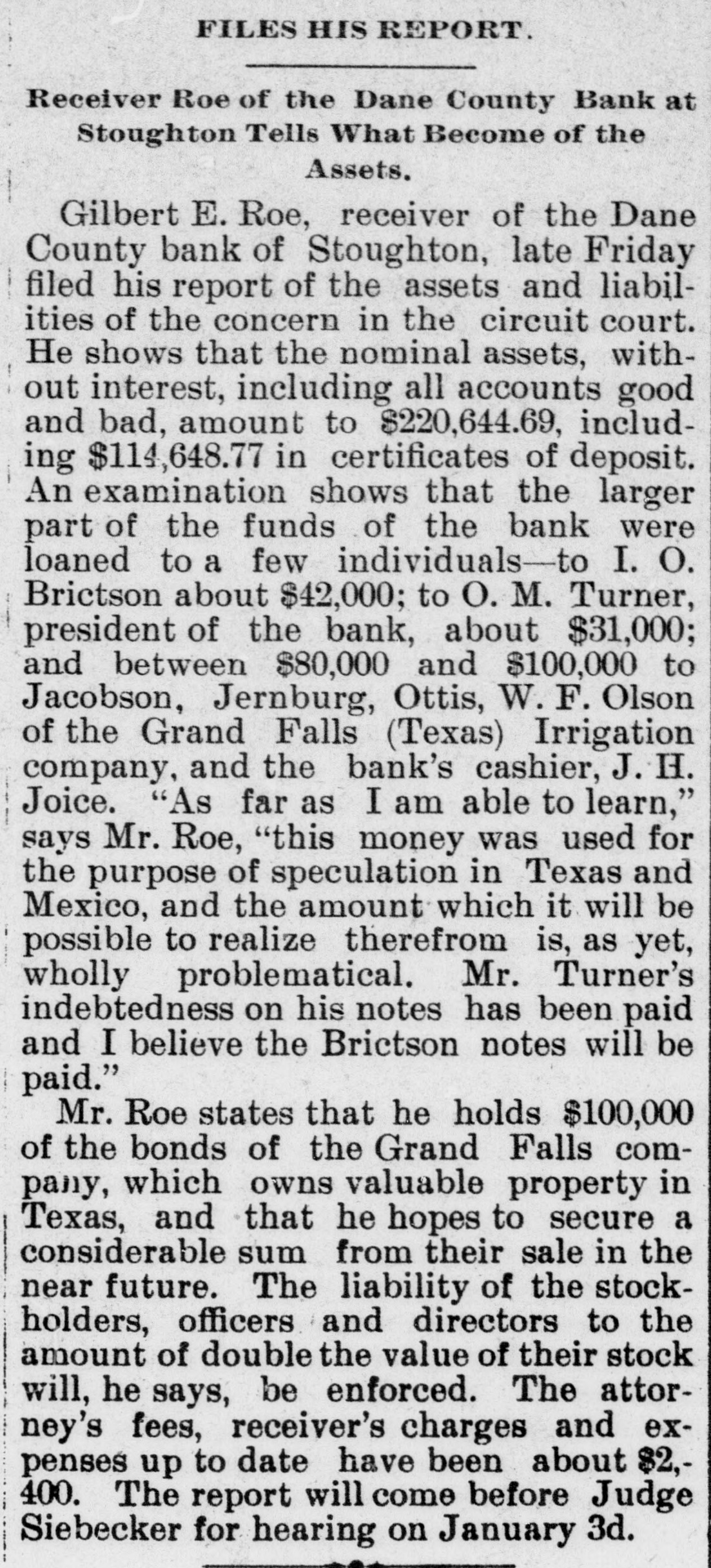 FILES HIS REPORT. Receiver Roe of the Dane County Bank at Stoughton Tells What Become of the Assets. Gilbert E. Roe, receiver of the Dane County bank of Stoughton, late Friday filed his report of the assets and liabilities of the concern in the circuit court. He shows that the nominal assets, without interest, including all accounts good and bad, amount to $220,644.69, including $114,648.77 in certificates of deposit. An examination shows that the larger part of the funds of the bank were loaned to a few individuals-to I. O. Brictson about $42,000; to O. M. Turner, president of the bank, about $31,000; and between $80,000 and $100,000 to Jacobson, Jernburg, Ottis, W. F. Olson of the Grand Falls (Texas) Irrigation company, and the bank's cashier, J. H. Joice. "As far as I am able to learn," says Mr. Roe, "this money was used for the purpose of speculation in Texas and Mexico, and the amount which it will be possible to realize therefrom is, as yet, wholly problematical. Mr. Turner's indebtedness on his notes has been paid and I believe the Brictson notes will be paid." Mr. Roe states that he holds $100,000 of the bonds of the Grand Falls company, which owns valuable property in Texas, and that he hopes to secure a considerable sum from their sale in the near future. The liability of the stockholders, officers and directors to the amount of double the value of their stock will, he says, be enforced. The attorney's fees, receiver's charges and expenses up to date have been about $2,400. The report will come before Judge Siebecker for hearing on January 3d.