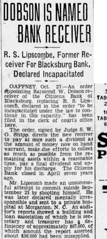 DOBSON IS NAMED BANK RECEIVER R. S. Lipscombe, Former Receiver For Blacksburg Bank, Declared Incapacitated GAFFNEY Oct. order appointing W. Dobson ceiver of the Citizens Bank of Blacksburg. replacing R. S. Lips comb, declared in the order "to be under the law to continue in this capacity has been filed in the clerk of court's office The order. signed by Judge S. W. Shipp. directs the new receiver to pay at once such a dividend as the amount of money now on hand warrant, make due efforts to collect as much as possible from the remaining assets within time, pay final and apply for his discharge The Citizens Bank closed in April seven years ago. Mr. Lipscomb made an unsuccessful to commit suicide September 23 by shooting himself. He was later declared mentally irrreand sent to private hospital at Morganton. N. An auditor's reports showed building and loan association of which he is secretary and treasurer has definiency of approximately $67,000. of which amount the report asserted about $36,000 had been misapplied.