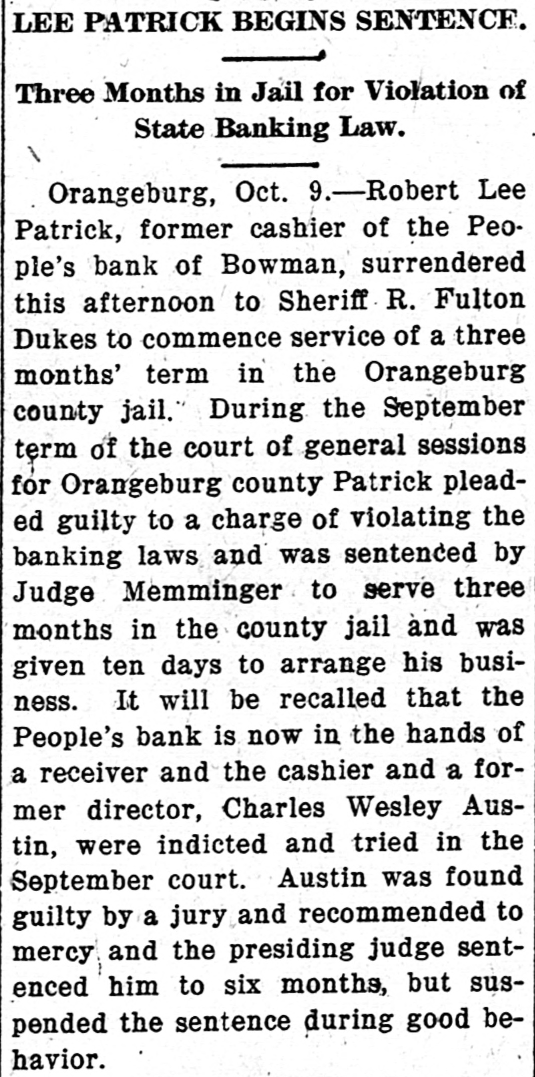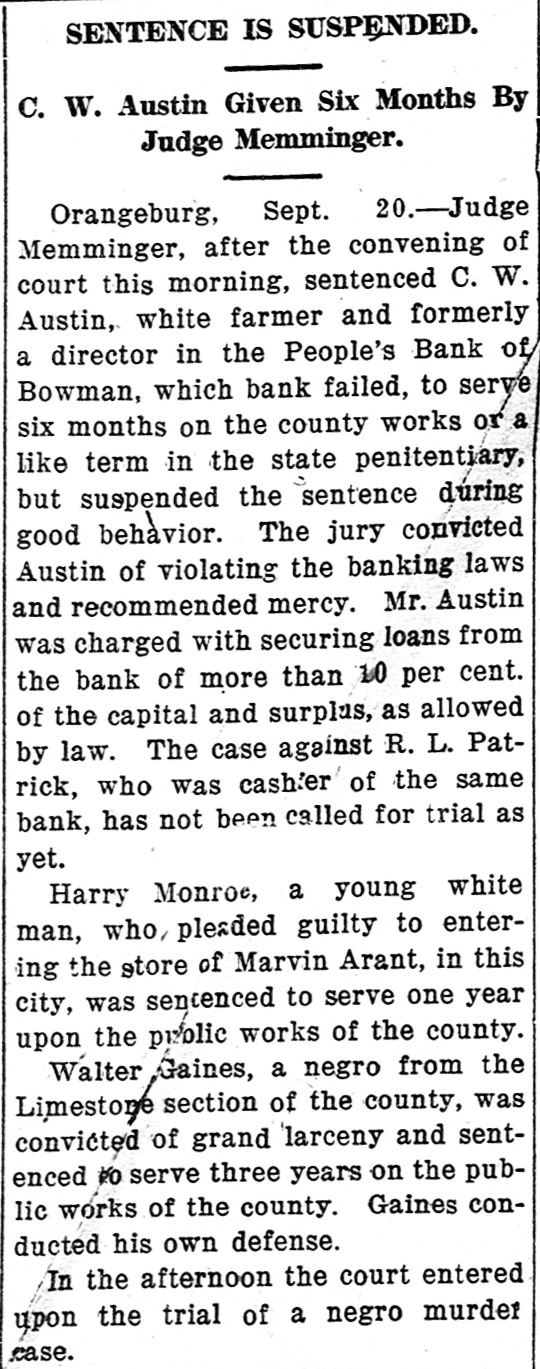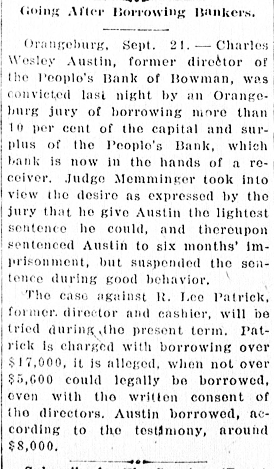 Going After Borrowing Bankers. Orangeburg, Sept. 21. - Charles Wesley Austin, former director of the People's Bank of Bowman, was convicted last night by an Orangeburg jury of borrowing more than 10 per cent of the capital and surplus of the People's Bank, which bank is now in the hands of a receiver. Judge Memminger took into view the desire as expressed by the jury that he give Austin the lightest sentence he could, and thereupon sentenced Austin to six months' imprisonment, but suspended the sentence during good behavior. The case against R. Lee Patrick, former. director and cashier, will be tried during the present term. Patrick is charged with borrowing over $17,000, it is alleged, when not over $5,600 could legally be borrowed, even with the written consent of the directors. Austin borrowed, according to the testimony, around $8,000.