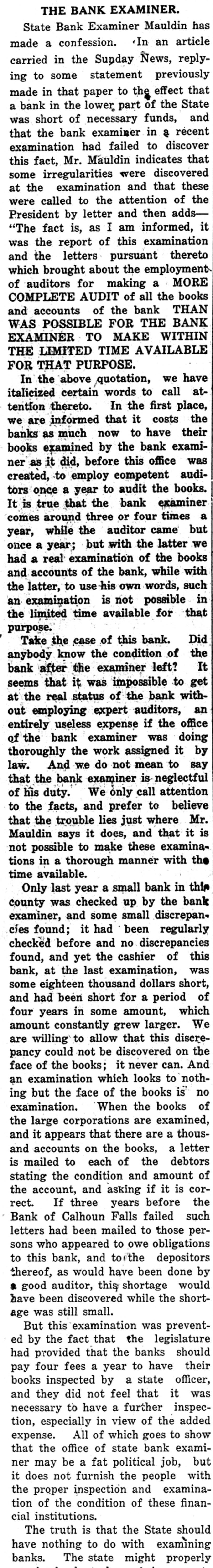 # THE BANK EXAMINER. State Bank Examiner Mauldin has made a confession. In an article carried in the Sunday News, replying to some statement previously made in that paper to the effect that a bank in the lower part of the State was short of necessary funds, and that the bank examiner in a récent examination had failed to discover this fact, Mr. Mauldin indicates that some irregularities were discovered at the examination and that these were called to the attention of the President by letter and then adds-"The fact is, as I am informed, it was the report of this examination and the letters pursuant thereto which brought about the employment of auditors for making a MORE COMPLETE AUDIT of all the books and accounts of the bank THAN WAS POSSIBLE FOR THE BANK EXAMINER TO MAKE WITHIN THE LIMITED TIME AVAILABLE FOR THAT PURPOSE. In the above quotation, we have italicized certain words to call attention thereto. In the first place, we are informed that it costs the banks as much now to have their books examined by the bank examiner as it did, before this office was created, to employ competent auditors once a year to audit the books. It is true that the bank examiner comes around three or four times a year, while the auditor came but once a year; but with the latter we had a real examination of the books and accounts of the bank, while with the latter, to use his own words, such an examination is not possible in the limited time available for that purpose. Take the case of this bank. Did anybody know the condition of the bank after the examiner left? It seems that it was impossible to get at the real status of the bank without employing expert auditors, an entirely useless expense if the office of the bank examiner was doing thoroughly the work assigned it by law. And we do not mean to say that the bank examiner is neglectful of his duty. We only call attention to the facts, and prefer to believe that the trouble lies just where Mr. Mauldin says it does, and that it is not possible to make these examinations in a thorough manner with the time available. Only last year a small bank in this county was checked up by the bank examiner, and some small discrepancies found; it had been regularly checked before and no discrepancies found, and yet the cashier of this bank, at the last examination, was some eighteen thousand dollars short, and had been short for a period of four years in some amount, which amount constantly grew larger. We are willing to allow that this discrepancy could not be discovered on the face of the books; it never can. And an examination which looks to nothing but the face of the books is no examination. When the books of the large corporations are examined, and it appears that there are a thousand accounts on the books, a letter is mailed to each of the debtors stating the condition and amount of the account, and asking if it is correct. If three years before the Bank of Calhoun Falls failed such letters had been mailed to those persons who appeared to owe obligations to this bank, and to the depositors thereof, as would have been done by a good auditor, this shortage would have been discovered while the shortage was still small. But this examination was prevented by the fact that the legislature had provided that the banks should pay four fees a year to have their books inspected by a state officer, and they did not feel that it was necessary to have a further inspection, especially in view of the added expense. All of which goes to show that the office of state bank examiner may be a fat political job, but it does not furnish the people with the proper inspection and examination of the condition of these financial institutions. The truth is that the State should have nothing to do with examining banks. The state might properly
