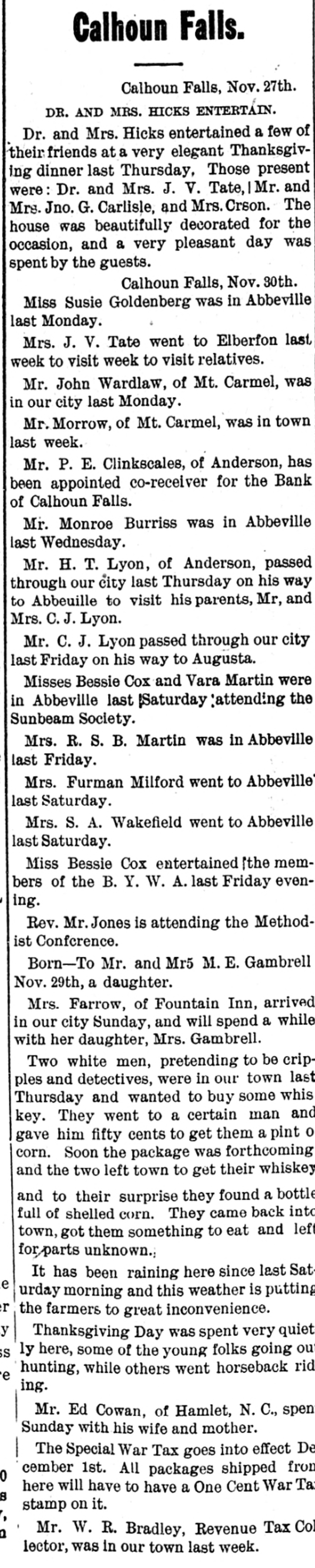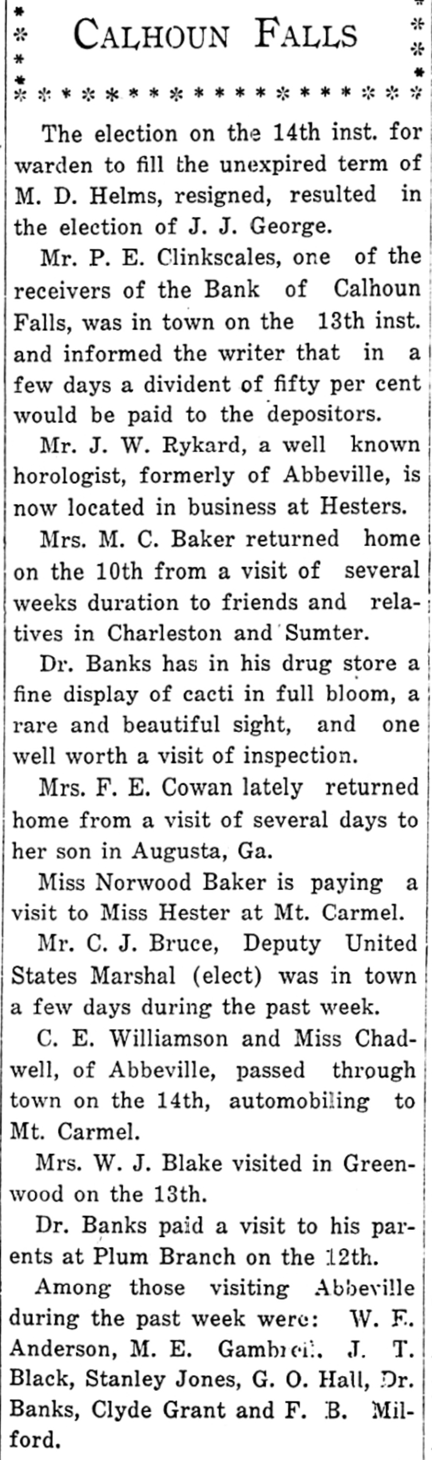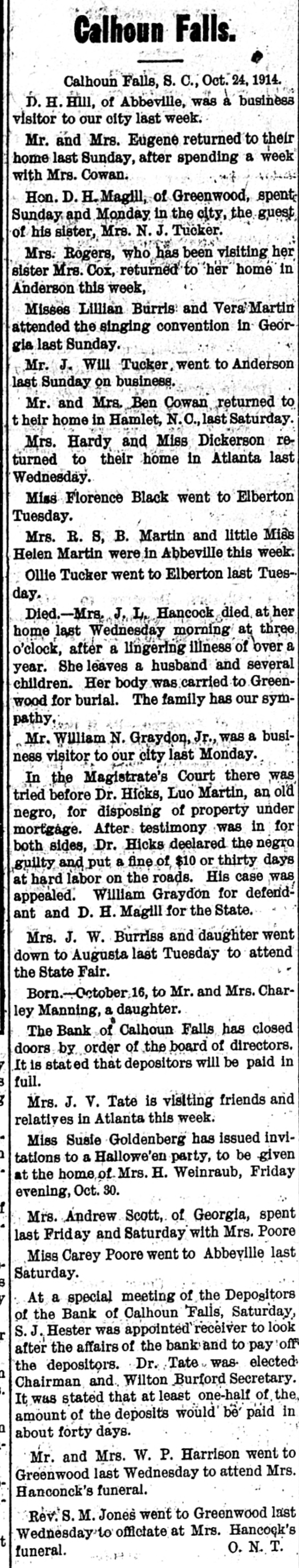 Calhoun Falls. Calhoun Falls, S. C., Oct. 24, 1914. D. H. Hill, of Abbeville, was a business visitor to our city last week. Mr. and Mrs. Eugene returned to their home last Sunday, after spending a week with Mrs. Cowan. Hon. D. H. Magill, of Greenwood, spent Sunday and Monday in the city, the guest of his sister, Mrs. N. J. Tucker. Mrs. Rogers, who has been visiting her sister Mrs. Cox, returned to her home in Anderson this week, Misses Lillian Burris and Vera Martin attended the singing convention in Georgia last Sunday. Mr. J. Will Tucker went to Anderson last Sunday on business. Mr. and Mrs. Ben Cowan returned to t heir home in Hamlet, N. C., last Saturday. Mrs. Hardy and Miss Dickerson returned to their home in Atlanta last Wednesday. Miss Florence Black went to Elberton Tuesday. Mrs. R. S, B. Martin and little Miss Helen Martin were in Abbeville this week. Ollie Tucker went to Elberton last Tuesday. Died.-Mrs. J. L. Hancock died. at her home last Wednesday morning at three o'clock, after a lingering illness of over a year. She leaves a husband and several children. Her body was carried to Greenwood for burial. The family has our sympathy Mr. William N. Graydon, Jr., was a business visitor to our city last Monday. In the Magistrate's Court there was tried before Dr. Hicks, Luo Martin, an old negro, for disposing of property under mortgage. After testimony was in for both sides, Dr. Hicks deelared the negro guilty and put a fine of $10 or thirty days at hard labor on the roads. His case was appealed. William Graydon for defendant and D. H. Magill for the State. Mrs. J. W. Burriss and daughter went down to Augusta last Tuesday to attend the State Fair. Born.-October 16, to Mr. and Mrs. Charley Manning, a daughter. The Bank of Calhoun Falls has closed doors by order of the board of directors. It is stated that depositors will be paid in full. Mrs. J. V. Tate is visiting friends and relatives in Atlanta this week. Miss Susie Goldenberg has issued invitations to a Hallowe'en party, to be given at the home of Mrs. H. Weinraub, Friday evening, Oct. 30. Mrs. Andrew Scott, of Georgia, spent last Friday and Saturday with Mrs. Poore Miss Carey Poore went to Abbeville last Saturday. At a special meeting of the Depositors of the Bank of Calhoun Falls, Saturday, S. J. Hester was appointed receiver to look after the affairs of the bank and to pay off the depositors. Dr. Tate was. elected Chairman and. Wilton Burford Secretary. It was stated that at least one-half of the, amount of the deposits would be paid in about forty days. Mr. and Mrs. W. P. Harrison went to Greenwood last Wednesday to attend Mrs. Hanconck's funeral. Rev. S. M. Jones went to Greenwood last Wednesday to officiate at Mrs. Hancock's 7 O. N. T. funeral.