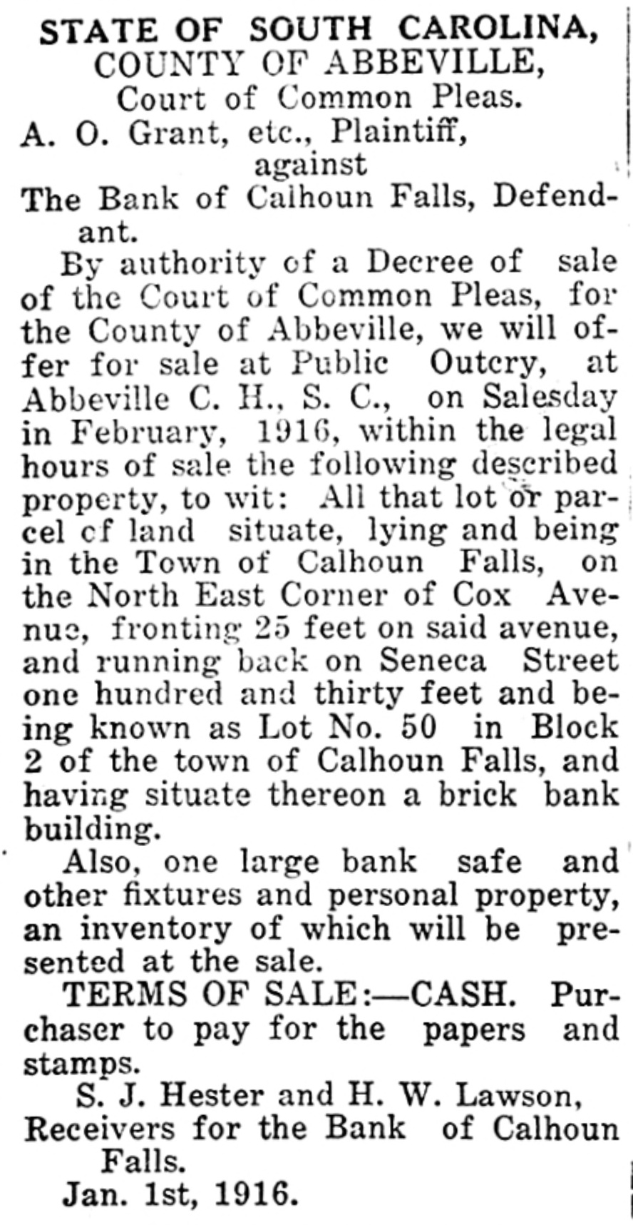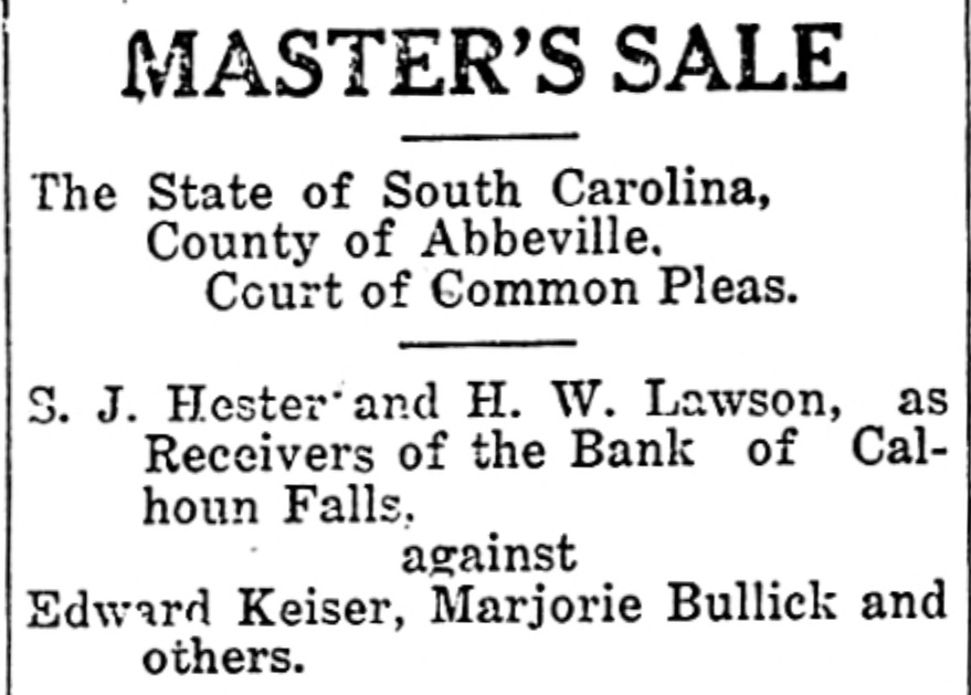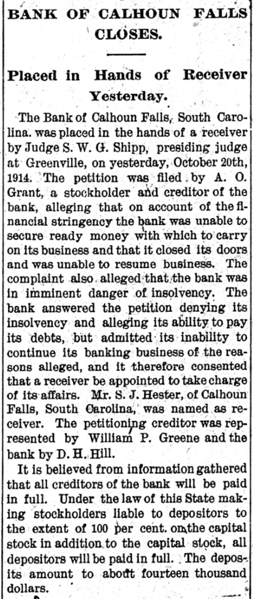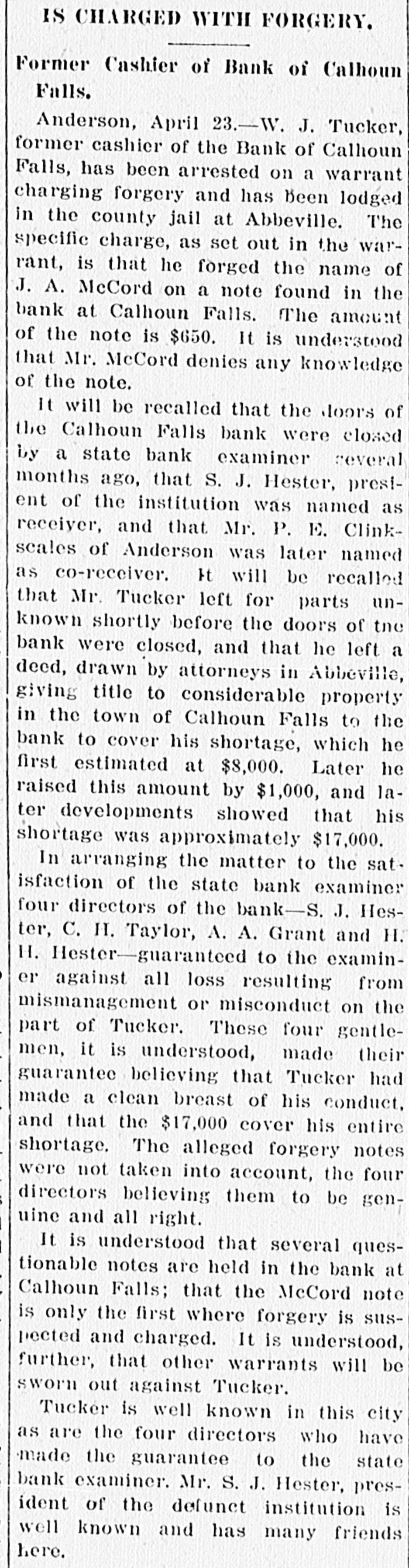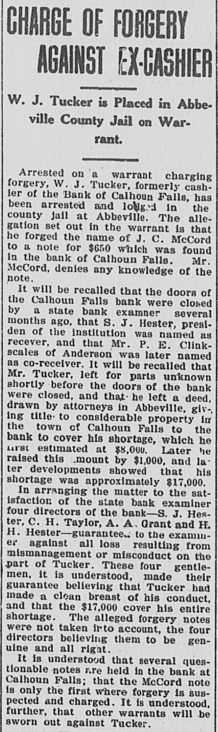 Calhoun Falls. Calhoun Falls, S. C., Oct. 24, 1914. D. H. Hill, of Abbeville, was a business visitor to our city last week. Mr. and Mrs. Eugene returned to their home last Sunday, after spending a week with Mrs. Cowan. Hon. D. H. Magill, of Greenwood, spent Sunday and Monday in the city, the guest of his sister, Mrs. N. J. Tucker. Mrs. Rogers, who has been visiting her sister Mrs. Cox, returned to her home in Anderson this week, Misses Lillian Burris and Vera Martin attended the singing convention in Georgia last Sunday. Mr. J. Will Tucker went to Anderson last Sunday on business. Mr. and Mrs. Ben Cowan returned to t heir home in Hamlet, N. C., last Saturday. Mrs. Hardy and Miss Dickerson returned to their home in Atlanta last Wednesday. Miss Florence Black went to Elberton Tuesday. Mrs. R. S, B. Martin and little Miss Helen Martin were in Abbeville this week. Ollie Tucker went to Elberton last Tuesday. Died.-Mrs. J. L. Hancock died. at her home last Wednesday morning at three o'clock, after a lingering illness of over a year. She leaves a husband and several children. Her body was carried to Greenwood for burial. The family has our sympathy Mr. William N. Graydon, Jr., was a business visitor to our city last Monday. In the Magistrate's Court there was tried before Dr. Hicks, Luo Martin, an old negro, for disposing of property under mortgage. After testimony was in for both sides, Dr. Hicks deelared the negro guilty and put a fine of $10 or thirty days at hard labor on the roads. His case was appealed. William Graydon for defendant and D. H. Magill for the State. Mrs. J. W. Burriss and daughter went down to Augusta last Tuesday to attend the State Fair. Born.-October 16, to Mr. and Mrs. Charley Manning, a daughter. The Bank of Calhoun Falls has closed doors by order of the board of directors. It is stated that depositors will be paid in full. Mrs. J. V. Tate is visiting friends and relatives in Atlanta this week. Miss Susie Goldenberg has issued invitations to a Hallowe'en party, to be given at the home of Mrs. H. Weinraub, Friday evening, Oct. 30. Mrs. Andrew Scott, of Georgia, spent last Friday and Saturday with Mrs. Poore Miss Carey Poore went to Abbeville last Saturday. At a special meeting of the Depositors of the Bank of Calhoun Falls, Saturday, S. J. Hester was appointed receiver to look after the affairs of the bank and to pay off the depositors. Dr. Tate was. elected Chairman and. Wilton Burford Secretary. It was stated that at least one-half of the, amount of the deposits would be paid in about forty days. Mr. and Mrs. W. P. Harrison went to Greenwood last Wednesday to attend Mrs. Hanconck's funeral. Rev. S. M. Jones went to Greenwood last Wednesday to officiate at Mrs. Hancock's 7 O. N. T. funeral.