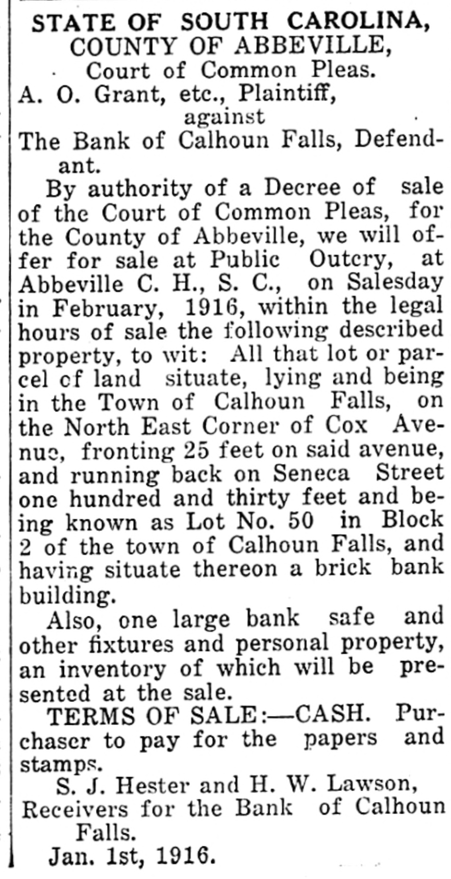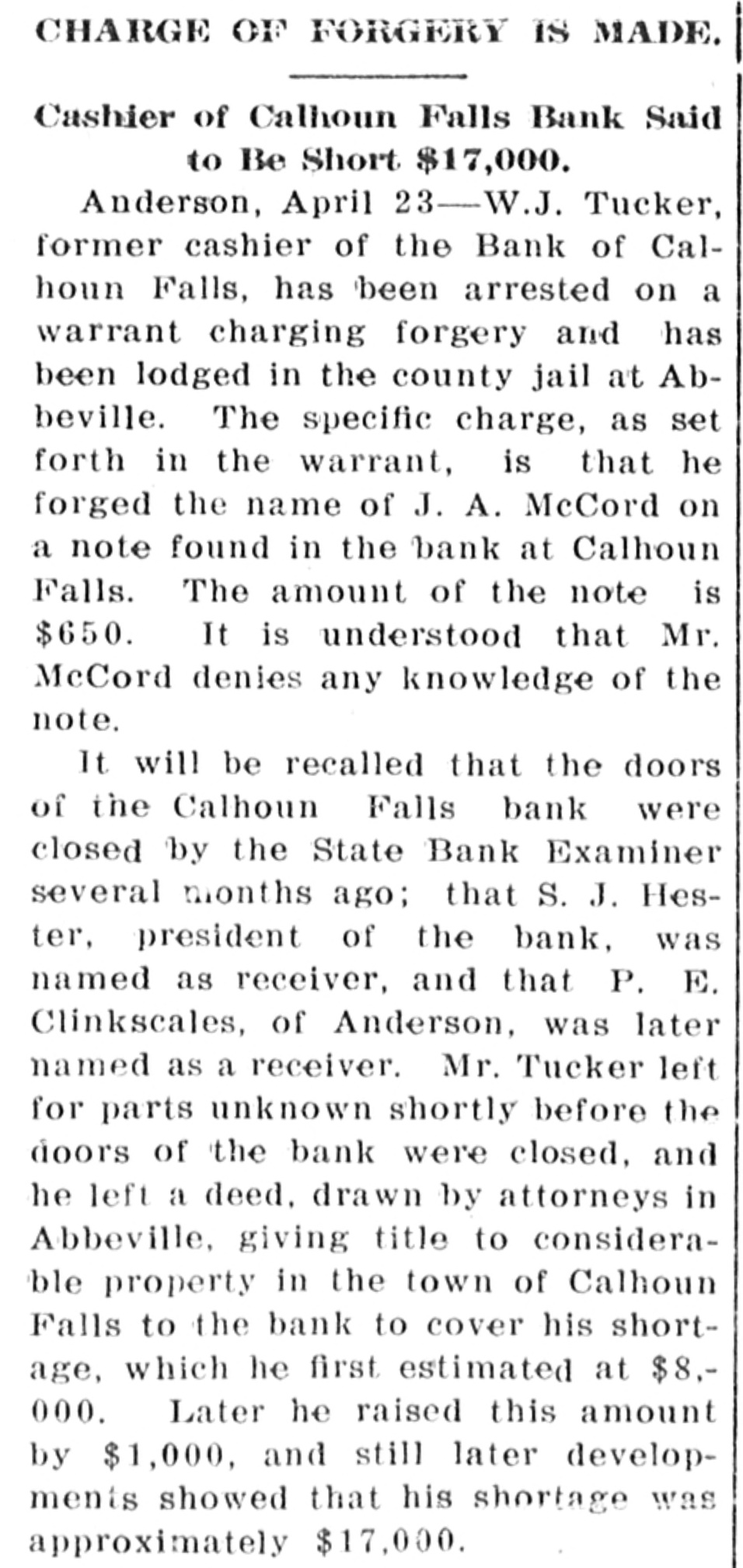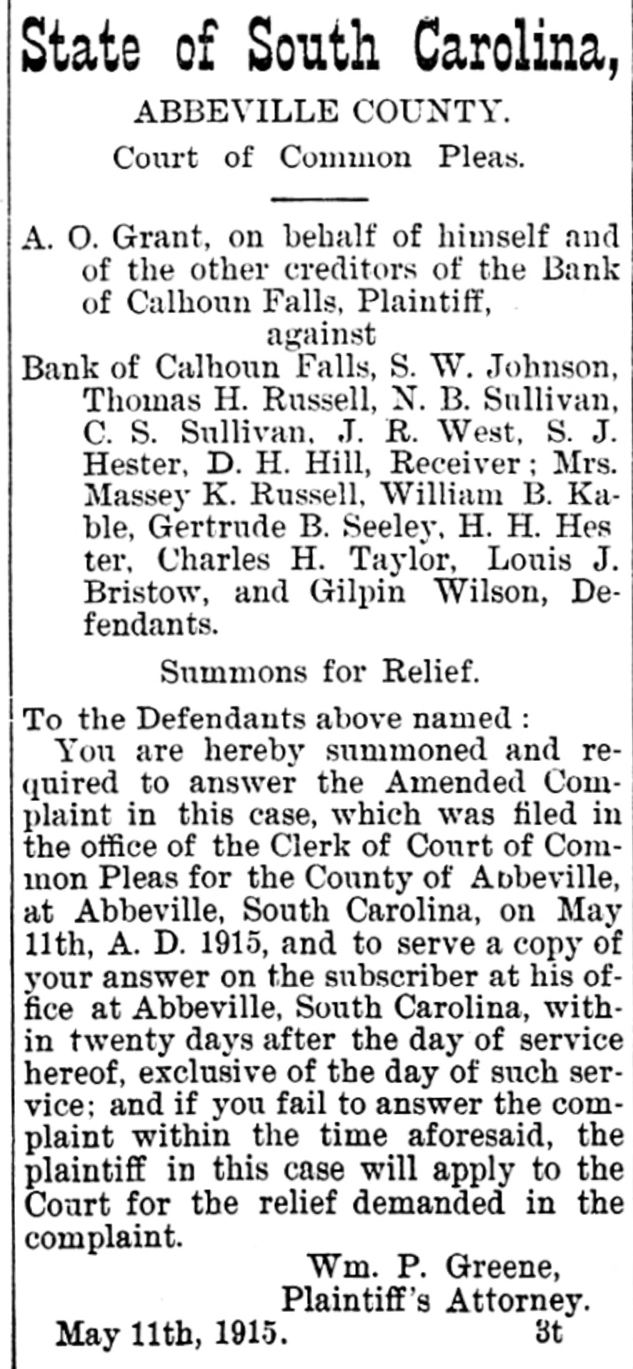 Calhoun Falls. Calhoun Falls, S. C., Oct. 24, 1914. D. H. Hill, of Abbeville, was a business visitor to our city last week. Mr. and Mrs. Eugene returned to their home last Sunday, after spending a week with Mrs. Cowan. Hon. D. H. Magill, of Greenwood, spent Sunday and Monday in the city, the guest of his sister, Mrs. N. J. Tucker. Mrs. Rogers, who has been visiting her sister Mrs. Cox, returned to her home in Anderson this week, Misses Lillian Burris and Vera Martin attended the singing convention in Georgia last Sunday. Mr. J. Will Tucker went to Anderson last Sunday on business. Mr. and Mrs. Ben Cowan returned to t heir home in Hamlet, N. C., last Saturday. Mrs. Hardy and Miss Dickerson returned to their home in Atlanta last Wednesday. Miss Florence Black went to Elberton Tuesday. Mrs. R. S, B. Martin and little Miss Helen Martin were in Abbeville this week. Ollie Tucker went to Elberton last Tuesday. Died.-Mrs. J. L. Hancock died. at her home last Wednesday morning at three o'clock, after a lingering illness of over a year. She leaves a husband and several children. Her body was carried to Greenwood for burial. The family has our sympathy Mr. William N. Graydon, Jr., was a business visitor to our city last Monday. In the Magistrate's Court there was tried before Dr. Hicks, Luo Martin, an old negro, for disposing of property under mortgage. After testimony was in for both sides, Dr. Hicks deelared the negro guilty and put a fine of $10 or thirty days at hard labor on the roads. His case was appealed. William Graydon for defendant and D. H. Magill for the State. Mrs. J. W. Burriss and daughter went down to Augusta last Tuesday to attend the State Fair. Born.-October 16, to Mr. and Mrs. Charley Manning, a daughter. The Bank of Calhoun Falls has closed doors by order of the board of directors. It is stated that depositors will be paid in full. Mrs. J. V. Tate is visiting friends and relatives in Atlanta this week. Miss Susie Goldenberg has issued invitations to a Hallowe'en party, to be given at the home of Mrs. H. Weinraub, Friday evening, Oct. 30. Mrs. Andrew Scott, of Georgia, spent last Friday and Saturday with Mrs. Poore Miss Carey Poore went to Abbeville last Saturday. At a special meeting of the Depositors of the Bank of Calhoun Falls, Saturday, S. J. Hester was appointed receiver to look after the affairs of the bank and to pay off the depositors. Dr. Tate was. elected Chairman and. Wilton Burford Secretary. It was stated that at least one-half of the, amount of the deposits would be paid in about forty days. Mr. and Mrs. W. P. Harrison went to Greenwood last Wednesday to attend Mrs. Hanconck's funeral. Rev. S. M. Jones went to Greenwood last Wednesday to officiate at Mrs. Hancock's 7 O. N. T. funeral.