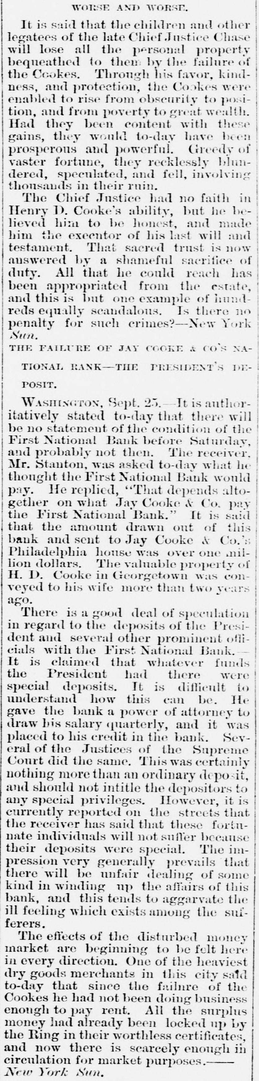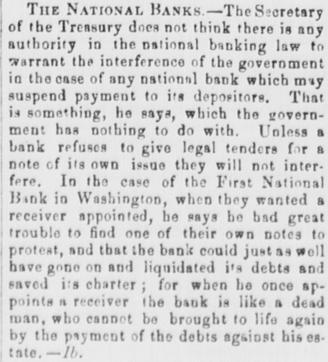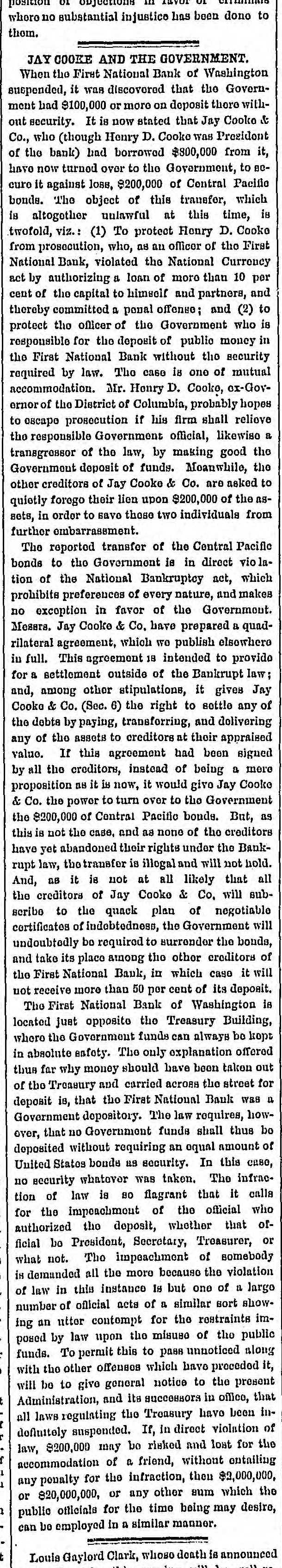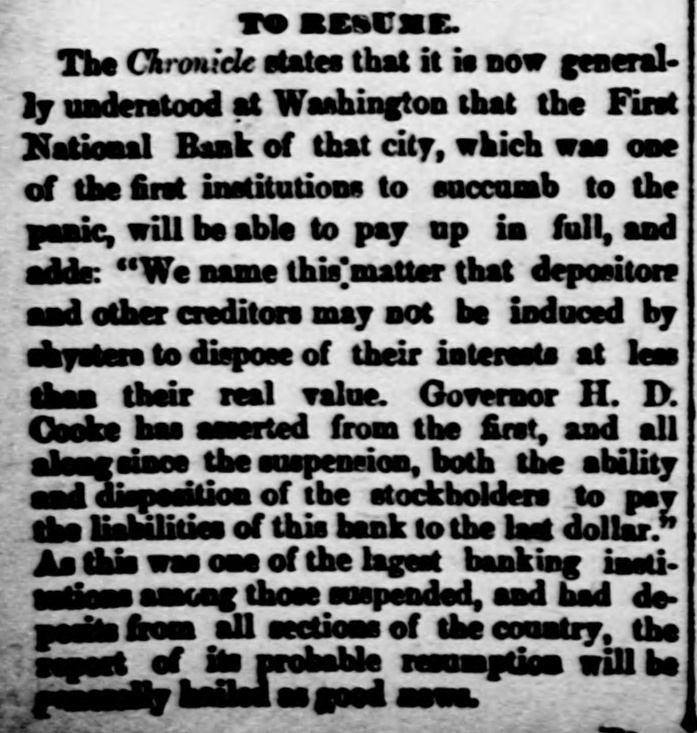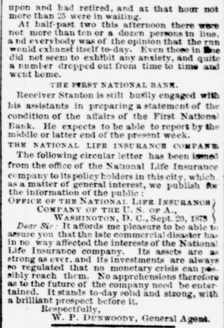 of others, for that institution was more or less complicated by the banking business of Jay Cooke & Co., and the Pacific railroad bonds, with which they are heavily loaded. The other banks of this city invested mostly within this District or in government securities, and are not involved in outside operations. Mr. Davis then stated their deposits to-day had about balanced that of the withdrawals made, and he antictpated no run on their house. Should it come they are abundantly able and ready to meet all demands. He thought depositors would return their money with Mr. Ruff in a few days again, as he could see no cause for alarm. He expressed his belief that the Freedmen's Savings Bank would not suffer much inconvenience, as they had plenty of currency to meet demands. ACTION OF GOV. SHEPHERD. At an early hour to-day Gov. Shepherd, with commendable forethought, anticipating, perhaps, that some of the banks might be run, and cramped for currency. called upon Secretary Richardson and made an arrangement both with him and Treasurer Spinner, to the effect that any bank of the District depositing at the sub-Treasury in New York, and that fact being telegrap hed to Treasurer Spinner, could procure all the currency desired, direct from the Treasury here. This will enable any bank to convert by telegraph any collateral securities they may hold into currency, and furnish abundant means to meet any emergency. AN ADDITIONAL NOTICE. At half-past one o'clock the following was placarded on the doors of the First National bank: Paper maturing this day in the hands of the First National bank may be found at the Metropolitan bank, (next door.") INTERVIEW WITH MR. TENNEY. At two o'clock, THE STAR reporter was admitted to the banking house of Jay Cooke & Co., and was received by Mr. Tenney, when the following conversation ensued: Reporter.-"Mr. Tenney, THE STAR is anxions to inform the public of the latest news concerning the unfortunate suspension of the banks you represent?" Mr. Tenney.-"You may state that all the clerical force of the office is busily engaged in preparing a statement for the public, and that it will be submitted to them as soon as practicable. You may also state that the firm expect in a few days to open their doors and resume business." THE EXCITEMENT OVER. At o'clock 15th street was virtually deserted, and did not present as animated an appearance as usual. There seems to be a growing contidence that all is well, and that the business of the bank will resume at an early period. The run on the Freedmen's Bank, however, continues to some extent, but hourly grows more languid. FIRM AS A ROCK. At half-past two o'clock the reporter of THE STAR called upon Mr. Stickney, of the Freedman's Savings bank. The rush at that hour still continued. He was informed that the bank would keep open until its usual honr-4 p. m.and that up to that hour he (Mr. S.) did not think that thirty thousand dollars would have been drawn. This is owing to the small individual deposits carried by the bank. There 18 a general feeling that the run will subside tomorrow, although the officers are preparing for any contingency. A RECEIVER APPOINTED At half-1 last two o'clock, Edwin L. Stanton, Secretary of the District of Columbia, called upon Controller Knox and accepted the position as receiver of the First National Bank. He will take charge at once.