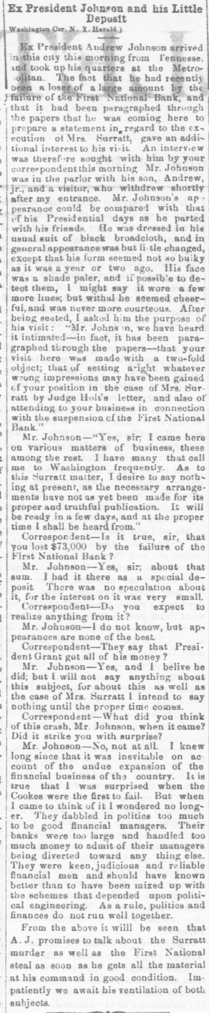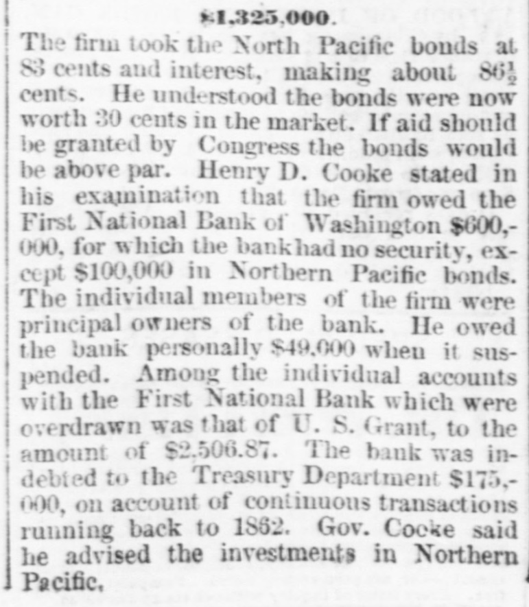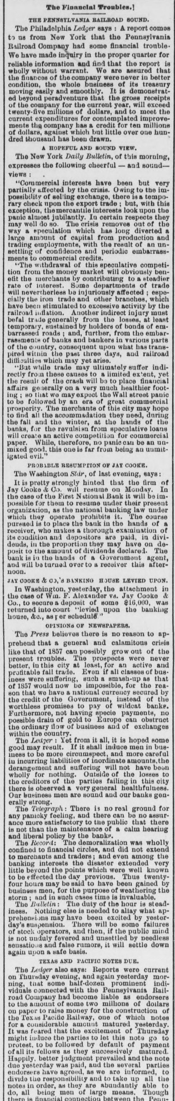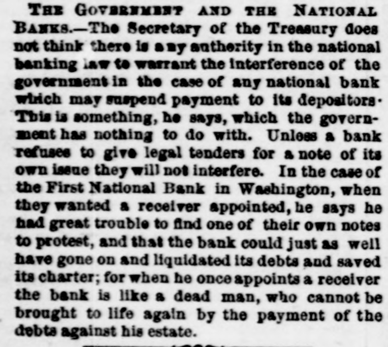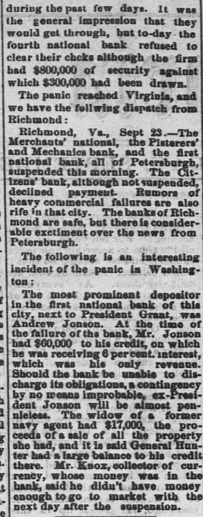 of others, for that institution was more or less complicated by the banking business of Jay Cooke & Co., and the Pacific railroad bonds, with which they are heavily loaded. The other banks of this city invested mostly within this District or in government securities, and are not involved in outside operations. Mr. Davis then stated their deposits to-day had about balanced that of the withdrawals made, and he antictpated no run on their house. Should it come they are abundantly able and ready to meet all demands. He thought depositors would return their money with Mr. Ruff in a few days again, as he could see no cause for alarm. He expressed his belief that the Freedmen's Savings Bank would not suffer much inconvenience, as they had plenty of currency to meet demands. ACTION OF GOV. SHEPHERD. At an early hour to-day Gov. Shepherd, with commendable forethought, anticipating, perhaps, that some of the banks might be run, and cramped for currency. called upon Secretary Richardson and made an arrangement both with him and Treasurer Spinner, to the effect that any bank of the District depositing at the sub-Treasury in New York, and that fact being telegrap hed to Treasurer Spinner, could procure all the currency desired, direct from the Treasury here. This will enable any bank to convert by telegraph any collateral securities they may hold into currency, and furnish abundant means to meet any emergency. AN ADDITIONAL NOTICE. At half-past one o'clock the following was placarded on the doors of the First National bank: Paper maturing this day in the hands of the First National bank may be found at the Metropolitan bank, (next door.") INTERVIEW WITH MR. TENNEY. At two o'clock, THE STAR reporter was admitted to the banking house of Jay Cooke & Co., and was received by Mr. Tenney, when the following conversation ensued: Reporter.-"Mr. Tenney, THE STAR is anxions to inform the public of the latest news concerning the unfortunate suspension of the banks you represent?" Mr. Tenney.-"You may state that all the clerical force of the office is busily engaged in preparing a statement for the public, and that it will be submitted to them as soon as practicable. You may also state that the firm expect in a few days to open their doors and resume business." THE EXCITEMENT OVER. At o'clock 15th street was virtually deserted, and did not present as animated an appearance as usual. There seems to be a growing contidence that all is well, and that the business of the bank will resume at an early period. The run on the Freedmen's Bank, however, continues to some extent, but hourly grows more languid. FIRM AS A ROCK. At half-past two o'clock the reporter of THE STAR called upon Mr. Stickney, of the Freedman's Savings bank. The rush at that hour still continued. He was informed that the bank would keep open until its usual honr-4 p. m.and that up to that hour he (Mr. S.) did not think that thirty thousand dollars would have been drawn. This is owing to the small individual deposits carried by the bank. There 18 a general feeling that the run will subside tomorrow, although the officers are preparing for any contingency. A RECEIVER APPOINTED At half-1 last two o'clock, Edwin L. Stanton, Secretary of the District of Columbia, called upon Controller Knox and accepted the position as receiver of the First National Bank. He will take charge at once.