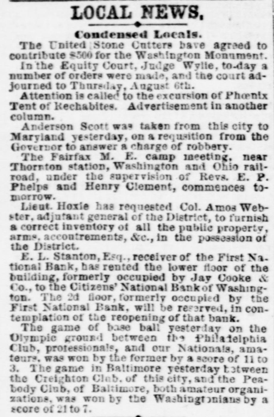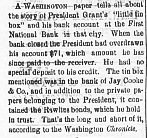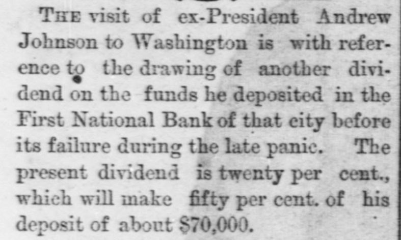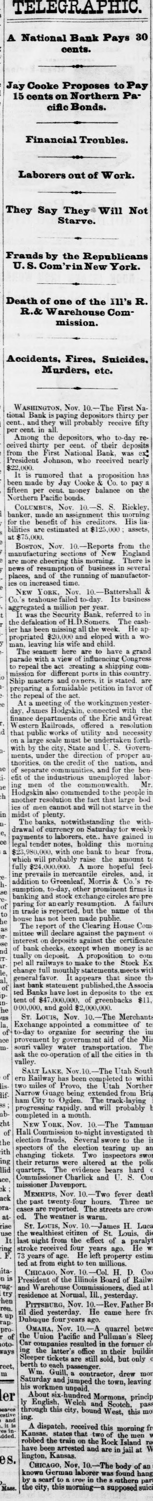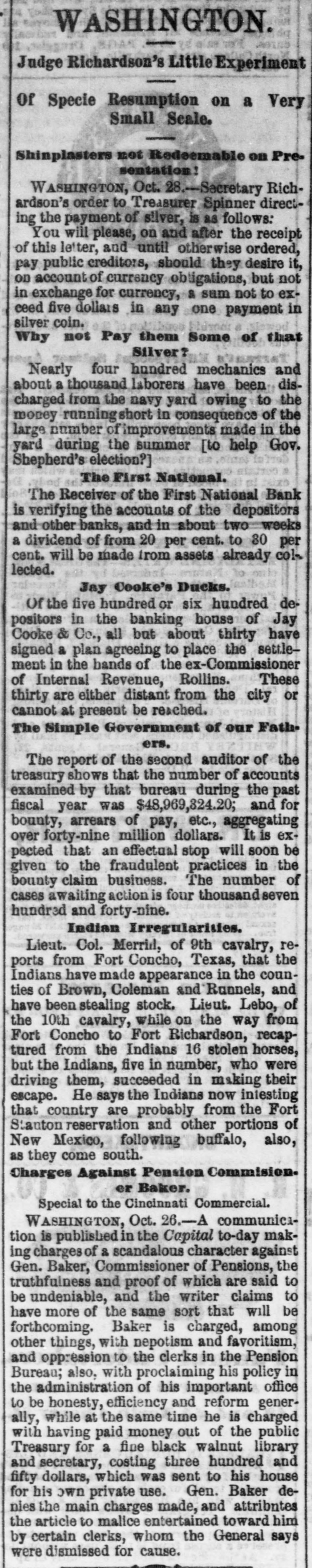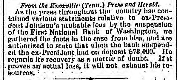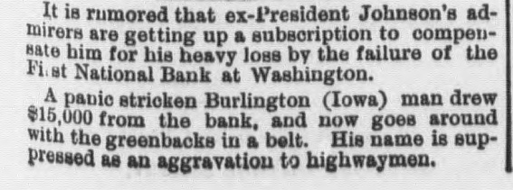 of others, for that institution was more or less complicated by the banking business of Jay Cooke & Co., and the Pacific railroad bonds, with which they are heavily loaded. The other banks of this city invested mostly within this District or in government securities, and are not involved in outside operations. Mr. Davis then stated their deposits to-day had about balanced that of the withdrawals made, and he antictpated no run on their house. Should it come they are abundantly able and ready to meet all demands. He thought depositors would return their money with Mr. Ruff in a few days again, as he could see no cause for alarm. He expressed his belief that the Freedmen's Savings Bank would not suffer much inconvenience, as they had plenty of currency to meet demands. ACTION OF GOV. SHEPHERD. At an early hour to-day Gov. Shepherd, with commendable forethought, anticipating, perhaps, that some of the banks might be run, and cramped for currency. called upon Secretary Richardson and made an arrangement both with him and Treasurer Spinner, to the effect that any bank of the District depositing at the sub-Treasury in New York, and that fact being telegrap hed to Treasurer Spinner, could procure all the currency desired, direct from the Treasury here. This will enable any bank to convert by telegraph any collateral securities they may hold into currency, and furnish abundant means to meet any emergency. AN ADDITIONAL NOTICE. At half-past one o'clock the following was placarded on the doors of the First National bank: Paper maturing this day in the hands of the First National bank may be found at the Metropolitan bank, (next door.") INTERVIEW WITH MR. TENNEY. At two o'clock, THE STAR reporter was admitted to the banking house of Jay Cooke & Co., and was received by Mr. Tenney, when the following conversation ensued: Reporter.-"Mr. Tenney, THE STAR is anxions to inform the public of the latest news concerning the unfortunate suspension of the banks you represent?" Mr. Tenney.-"You may state that all the clerical force of the office is busily engaged in preparing a statement for the public, and that it will be submitted to them as soon as practicable. You may also state that the firm expect in a few days to open their doors and resume business." THE EXCITEMENT OVER. At o'clock 15th street was virtually deserted, and did not present as animated an appearance as usual. There seems to be a growing contidence that all is well, and that the business of the bank will resume at an early period. The run on the Freedmen's Bank, however, continues to some extent, but hourly grows more languid. FIRM AS A ROCK. At half-past two o'clock the reporter of THE STAR called upon Mr. Stickney, of the Freedman's Savings bank. The rush at that hour still continued. He was informed that the bank would keep open until its usual honr-4 p. m.and that up to that hour he (Mr. S.) did not think that thirty thousand dollars would have been drawn. This is owing to the small individual deposits carried by the bank. There 18 a general feeling that the run will subside tomorrow, although the officers are preparing for any contingency. A RECEIVER APPOINTED At half-1 last two o'clock, Edwin L. Stanton, Secretary of the District of Columbia, called upon Controller Knox and accepted the position as receiver of the First National Bank. He will take charge at once.