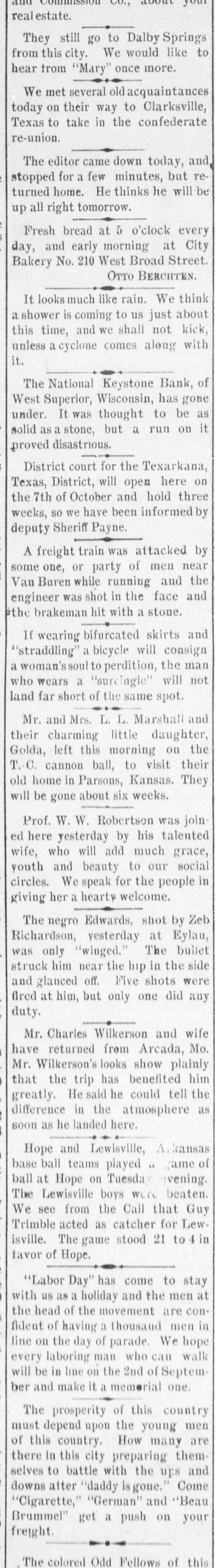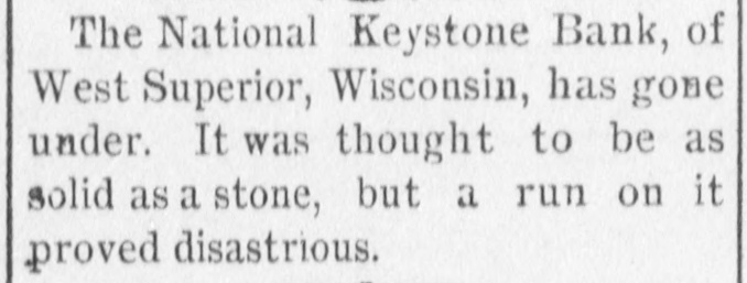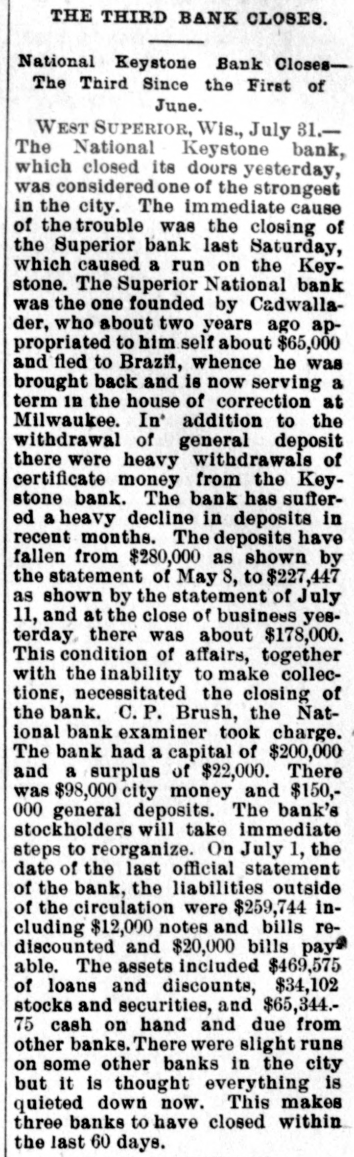 THE THIRD BANK CLOSES. National Keystone Bank Closesβ The Third Since the First of June. WEST SUPERIOR, Wis., July 31.The National Keystone bank, which closed its doors yesterday, was considered one of the strongest in the city. The immediate cause of the trouble was the closing of the Superior bank last Saturday, which caused a run on the Keystone. The Superior National bank was the one founded by Cadwallader, who about two years ago appropriated to him self about $65,000 and fled to Brazil, whence he was brought back and is now serving a term in the house of correction at Milwaukee. In addition to the withdrawal of general deposit there were heavy withdrawals of certificate money from the Keystone bank. The bank has suffered a heavy decline in deposits in recent months. The deposits have fallen from $280,000 as shown by the statement of May 8, to $227,447 as shown by the statement of July 11, and at the close of business yesterday there was about $178,000. This condition of affairs, together with the inability to make collections, necessitated the closing of the bank. C.P. Brush, the National bank examiner took charge. The bank had a capital of $200,000 and a surplus of $22,000. There was $98,000 city money and $150,000 general deposits. The bank's stockholders will take immediate steps to reorganize. On July 1, the date of the last official statement of the bank, the liabilities outside of the circulation were $259,744 including $12,000 notes and bills rediscounted and $20,000 bills pay able. The assets included $469,575 of loans and discounts, $34,102 stocks and securities, and $65,344.75 cash on hand and due from other banks. There were slight runs on some other banks in the city but it is thought everything is quieted down now. This makes three banks to have closed within the last 60 days.