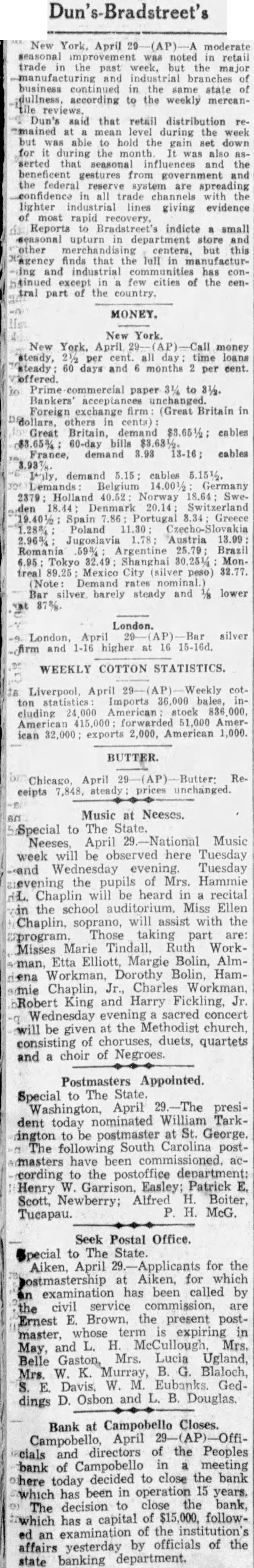 Dun's-Bradstreet's New April 29 moderate was noted trade past and business continued in state according the Dun's said that retail distribution the week but was able hold gain down for during the also and gestures from and the are trade the lighter giving most rapid indicte small but this agency finds that the lull in manufacturand has few of tral part the MONEY. New New York. April money per time steady 60 and months per cent. Foreign exchange firm Britain in others Great demand cables 65% 60-day cables demand cables 2379 Holland 40.52: 8.34 Greece Poland 2.96% Austria Brazil 6.95 Tokyo Shanghai Mexico peso) rates Bar silver barely steady and lower London, silver at WEEKLY COTTON STATISTICS. cluding stock American 51,000 ican exports American Music at Neeses. Special to The Neeses, April Music week will be here Tuesday Wednesday evening. Tuesday the pupils of Mrs. Hammie Chaplin will heard recital in the school auditorium. Miss Ellen Chaplin, soprano, will assist with the are: Misses man, Etta Margie Bolin, Almena Workman, Dorothy Bolin. HamChaplin, Charles Robert King and Harry Fickling, Jr Wednesday sacred will be given at the Methodist church, consisting of choruses, duets, quartets and choir of Negroes Postmasters Appointed. Special The State. Washington, April 29.-The president nominated Tark. ington to be postmaster at St. George. The South Carolina postmasters have been commissioned. according the department: Henry Easley: Patrick E. Scott, Newberry; Alfred Boiter, Tucapau. H. McG. Seek Postal Office. Special to The State Aiken, April 29. Applicants for the ostmastership at Aiken, for which has been called by the service are civil Ernest E. Brown. the present postin and L. H. McCullough Mrs. Gaston, Mrs. Lucia Ugland, W. Murray, B. G. Blaloch, K. W. Eubanks. Geddings D. Osbon and L. B. Douglas. Bank at Campobello Closes cials and directors of the Peoples bank of Campobello in meeting today decided to close the bank which has been in years. decision to the bank, which has capital of $15,000. followof the institution's an by officials of the affairs yesterday banking department.
