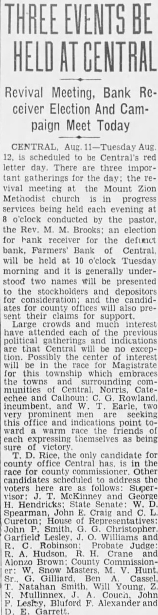 Revival Meeting, Bank Receiver Election And Campaign Meet Today CENTRAL Aug Aug. 12, scheduled to be Central's red letter day. There are three important gatherings for the day: the revival meeting the Mount Zion Methodist church progress services being held each evening at o'clock conducted by the pastor. the Rev. M. M. Brooks: an election for bank receiver for the defunct bank, Farmers' Bank of Central will be held at 10 o'clock Tuesday and generally understood names will be presented stockholders and depositors for consideration; candidates for county will pretheir claims much interest have attended each of the previous political gatherings and are that Central will be no excepPossibly the center interest be the race for Magistrate for this township which embraces towns comechee and Calhoun: Earle, prominent men seeking this and indications point ward warm friends each expressing themselves as being sure victory Rice, only candidate for county office has. is in the race for Other to the voters Supervisor: and George Hendricks: State Senate: Spearman, John Craig and Cureton: House John Christopher Garfield Lesley, Probate Judge Crane and Alonzo Brown County Snow Masters M Hunt Cassel Natahan Smith. Will Young John Bluford Alexander and
