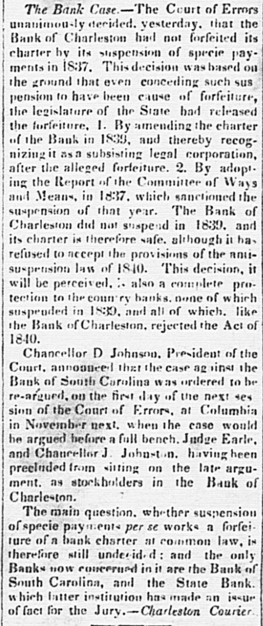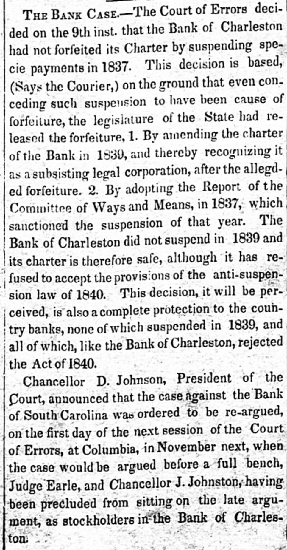 The termination of the charter of the United States Bank, furnished the excuse for chartering new banks; and what was the result? Why, in the place of a Branch of the United States Bank in Charleston, with a capital of one million of dollars, the Legislature chartered the Banks of Charleston, Cheraw, Camden, Columbia, Hamburg, Georgetown, and the great Rail Road Bank; with an increase of Bank Capital in the State of some twenty millions of dollars!