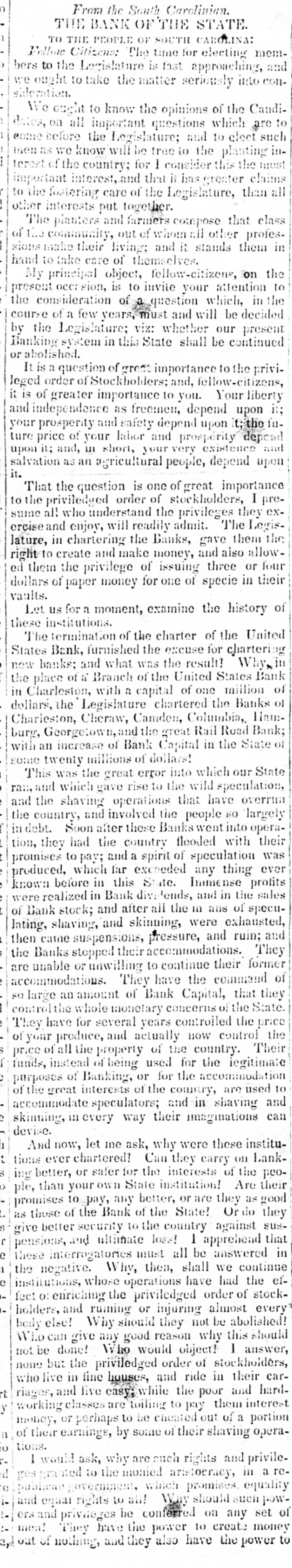 That the question is one of great importance to the priviledged order of stockholders, I presume all who understand the privileges they exercise and enjoy, will readily admit. The Legislature, in chartering the Banks, gave them the right to create and make money, and also allowed them the privilege of issuing three or four dollars of paper money for one of specie in their vaults.