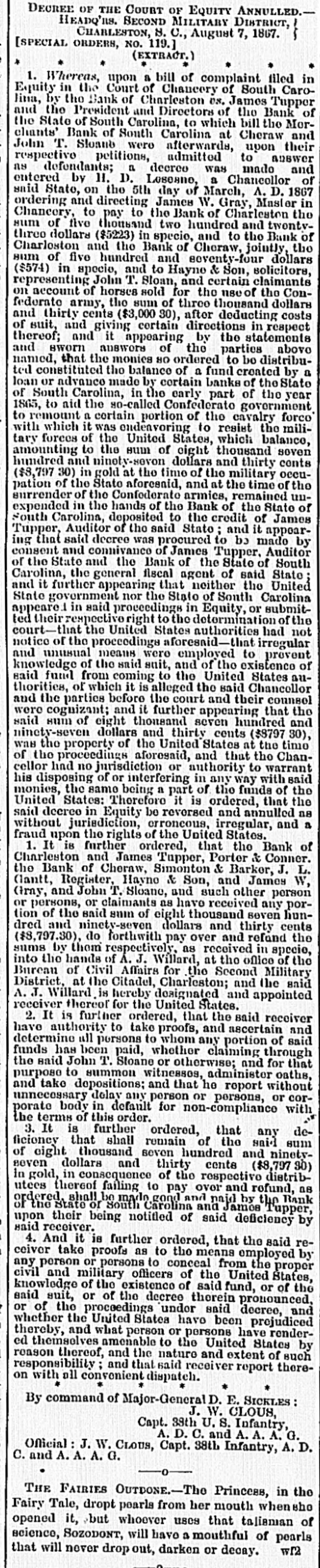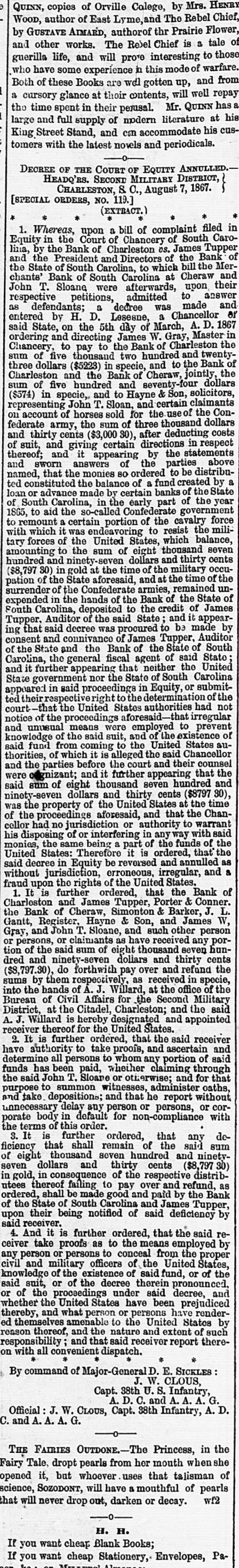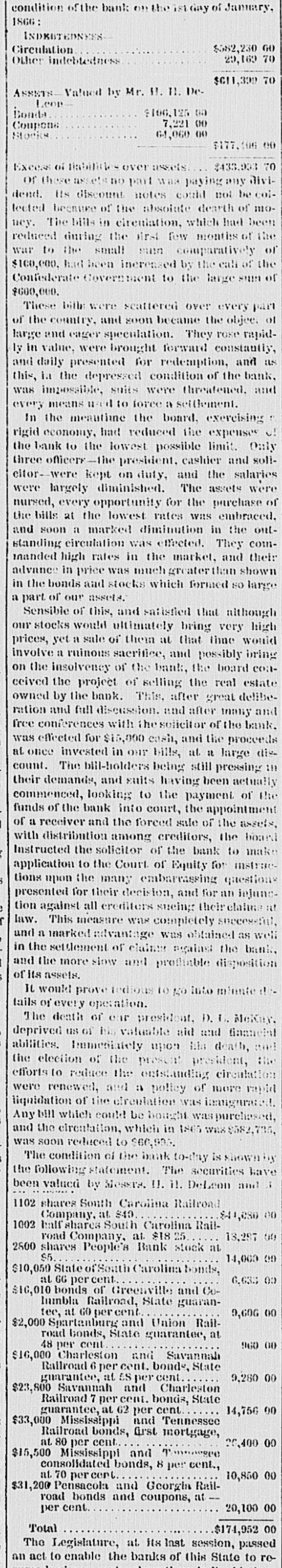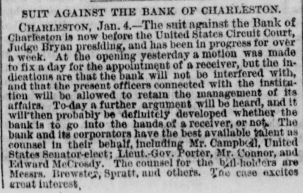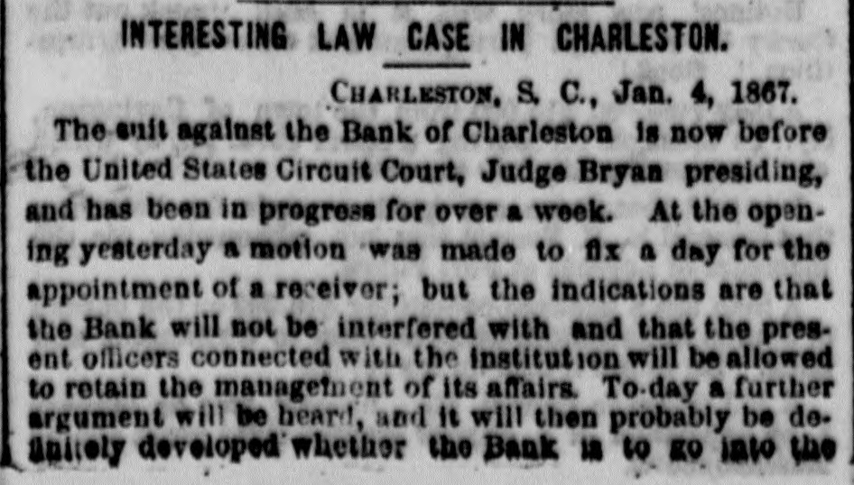 Circuit Court of the United States. IN EQUITY. Hugh McRea, James Bankhead, and George Learight. citizeus of Nashville, Tennessee, VS. Bank of Charleston, South Carolina, Charles T. Lowudes, George A. Trenholm, Heury Gourdin, Alexander Robertson and Win. Thayer, citizens of Charleston, South Carolina. Bill for Injunction, Discovery and Relief. Brewster And Spratt, Solicitors for Complainants. The above Bill has been filed in behalf of Complainants and all others not citizens of South Carolina who are creditors of the Bank of Charleston. The Bill alleges that the Bank of Charleston was incorporated with a capital of two million dollars, with leave to increase the same two millions more, and afterwards modified by an Act ratified ou the 20th December, 1853, to be continued until the year 1877. The bank, it is alleged, has currency out to the amount of two million dollars and two million more on deposit for which certificates of deposit have been given. The Bank suspended payment of gold and silver on said notes and bills issued in accordance with its charter on the 10th of April, 1861, and since have refused to pay specie for said currency and deposits. The Bill further says that the purpose of South Carolina in granting the charter was to furnish to the citizens of the State its promissory notes and bills of credit in the nature of a circulating medium, and its certificates the representatives of and silver current coin, gold for funds deposited and that the nocomplishment of this policy and public purpose constituted the trust and condition of the charter; that the Bank having failed to redoem its promises. the assets are in the hands of the officers and directors as a trust fund. Various other allegations are made of breach of charter, and that the officers have continued to keep up the semblance of a banking corporation. It is further alleged that they extend to the stockholders information as to the condition of their assets, which they carefully cxclude from the complainants. It is further alleged that these parties hold what remained of the assets, consisting of coin to the value of thirty thousand dollars, real estate, notes, bonds, stock and domestic and foreign exchange, to the value of seven bundred thousand dollars, which assets, it is alleged, are withheld from the creditors, and applied to the uses of the stockholders. Another allegation in the Bill is, that the stockholders at the date of the failure, and those who were so within twelve months prior thereto, are liable to the creditors, by the provisions of the charter, for a sum not exceeding twice the amount of their shares. The Bill alleges that many of the Stockholders have transferred their shares to irresponsible persons, and hope, through such transfer, to escape liability. The Bill craves relief, and also the appointment of receivers, also to make the stockholders liable. As this is a matter of great public interest, we propose publishing a copy of the Bill.Governor Orr has convened a special meeting of the Legislature, and it may bc important that that body should take action on the subject. It is believed by our ablest lawyers that the clause of the charter making stockholders liable is a penalty, and does not create liability to creditors. For the support of this position the fact is relied upon that the clause above alluded to does not say expressly to whom the stockholders are liable in case of failure. At the last session of the Legislature a Bill for the relief of stockholders was brought forward in the Senato by Henry Buist. It was then thought by the stockholders the Bill would have been passed, and ought to have been passed, as it WHB evidently the design of the Act of Incorporation to make stockholders liable only in case of improper conduct on the part of the directors. If the Legislature does not interfere and repeal the penalty, or the Court should decide that the clause is not a penalty, but in the nature of a contract with billholdors and depositors, the change of property consequent in either of such cases will be such as to involve in ruin those who have saved some remnant of property from the dovustation of the civil war and convulsion through which the State has passed since 1860. We understand that this 3080 cannot be heard until the fourth Monday in November next at Columbia, S.C., unless a special Cirouit Court shall be convened to hear equity cases. If the case is no: heard in November