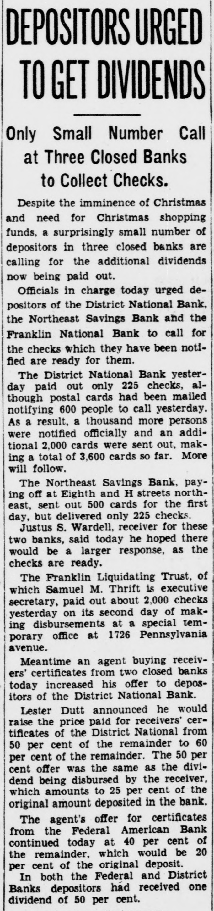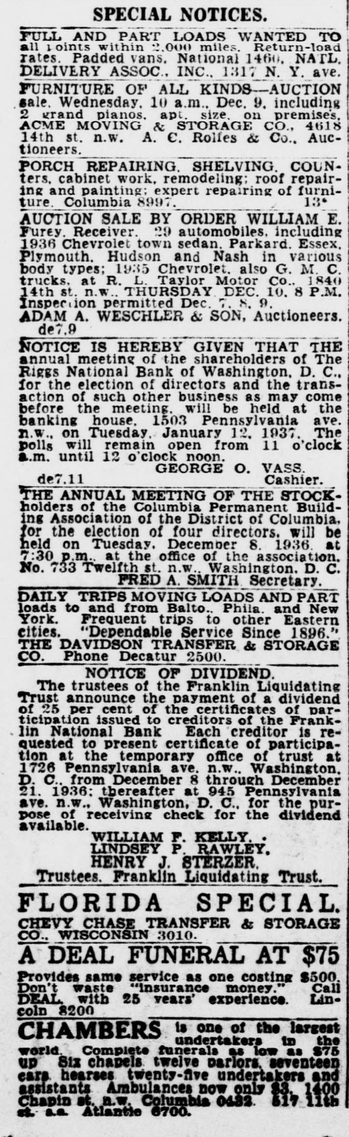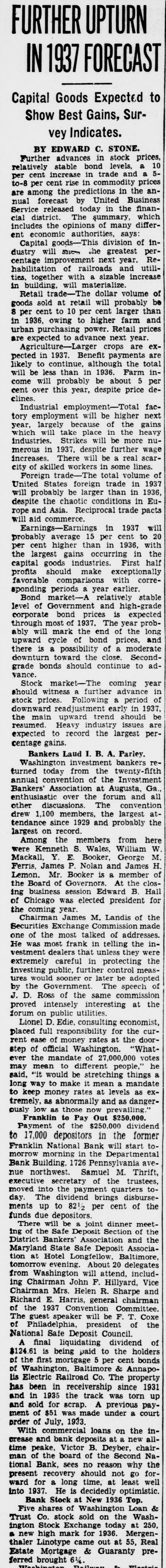IN 1937 FORECAST Capital Goods Expected to Show Best Gains, Survey Indicates. BY EDWARD C. STONE. Further advances in stock prices, 10 relatively stable bond levels. a per cent increase in trade and a 5. to-8 per cent rise in commodity prices are among the predictions in the annual forecast by United Business Service released today in the financial district. The summary which includes the opinions of many different economic authorities, says Capital goods- This division of industry will SHO the greatest percentage improvement next year Rehabilitation of railroads and utilities. together with sizable increase in building. will materialize Retail trade-The dollar volume of goods sold at retail will probably be 8 per cent to 10 per cent larger than in 1936 owing to higher farm and urban purchasing power Retail prices are expected to advance next year Agriculture- Larger crops are expected in 1937. Benefit payments are likely to continue. although the total will be less than in 1936 Farm income will probably be about 5 per cent over this year, despite price declines. Industrial employment-Total factory employment will be higher next year largely because of the gains which will take place in the heavy industries. Strikes will be more numerous in 1937, despite further wage increases. There will be real scar. city of skilled workers in some lines. Foreign trade- total volume of United States foreign trade in 1937 will probably be larger than in 1936 despite the chaotic conditions in Europe and Asia. Reciprocal trade pacts will aid commerce Earnings- Earnings in 1937 will probably average 15 per cent to 20 per cent higher than in 1936, with the largest gains occurring in the capital goods industries First half profits should make exceptionally favorable comparisons with corresponding periods a year earlier Bond market-A relatively stable level of Government and high-grade corporate bond prices is expected through most of 1937. The year probably will mark the end of the long upward cycle of bond prices and there is possibility of a moderate downturn toward the close Secondgrade bonds should continue to advance. Stock market-The coming year should witness further advance stock prices Following a period of downward readjustment early in 1937 the main upward trend should be resumed Heavy industry issues are expected to record the largest percentage gains. Bankers Laud I. B. A. Parley Washington investment bankers returned today from the twenty-fifth annual convention of the Investment Bankers' Association at Augusta Ga enthusiastic over the forum and all other discussions. The convention drew 1,100 members, the largest attendance since 1929 and probably the largest on record Among the members from here were Kenneth S Wales. William W Mackall, E Booker George M Ferris. James P Nolan and James H Lemon Mr Booker is a member of the Board of Governors At the closing business session Edward B Hall of Chicago was elected president for the coming year Chairman James M. Landis of the Securities Exchange Commission made one of the most talked of addresses He was most frank in telling the investment dealers that unless they were extremely careful in protecting the investing public, further control measures would sooner or later be adopted by the Government The speech of J. D Ross of the same commission proved intensely interesting at the forum on public utilities. Lionel D Edie. consulting economist. placed full responsibility for the current ease of money rates at the doorstep of official Washington 'Whatever the mandate of 27.000. 000 votes may mean to different people, he said, "it would be stretching things a long way to make it mean mandate to keep money rates at levels as extremely as abnormally and as dangerously low as those now prevailing. Franklin to Pay Out $250.000. Payment of the $250,000 dividend to 17.000 depositors in the former Franklin National Bank will start to morrow morning in the Departmental Bank Building, 1726 Pennsylvania avenue northwest Samuel M Thrift executive secretary of the trustees moved into the payment quarters to day The dividend brings disbursements up to 82 1/2 per cent of the funds due depositors There will be a joint dinner meeting of the Safe Deposit Section of the District Bankers Association and the Maryland State Safe Deposit Association at Hotel Longfellow Baltimore tomorrow evening About 20 delegates from Washington will attend, including Chairman John F Hillyard, Vice Chairman Mrs. Helen R. Sharpe and Richard E Harris. general chairman of the 1937 Convention Committee The guest speaker will be T. Coxe of Philadelphia, president of the National Safe Deposit Council of A final liquidating dividend $124.61 is being paid to the holders of the first mortgage per cent bonds of Washington, Baltimore & Annapolis Electric Railroad Co The property has been in receivership since 1931 and in 1935 the track was torn up and sold for scrap. A previous pay. ment of $51 was made under a court order of July, 1933 With commercial loans on the increase and bank deposits at new alltime peake, Victor B. Deyber, chairman of the board of the Second Na tional Bank. sees no reason why the present recovery should not go forward for a long time, at least well into 1937 He is decidedly optimistic Bank Stock at New 1936 Top. Five shares of Washington Loan & Trust Co. stock sold on the Washington Stock Exchange today at 250, a new high mark for 1936. Mergenthaler Linotype came out at 55, Real Estate Mortgage & Guaranty preferred brought 61/4. Electric