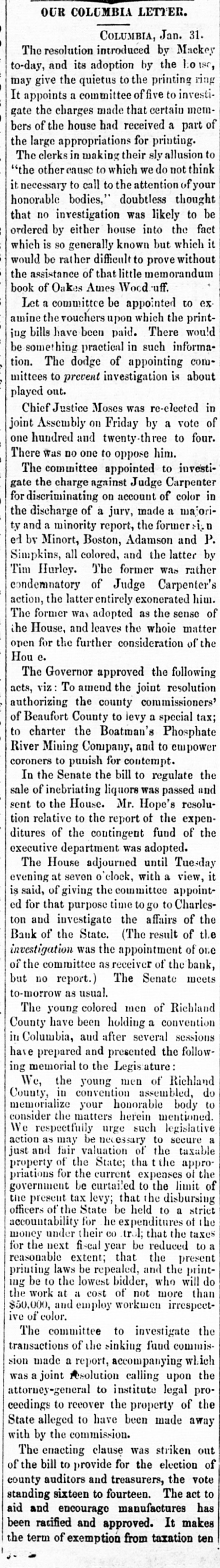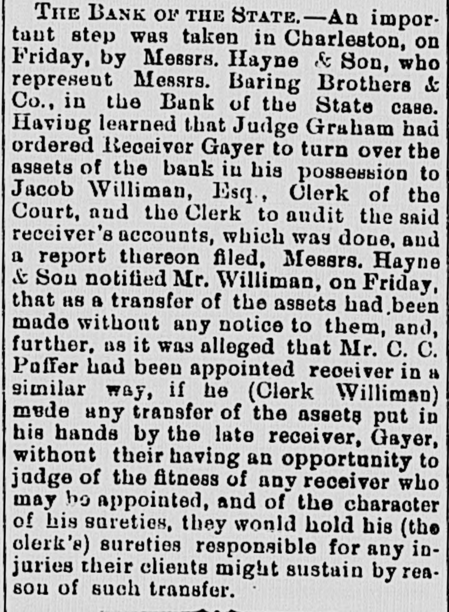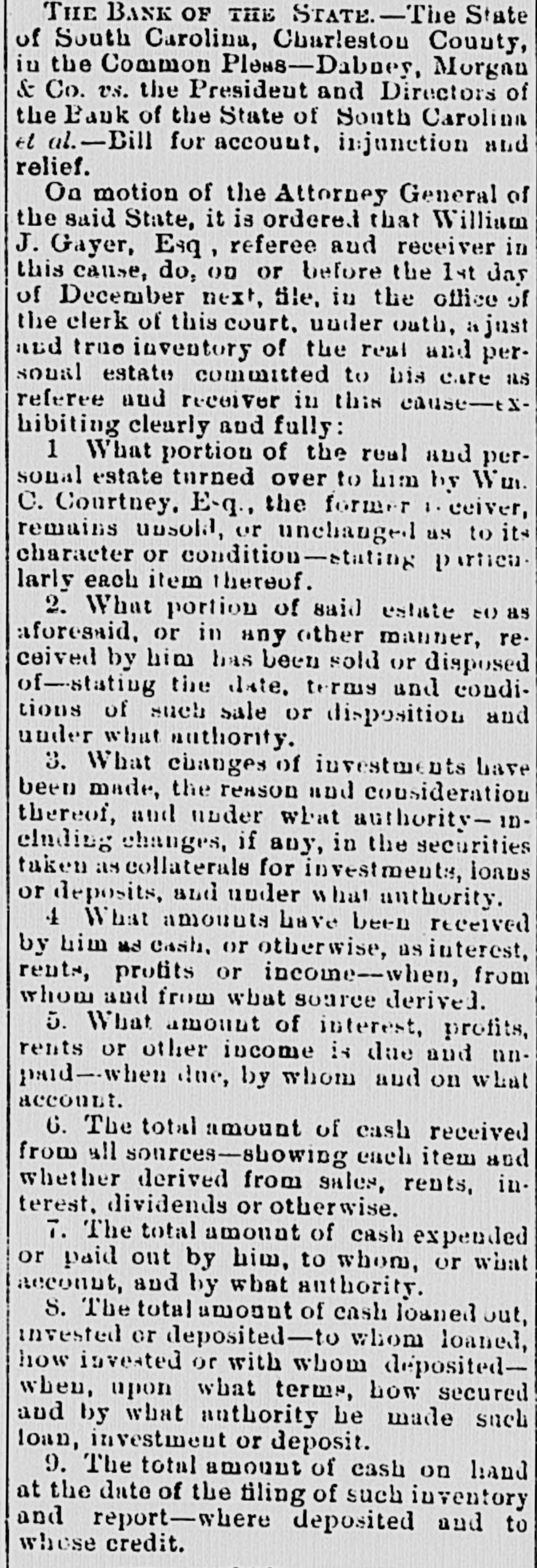 THE BANK OF THE STATE.-The State of South Carolina, Charlestou County, iu the Common Pleas-Daboer, Morgan & Co. vs. the President and Directors of the Bank of the State of South Carolina et al. -Bill for account, injunction and relief. On motion of the Attorney General of the said State, it is ordered that William J. Gayer, Esq, referee and receiver in this cause, do, on or before the 1st day of December next, tite, in the office of the clerk of this court. under outh, a just and true inventory of the real and personal estate committed to his care as referee and receiver in this cause-tXhibiting clearly and fully: 1 What portion of the real and personal estate turned over to him by Wun. C. Courtney. E-q., the former 1. reiver, remains unsold, or unchange.1 as to its character or condition-stating partied larly each item thereof. 2. What portion of said estate EO as aforesaid, or in any other manner, received by him has been sold or disposed of-stating the date. terms and conditions of such sale or disposition and under what authority. 3. What changes of investments have been made, the reason and consideration thereof, and under what authority- - ineluding changes, if any, in the securities taken as collaterals for investments, loads or deposits, and under what authority. 4 What amounts have been received by him as cash. or otherwise, as interest, rents, protits or income--when, from whom and from what source derived. 5. What amount of interest, profits, rents or other income is due and unpaid-when due, by whom and on what account. 6. The total amount of cash received from all sources-showing each item and whether derived from sales, rents, interest. dividends or otherwise. 7. The total amount of cash expended or paid out by him, to whom, or what account, and by what authority. S. The totalamount of cash loaned out, invested or deposited-to whom loaned, how invested or with whom depositedwhen, upon what terms, how secured and by what authority he made such loan, investment or deposit. 9. The total amount of cash on hand at the date of the filing of such inventory and report-where deposited and to whose credit.