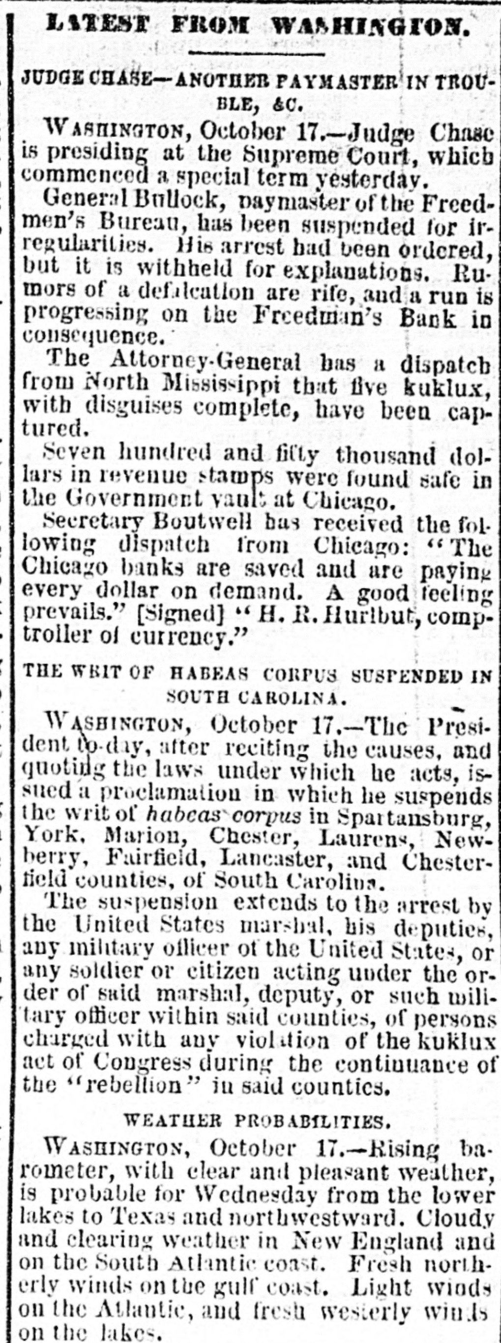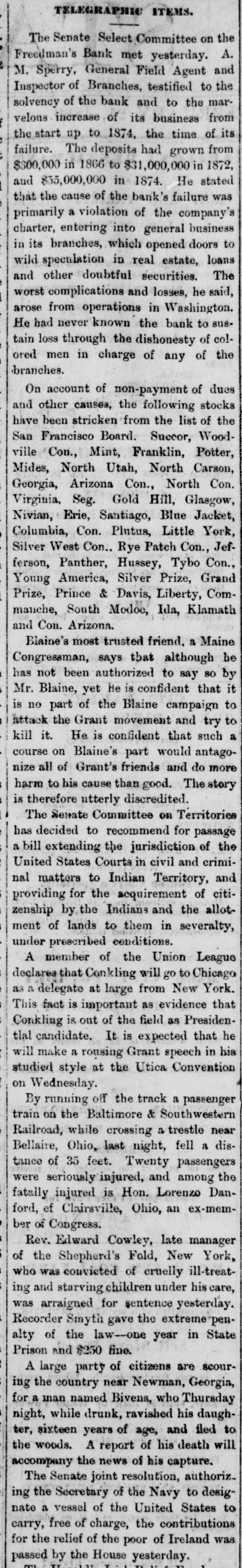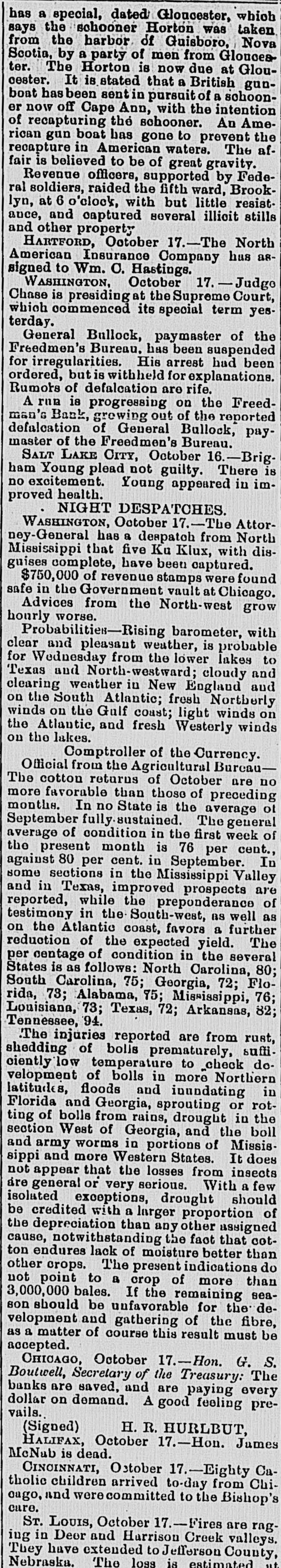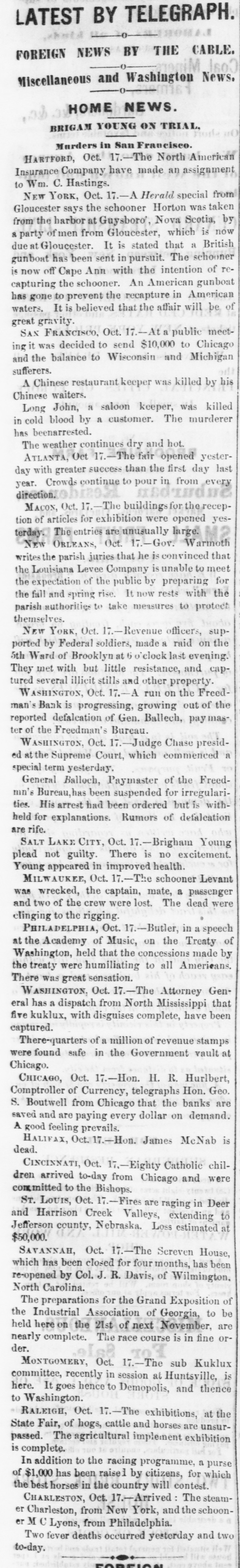 LATEST BY TELEGRAPH. what FOREIGN NEWS BY THE CABLE. Miscellaneous and Washington News. HOME NEWS. BRIGAM YOUNG ON TRIAL. Marders in San Francisco. HARTFORD, Oct. 17.-The North American Insurance Company have made an assignment to Wm. C. Hastings. NEW YORK, Oct. 17.-A Herald special from the schooner was from harbor at Guysboro', by Gloucester the says Horton Nova which Scotia, is taken a party of men from Gloucester, now due It is stated a has been sent in pursuit. gunboat at Gloucester. that The schooner British of is off Ann with the rethe schooner. An capturing now Cape American intention in American gunboat has gone to prevent the recapture waters. It is believed that the affair will be of great gravity. SAN FRANCISCO, Oct. 17 -At a public meeting it was decided to send $10,000 to Chicago and the balance to Wisconsin and Michigan sufferers. A Chinese restaurant keeper was killed by his Chinese waiters. Long John, a saloon keeper, was killed in cold blood by a customer. The murderer has beenarrested. The weather continues dry and hot. ATLANTA, Oct 17. -The fair opened yesterday with greater success than the first day last year. Crowds continue to pour in from every direction. Macon, Oct. -The buildings for the reception of articles for exhibition were opened yesterday. The entries are unusually large. M2 NEW ORLEANS, Oct. 17.-Gov. Warmoth writes the parish juries that he is convinced that the Louisiana Levee Company is unable to meet the expectation of the public by preparing for the fall and spring rise. It now rests with the parish authorities to take measures to protect themselves. NEW YORK, Oct. :-Revenue officers, supported by Federal soldiers, made a raid on the 5th Ward of Brooklyn at 6 o clock last evening. They met with but little resistance, and captured several illicit stills and other property. WASHINGTON, Oct. 17. A run on the Freedman's Bank is progressing, growing out of the reported defalcation of Gen. Ballech, paymaster of the Freedman's Bureau. WASHINGTON, Oct. 17. -Judge Chase presided at the Supreme Court, which commenced a special term yesterday. General Balloch, Paymaster of the Freedmn's Bureau, has been suspended for irregularities. His arrest had been ordered but is withheld for explanations. Rumors of defalcation are rife. SALT LAKE CITY, Oct. -Brigham Young plead not guilty. There is no excitement. Young appeared in improved health. MILWAUKEE, Oct. -The schooner Levant was wrecked, the captain, mate, a passenger and two of the crew were lost. The dead were clinging to the rigging. PHILADELPHIA, Oct. - -Butler, in a speech at the Academy of Music, on the Treaty of Washington, held that the concessions made by the treaty were humiliating to all Americans. There was great sensation. WASHINGTON, Oct. 17.-The Attorney General has a dispatch from North Mississippi that five kuklux, with disguises complete, have been captured. There-quarters of a million of revenue stamps were found safe in the Government vault at Chicago. CHICAGO, Oct. 17.-Hon. H. R. Hurlbert, Comptroller of Currency, telegraphs Hon. Geo. S. Boutwell from Chicago that the banks are saved and are paying every dollar on demand. A good feeling prevails. HALIFAX, Oct. 7.-Hon. James McNab is dead. CINCINNATI, Oct. 17 -Eighty Catholic children arrived to-day from Chicago and were committed to the Bishops. ST. LOUIS, Oct. 17.-Fires are raging in Deer and Harrison Creek Valleys, extending to Jefferson county, Nebraska. Loss estimated at $50,000. SAVANNAH, Oct. 17.-The Screven House, which has been closed for four months, has been re-opened by Col. J. R. Davis, of Wilmington. North Carolina. The preparations for the Grand Exposition of the Industrial Association of Georgia, to be held here on the 21st of next November are nearly complete. The race course is in fine order. MONTGOMERY, Oct. 17.-The sub Kuklux committee, recently in session at Huntsville, is here. It goes hence to Demopolis, and thence to Washington. RALEIGH, Oct. 17 .-The exhibitions, at the State Fair, of hogs, cattle and horses are unsurpassed. The agricultural implement exhibition is complete. In addition to the racing programme, a purse of $1,000 has been raisel by citizens, for which n the best horses in the country will contest. CHARLESTON, Oct. 17.-Arrived The steamer Charleston, from New York, and the schooner M Lyons, from Philadelphia. Two fever deaths occurred yesterday and two to-day.