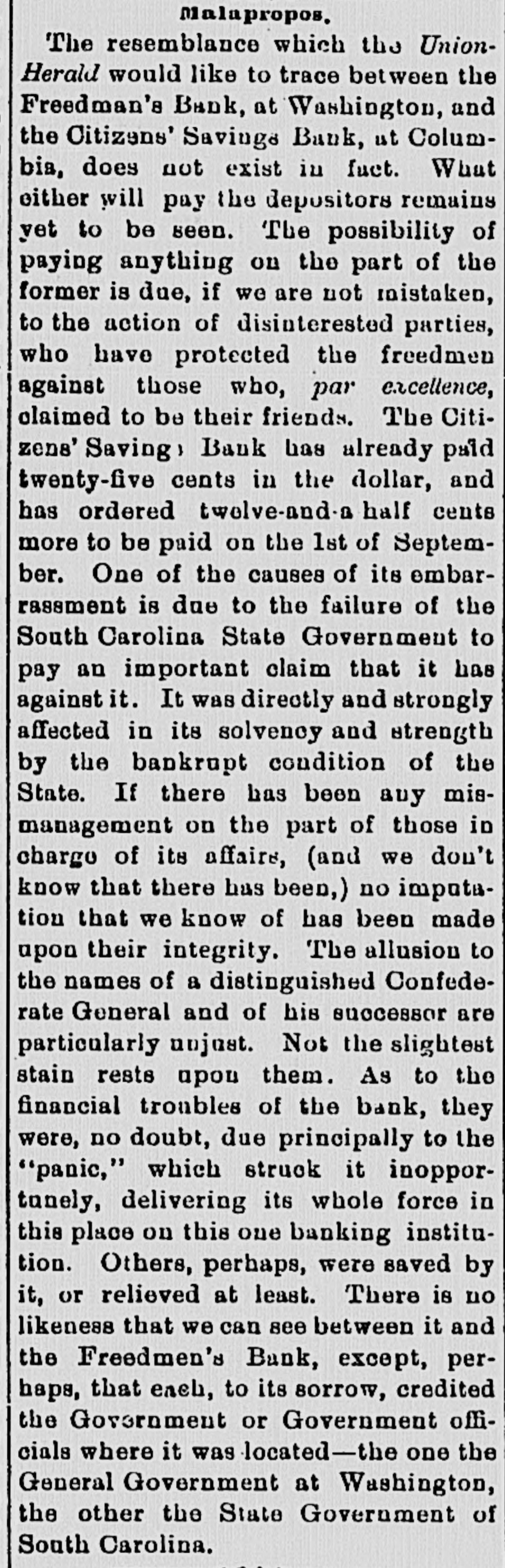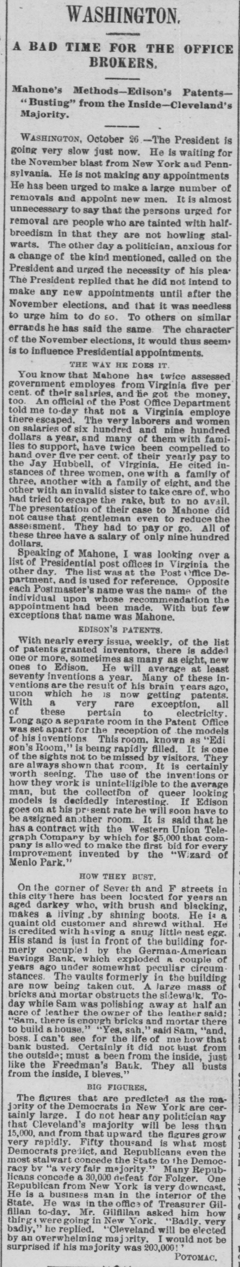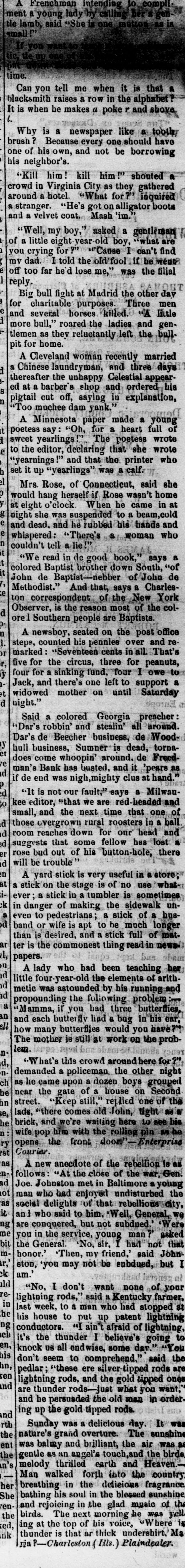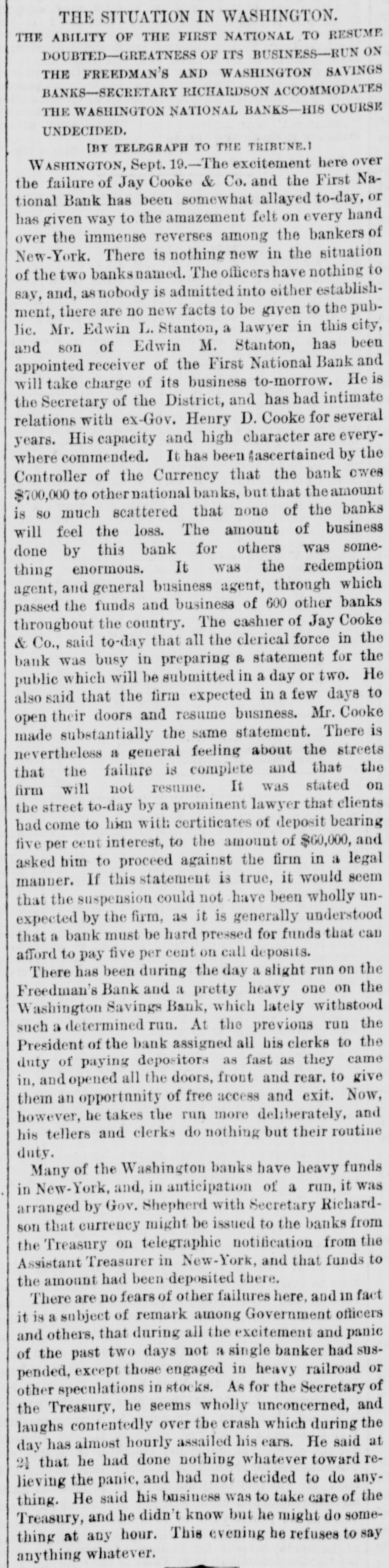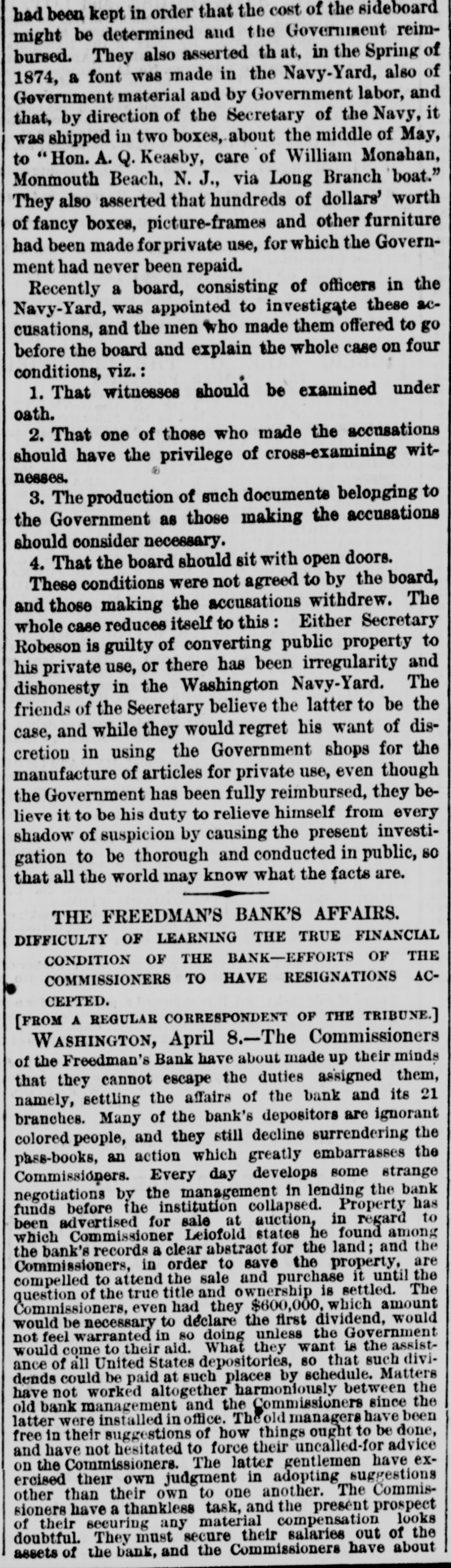 LATEST BY TELEGRAPH. what FOREIGN NEWS BY THE CABLE. Miscellaneous and Washington News. HOME NEWS. BRIGAM YOUNG ON TRIAL. Marders in San Francisco. HARTFORD, Oct. 17.-The North American Insurance Company have made an assignment to Wm. C. Hastings. NEW YORK, Oct. 17.-A Herald special from the schooner was from harbor at Guysboro', by Gloucester the says Horton Nova which Scotia, is taken a party of men from Gloucester, now due It is stated a has been sent in pursuit. gunboat at Gloucester. that The schooner British of is off Ann with the rethe schooner. An capturing now Cape American intention in American gunboat has gone to prevent the recapture waters. It is believed that the affair will be of great gravity. SAN FRANCISCO, Oct. 17 -At a public meeting it was decided to send $10,000 to Chicago and the balance to Wisconsin and Michigan sufferers. A Chinese restaurant keeper was killed by his Chinese waiters. Long John, a saloon keeper, was killed in cold blood by a customer. The murderer has beenarrested. The weather continues dry and hot. ATLANTA, Oct 17. -The fair opened yesterday with greater success than the first day last year. Crowds continue to pour in from every direction. Macon, Oct. -The buildings for the reception of articles for exhibition were opened yesterday. The entries are unusually large. M2 NEW ORLEANS, Oct. 17.-Gov. Warmoth writes the parish juries that he is convinced that the Louisiana Levee Company is unable to meet the expectation of the public by preparing for the fall and spring rise. It now rests with the parish authorities to take measures to protect themselves. NEW YORK, Oct. :-Revenue officers, supported by Federal soldiers, made a raid on the 5th Ward of Brooklyn at 6 o clock last evening. They met with but little resistance, and captured several illicit stills and other property. WASHINGTON, Oct. 17. A run on the Freedman's Bank is progressing, growing out of the reported defalcation of Gen. Ballech, paymaster of the Freedman's Bureau. WASHINGTON, Oct. 17. -Judge Chase presided at the Supreme Court, which commenced a special term yesterday. General Balloch, Paymaster of the Freedmn's Bureau, has been suspended for irregularities. His arrest had been ordered but is withheld for explanations. Rumors of defalcation are rife. SALT LAKE CITY, Oct. -Brigham Young plead not guilty. There is no excitement. Young appeared in improved health. MILWAUKEE, Oct. -The schooner Levant was wrecked, the captain, mate, a passenger and two of the crew were lost. The dead were clinging to the rigging. PHILADELPHIA, Oct. - -Butler, in a speech at the Academy of Music, on the Treaty of Washington, held that the concessions made by the treaty were humiliating to all Americans. There was great sensation. WASHINGTON, Oct. 17.-The Attorney General has a dispatch from North Mississippi that five kuklux, with disguises complete, have been captured. There-quarters of a million of revenue stamps were found safe in the Government vault at Chicago. CHICAGO, Oct. 17.-Hon. H. R. Hurlbert, Comptroller of Currency, telegraphs Hon. Geo. S. Boutwell from Chicago that the banks are saved and are paying every dollar on demand. A good feeling prevails. HALIFAX, Oct. 7.-Hon. James McNab is dead. CINCINNATI, Oct. 17 -Eighty Catholic children arrived to-day from Chicago and were committed to the Bishops. ST. LOUIS, Oct. 17.-Fires are raging in Deer and Harrison Creek Valleys, extending to Jefferson county, Nebraska. Loss estimated at $50,000. SAVANNAH, Oct. 17.-The Screven House, which has been closed for four months, has been re-opened by Col. J. R. Davis, of Wilmington. North Carolina. The preparations for the Grand Exposition of the Industrial Association of Georgia, to be held here on the 21st of next November are nearly complete. The race course is in fine order. MONTGOMERY, Oct. 17.-The sub Kuklux committee, recently in session at Huntsville, is here. It goes hence to Demopolis, and thence to Washington. RALEIGH, Oct. 17 .-The exhibitions, at the State Fair, of hogs, cattle and horses are unsurpassed. The agricultural implement exhibition is complete. In addition to the racing programme, a purse of $1,000 has been raisel by citizens, for which n the best horses in the country will contest. CHARLESTON, Oct. 17.-Arrived The steamer Charleston, from New York, and the schooner M Lyons, from Philadelphia. Two fever deaths occurred yesterday and two to-day.