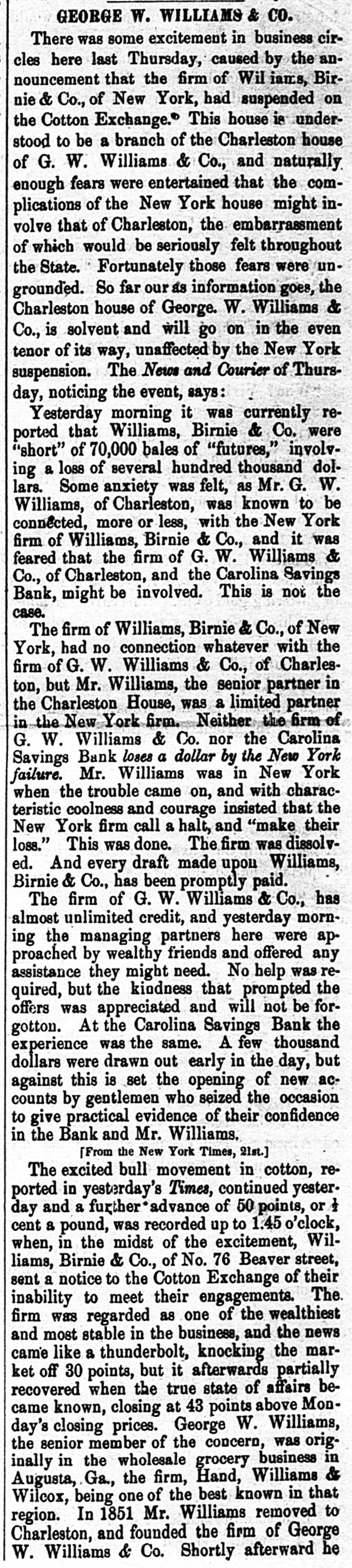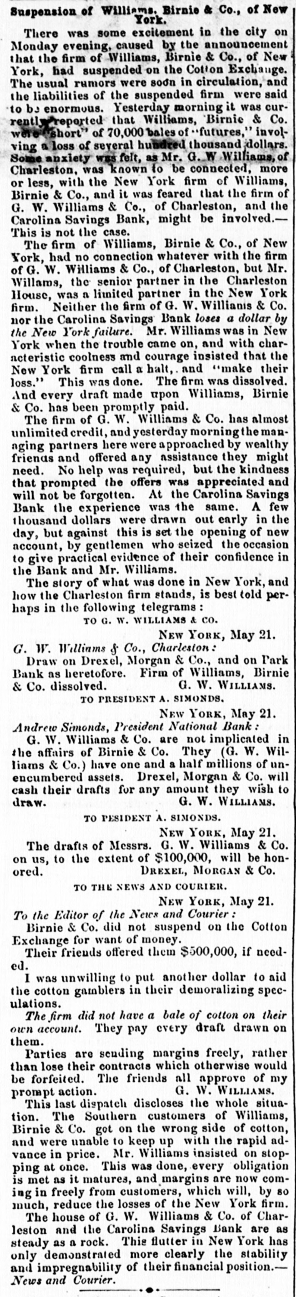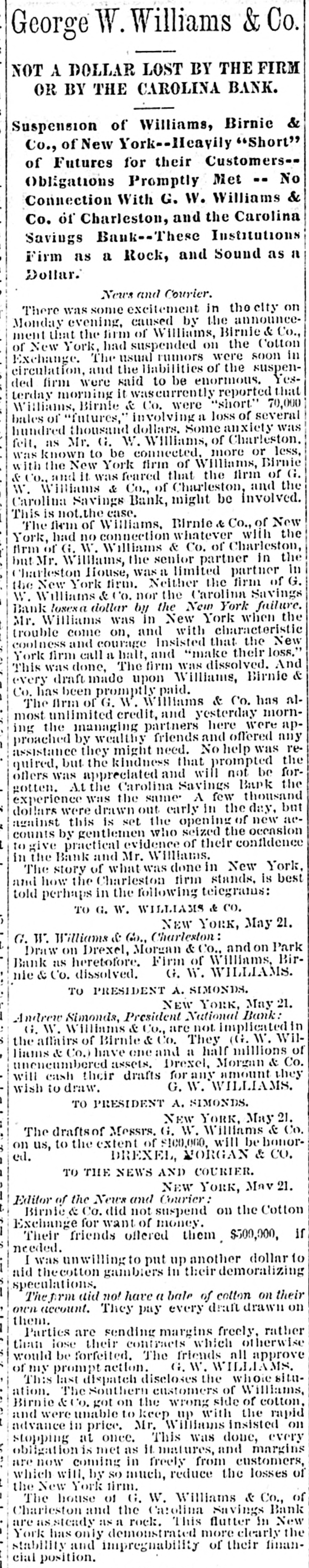 NOT A DOLLAR LOST BY THE FIRM OR BY THE CAROLINA BANK. Suspension of Williams, Birnie & Co., of New York--Heavily "Short" of Futures for their Customers-Obligations Promptly Met -- No Connection With G. W. Williams & Co. of Charleston, and the Carolina Savings Bank--These Institutions Firm as a Rock, and Sound as a Dollar. News and Courier. There was some excitement in the city on Monday evening, caused by the announcement that the firm of Williams, Birnie & Co., of New York, had suspended on the Cotton Exchange. The usual rumors were soon in circulation, and the liabilities of the suspended firm were said to be enormous. Yesterday morning it wascurrently reported that Williams, Birnie & Co. were "short" 70,000 bales of "futures," involving a loss of several hundred thousand dollars. Some anxiety was felt, as Mr. G. W. Williams, of Charleston. was known to be connected. more or less, with the New York firm of Williams, Birnie & Co., and it was feared that the firm of G. W. Williams & Co., of Charleston, and the Carolina Savings Bank, might be involved. This is not.the case. The firm of Williams, Birnie & Co., of New York, had no connection whatever with the firm of G. W. Williams & Co. of Charleston, but Mr. Williams, the senior partner in the Charleston House, was a limited partner in the New York firm. Neither the firm of G. W. Williams & Co. nor the Carolina Savings Bank losesa dollar by the New York failure. Mr. Williams was in New York when the trouble come on, and with characteristic coolness and courage Insisted that the New York firm call a half, and "make their loss.' This was done, The firm was dissolved. And every draft made upon Williams, Birnie & Co. has been promptly paid. The firm of G. W. Williams & Co. has al. most unlimited credit, and yesterday morning the managing partners here were approached by wealthy friends and offered any assistance they might need. No help was required, but the kindness that prompted the offers was appreciated and will not be for gotten. At the Carolina Savings Bank the experience was the same A few thousand dollars were drawn out early in the day, but against this is set the opening of new accounts by gentlemen who seized the occasion to give practical evidence of their confidence in the Bank and Mr. Williams. The story of what was done in New York and how the Charleston firm stands, is best told perhaps in the following telegrams: TO G. W. WILLIAMS & CO. NEW YORK, May 21. G. W. Williams & Go., Charleston: Draw on Drexel, Morgan & Co., and on Park Bank as heretofore. Firm of Williams, Birnie & Co. dissolved. G. W. WILLIAMS. TO PRESIDENT A. SIMONDS. NEW YORK, May 21. Andrew Simonds, President National Bank: G. W. Williams & Co., are not implicated in the affairs of Birnie & Co. They (G. W. Williams & Co.) have one and a half millions o . Co