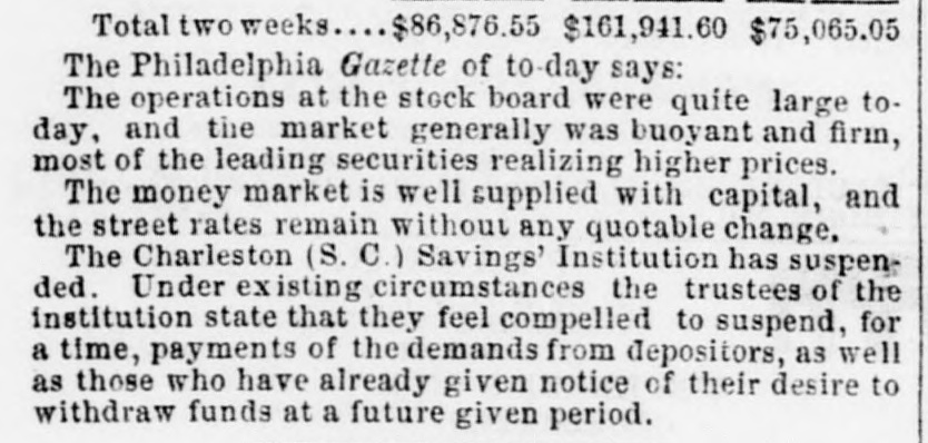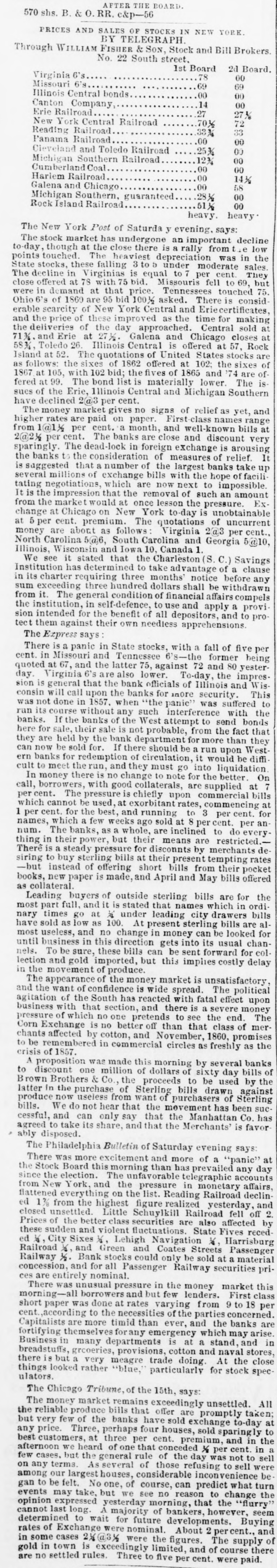 AFTER THE BOARD 570 shs. B. & O. RR. c&p-56 NEW YORK PRICES AND SALES OF STOCKS IN BY TELEGRAPH Through ILLIAM FISHER & SON, Stock and Bill Brokers No. 22 South street. 1st Board 2d Board. 78 Virginia 6's 00 Missouri 69 69 .00 00 Illinois Central bonds 14 00 Canton Company Erie Railroad 27 27 % 70% 72 New York Central Railroad 33 Reading Railroad 33% Panama Railroad .00 00 00 25% Cleveland and Toledo Railroad 00 1234 Michigan Southern Railroad 00 Cumberland Coal 00 00 Harlem Railroad 14 1/2 .00 Galena and Chicago 58 00 .28 1/2 Michigan Southern, guaranteed 00 Rock Island Railroad 51 1/2 heavy heavy The New York Post of Saturda evening. says: The stock market has undergone an important decline low to-day, though at the close there is rally from the the touched The heaviest depreciation was in points stocks, these falling 3 to 5 under moderate sales State in Virginias is equal to 7 per cent They The close decline offered at 78 with 7 bid. Missouris fell touched to 69, but 75. in demand at that price. Tennessees consid were of 1860 are 95 bid 100% asked. There is Ohio 6's scarcity of New York Central and Eriecertificates, erable the price of these improved as the time for making sold and deliveries of the day approached. Central at the at 27 1/2. Galena and Chicago closes at 71% and Erie Illinois Central is offered at 57, Rock 583, Island Toledo at 52. 26 The quotations of United States stocks are of follows: the sixes of 1862 offered at 102; the sixes with 1 bid; the fives of 1865 and '74 are of is fered 1867 at 105, 99. The bond list is materially lower. The sues of at the Erie, Illinois Central and Michigan Southern have The declined market 2@3 per gives cent. no signs of relief as yet, and money rates are paid on paper. First -class names range from higher 1@1 1/2 per cent. a month, and well-known bills at 2@2% cent. The banks are close and discount very per The dead-lock in foreign exchange is arousing to the consideration of measures of that a number of the largest up sparingly. the suggested banks banks relief. take facili- It millions of exchange bills with the hope which are now next to tating several is negotiations, such impossible. of amount is the impression that the removal of an ExIt the market would at once lesson the pressure. from at Chicago on New York to-day is unobtainable at 5 cent. premium. The quotations are about as follows Virginia 2@3 per cent. Carolina 5@6, South Carolina and North money change per Georgia of uncurrent 5@10, Illinois, Wisconsin and Iowa 10, Canada 1. Savings We see it stated that the Charleston (S C.) has determined to take dvantage of a clause its charter requiring three months notice any three hundred dollars shall be withdrawn in Institution sum exceeding before condition of financial affairs compels in self-defence, to use and apply a provi for the benefit of all and to profrom sion the institution, intended it. The general depositors, tect them against their own needless apprehensions The Express says There is a panic in State stocks, with a fall of five per cent. in Missouri and Tennessee -the former being quoted at 67, and the latter 75, against 72 and 80 yesterday. Virginia 6's are also lower. To-day, the impression is general that the bank officials of Illinois and Wis consin will call upon the banks for in0re security This was not done in 1857. when the panic' was suffered to run its course without any such interference with the banks. If the banks of the West attempt to send bonds here for sale, their sale is not probable, from the fact that held by the bank department for more than they they now are be sold for. If there should be a run upon Western can banks for redemption of circulation, it would be diffi cult to meet the run, and they must go into liquidation In money there is no change to note for the better On 7 call, borrowers, with good collaterals, are supplied at percent. The pressure is chiefly upon commercial bills which cannot be used, at exorbitant rates, commencing at 1 cent. for the best, and running to 3 per cent. for names, per which a few weeks ago sold at 8 percent. per an num. The banks, as a whole, are inclined to do every thing in their power, but their means are restricted.There is a steady pressure for disconnts by merchants deto buy sterling bills at their present tempting rates siring -but instead of offering short bills from their pocket as collateral books, new paper is made, and April and May bills offered Leading buyers of outside sterling bills are for ordi- the part full, and it is stated that names which in bills most times go at 1/2 under leading city drawers have nary sold as low as 100. At present sterling bills are almost useless, and no change in money can be looked for until business in this direction gets into its usual channels. To be sure, these bills can be sent forward for collection and gold imported, but this implies costly delay in the movement of produce The appearance of the money market is unsatisfactory and the want of confidence is wide spread. The political agitation of the South has reacted with fatal effect upon business with that section, and there is a severe money pressure of which no one pretends to see the end. The Corn Exchange is no better off than that class of merchants affected by cotton, and November, 1860, promises the to be remembered in commercial circles as freshly as crisis of 1857. A proposition was made this morning by several banks discount one million of dollars of sixty day bills of in the of purchase bills Sterling drawn Brown to Brothers & Co., the proceeds to be used against by the latter produce now useless from want of purchasers of Sterling bills. We do not hear that the movement has been suc cessful, and can only say that the Manhattan Co. has agreed to take its share, and that the Merchants' is favor ably disposed. The Philadelphia Bulletin of Saturday evening says: There was more excitement and more of a "panic" at Stock Board this morning than has pr