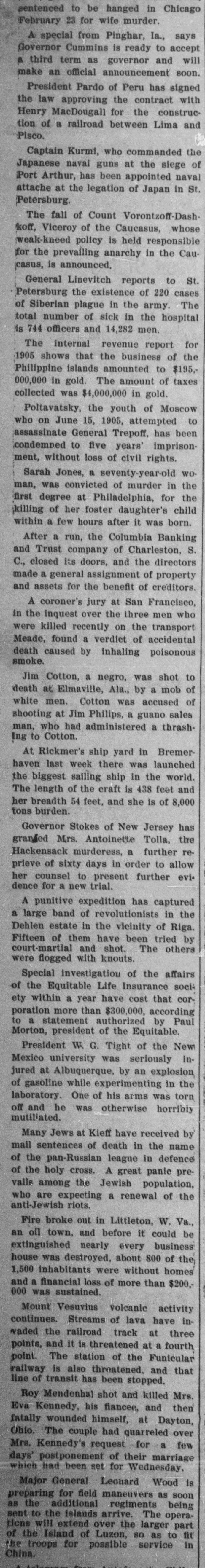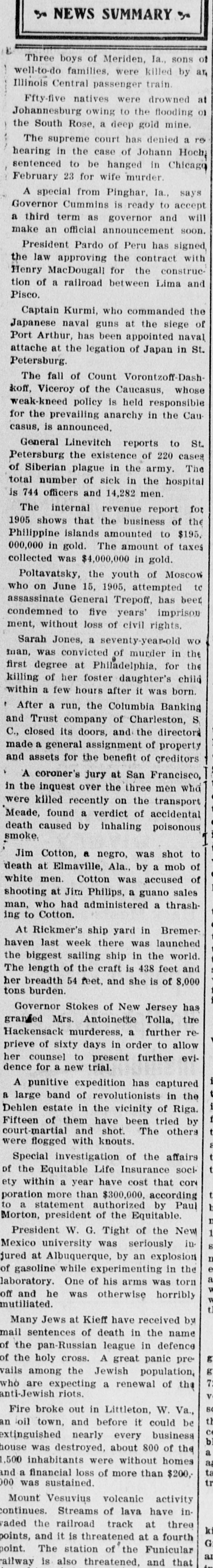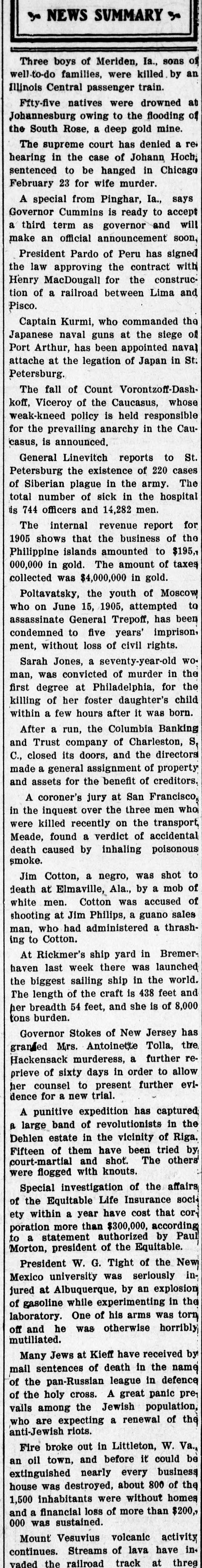NEWS SUMMARY go Three boys of Meriden, Ia., sons of well-to-do families, were killed by an Illinois Central passenger train. Fity-five natives were drowned at Johannesburg owing to the flooding of the South Rose, a deep gold mine. The supreme court has denied a re hearing in the case of Johann Hoch, sentenced to be hanged in Chicago February 23 for wife murder. A special from Pinghar, Ia., says Governor Cummins is ready to accept a third term as governor and will make an official announcement soon, President Pardo of Peru has signed the law approving the contract with Henry MacDougall for the construction of a railroad between Lima and Pisco. Captain Kurmi, who commanded the Japanese naval guns at the siege of Port Arthur, has been appointed naval attache at the legation of Japan in St. Petersburg. The fall of Count Vorontzoff-Dashkoff, Viceroy of the Caucasus, whose weak-kneed policy is held responsible for the prevailing anarchy in the Caucasus, is announced. General Linevitch reports to St. Petersburg the existence of 220 cases of Siberian plague in the army. The total number of sick in the hospital is 744 officers and 14,282 men. The internal revenue report for 1905 shows that the business of the Philippine islands amounted to $195, 000,000 in gold. The amount of taxes collected was $4,000,000 in gold. Poltavatsky, the youth of Moscow who on June 15, 1905, attempted to assassinate General Trepoff, has been condemned to five years' imprison, ment, without loss of civil rights. Sarah Jones, a seventy-year-old wo man, was convicted of murder in the first degree at Philadelphia, for the killing of her foster daughter's child within a few hours after it was born. After a run, the Columbia Banking and Trust company of Charleston, S, C., closed its doors, and the directors made a general assignment of property and assets for the benefit of creditors. A coroner's jury at San Francisco, in the inquest over the three men who were killed recently on the transport, Meade, found a verdict of accidental death caused by inhaling poisonous smoke. Jim Cotton, a negro, was shot to death at Elmaville, Ala., by a mob of white men. Cotton was accused of shooting at Jim Philips, a guano sales man, who had administered a thrashing to Cotton. At Rickmer's ship yard in Bremerhaven last week there was launched the biggest sailing ship in the world. The length of the craft is 438 feet and her breadth 54 feet, and she is of 8,000 tons burden. Governor Stokes of New Jersey has granded Mrs. Antoinette Tolla, the Hackensack murderess, a further reprieve of sixty days in order to allow her counsel to present further evidence for a new trial. A punitive expedition has captured a large band of revolutionists in the Dehlen estate in the vicinity of Riga. Fifteen of them have been tried by court-martial and shot. The others were flogged with knouts. Special investigation of the affairs of the Equitable Life Insurance society within a year have cost that corporation more than $300,000, according to a statement authorized by Paul Morton, president of the Equitable. President W. G. Tight of the New Mexico university was seriously injured at Albuquerque, by an explosion of gasoline while experimenting in the laboratory. One of his arms was torn off and he was otherwise horribly mutiliated. Many Jews at Kieff have received by mail sentences of death in the name of the pan-Russian league in defence of the holy cross. A great panic prevails among the Jewish population, who are expecting a renewal of the anti-Jewish riots. Fire broke out in Littleton, W. Va., an oil town, and before it could be extinguished nearly every business house was destroyed, about 800 of the 1,500 inhabitants were without homes and a financial loss of more than $200,, 000 was sustained. Mount Vesuvius volcanic activity continues. Streams of lava have in+ vaded the railroad track at three