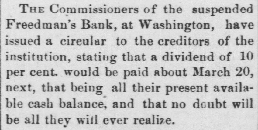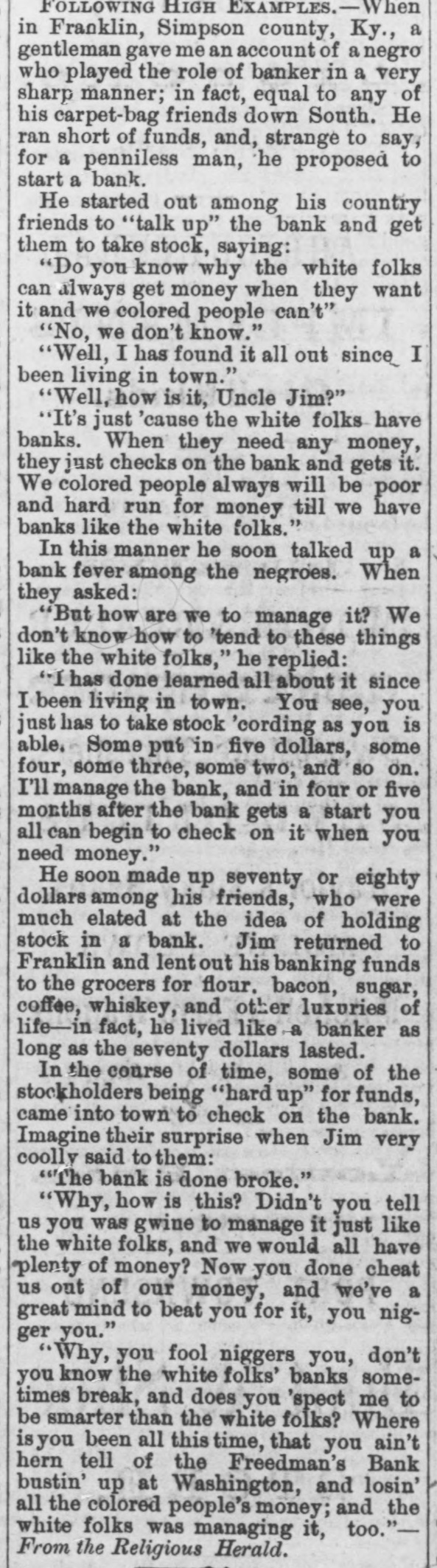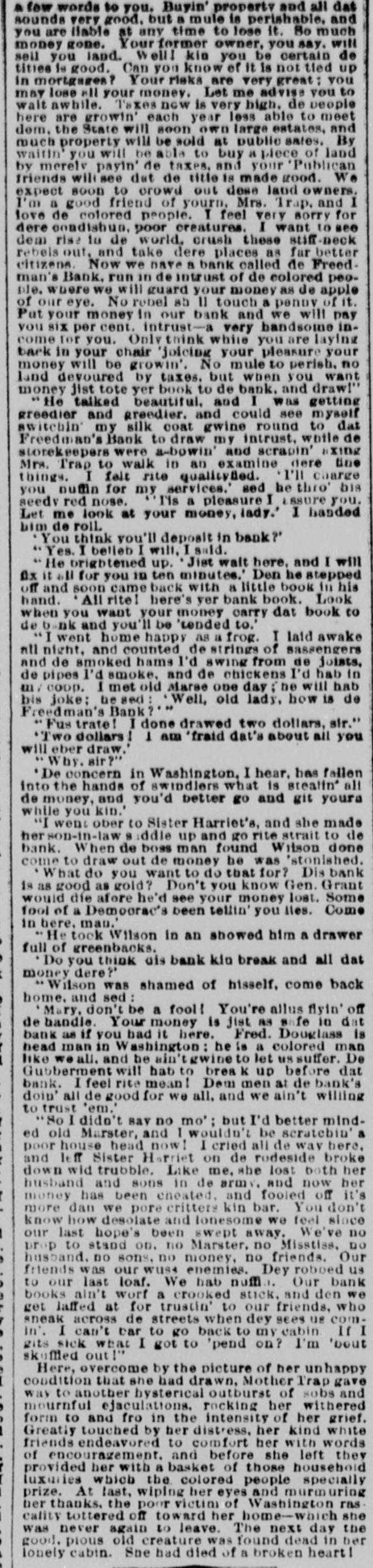 low words to you. Buyin' property and all dat sounds very good. but a mule is perishable. and you are liable at any time to lose it. 80 much money gone. Your former owner, you say. will sell you land. well! kia you be certain de tities Is good. Can you know of It is not tied up in mortgages? Your risks are very great: you may lose all your money. Let me advise you to wait awhile. Taxes now is very high. de people here are growin' each year less able to meet dem. the State will soon own large estates, and much property will be sold at public sales. By waitin you will be able to buy a plece of land by merely payin' de taxes, and your Publican friends will see dat de title is made good. We expect BOOD to crowd out dese land owners. I'm a good friend of yourn, Mrs. Trap. and I love de colored people. I feel very sorry for dere condishun, poor creatures. I want to see dem rise to de world. crush these stiff-neck rebels out. and take dere places as far better citizens. Now we have a bank called de Freed man's Bank, run in deintrust of de colored people. where we will guard your money as de apple of our eye. No rebel sb 11 touch a penny of it. Put your money In our bank and we will pay you six per cent. intrust- very handsome income for you. Only think white you are laying back in your chair 'joicing your pleasure your money will be growin'. No mule to perish. no land devoured by taxes. but when you want money jist tote yer book to de bank. and draw! He talked beautiful. and I was getting greedier and greedier. and could see myself switchin my silk coat gwine round to dat Freedman's Bank to draw my intrust. while de storekeepers were a-bowin and scrapin' axing Mrs. Trap to walk in an examine dere time charge things. I felt rite qualityBed. I'll you nuffin for my services." sed he thro' bis seedy red nose. I'is a pleasure I issure you. Let me look at your money, lady.' I handed him de roll. You think you'll deposit in bank?' Yes. I belieb I will, said. He brightened up. Jist wait here, and I will flx it all for you in ten minutes." Den he stepped off and soon came back with a little book in his hand. All rite! here's yer bank book. Look when you want your money carry dat book to de bank and you be 'tended to. I went home happy as a frog. I laid awake all night, and counted de strings of sassengers and de smoked hams I'd swing from de joists. de pipes I'd smoke. and de chickens I'd hab in coop. I met old Marse one day he will hab bis joke; besed: Well, old lady. how is de Freedman's Bank Fus trate! I done drawed two dollars, sir.' Two dollars 1 am fraid dat's about all you will eber draw. "Why,sir?" De concern in Washington, I hear. has fallen into the hands of swindlers what is stealing all de money, and you'd better go and git yours while you kin. went ober to Sister Harriet's, and she made her son-in-law ddle up and go rite strait to de bank. When de boss man found Witson done come to draw out de money be was "stonished. What do you want to do that for? Dis bank is as good as gold? Don't you know Gen. Grant would die afore he'd see your money lost. Some fool of a Demoorac's been tellin' you lies. Come in here. man. He took Wilson in an showed him a drawer full of greenbacks. Do you think ais bank kin break and all dat money dere? Wilson was shamed of hisself, come back home. and sed Mary, don't be a fool! You're allus flyin' off de bandle. Your money is jist as fe in dat bank as if you had it here. Fred. Douglass is head man in Washington : he is a colored man like weall. and be ain't gwine let us suffer. De Gubberment will hab to brea up before dat bank. feel rite mean! Dem men at de bank's doin' all de good for we all. and we ain't willing to trust 'em.' So I didn't say no mo': but I'd better minded old Marster, and I wouldn't be scratchin' a poor house head now! I cried all de way here. and leff Sister Harriet on de rodeside broke down wid trubble. Like me, she lost both her husband and sons in de arm v. and now her money has been cheated. and fooled off it's more dan we pore critters kin bar. You don't know how desolate and lonesome we feel since our last hope's been swept away. We ve no prop to stand OD. no Marster, no Misstiss. DO husband. DO sons. no money, no friends. Our friends was our wuse enemies. Dey roboed us to our last loaf. We hab nuff Our bank books ain't worf a crooked stick, and den we get laffed at for trustin' to our friends. who sneak across de streets when dey sees us comI in'. I can't car to go back to my cabin If gits sick what I got to pend on? I'm 'bout skuffled out! Here, overcome by the picture of her unhappy condition that she had drawn. Mother Trap gave way to another hysterical outburst of sobs and mournful ejaculations. rocking her withered form to and fro in the intensity of her grief. Greatly touched by her distress. her kind white friends endeavored to comfort her with words of encourazement. and before she left they provided her with a basket of those household luxuries which the colored people specially prize. At last, wiping her eyes and armuring her thanks. the poor victimi of Washington ras cality tottered off toward her home-which she was never again to leave. The next day the good. pious old creature was found dead in her lonely cabin. She had died of a broken heart|