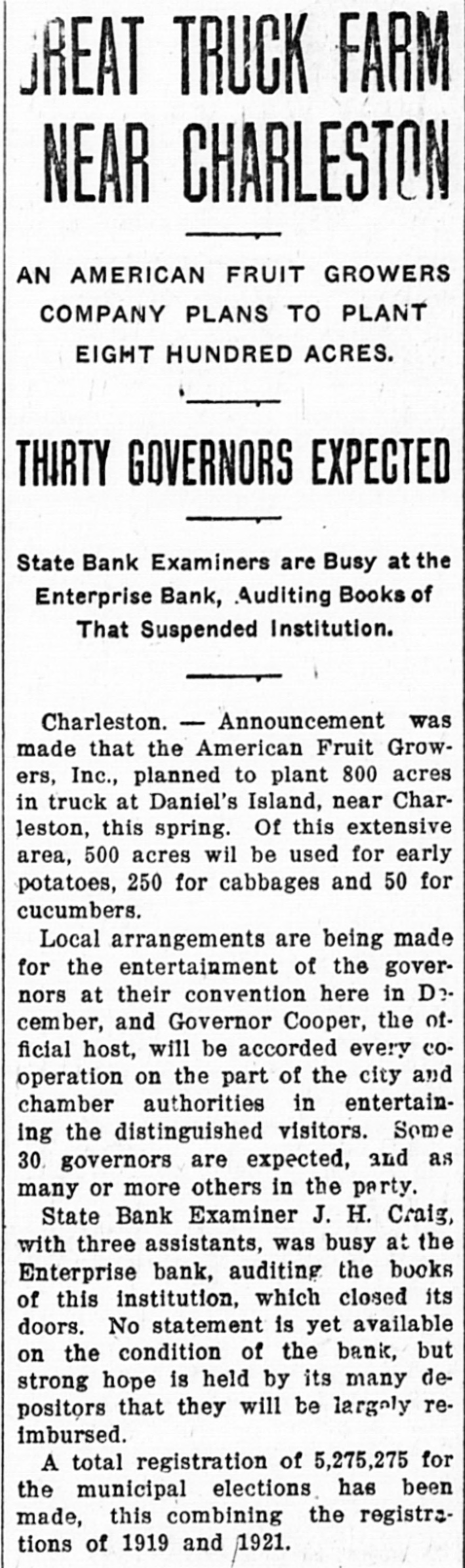 DREAT TRUCK FARM NEAR CHARLESTON AN AMERICAN FRUIT GROWERS COMPANY PLANS TO PLANT EIGHT HUNDRED ACRES. THIRTY GOVERNORS EXPECTED State Bank Examiners are Busy at the Enterprise Bank, Auditing Books of That Suspended Institution. Charleston. - Announcement was made that the American Fruit Growers, Inc., planned to plant 800 acres in truck at Daniel's Island, near Charleston, this spring. Of this extensive area, 500 acres wil be used for early potatoes, 250 for cabbages and 50 for cucumbers. Local arrangements are being made for the entertainment of the governors at their convention here in December, and Governor Cooper, the official host, will be accorded every cooperation on the part of the city and chamber authorities in entertaining the distinguished visitors. Some 30. governors are expected, and as many or more others in the party. State Bank Examiner J. H. Craig, with three assistants, was busy at the Enterprise bank, auditing the books of this institution, which closed its doors. No statement is yet available on the condition of the bank, but strong hope is held by its many depositors that they will be largely reimbursed. A total registration of 5,275,275 for the municipal elections has been made, this combining the registrations of 1919 and 1921.