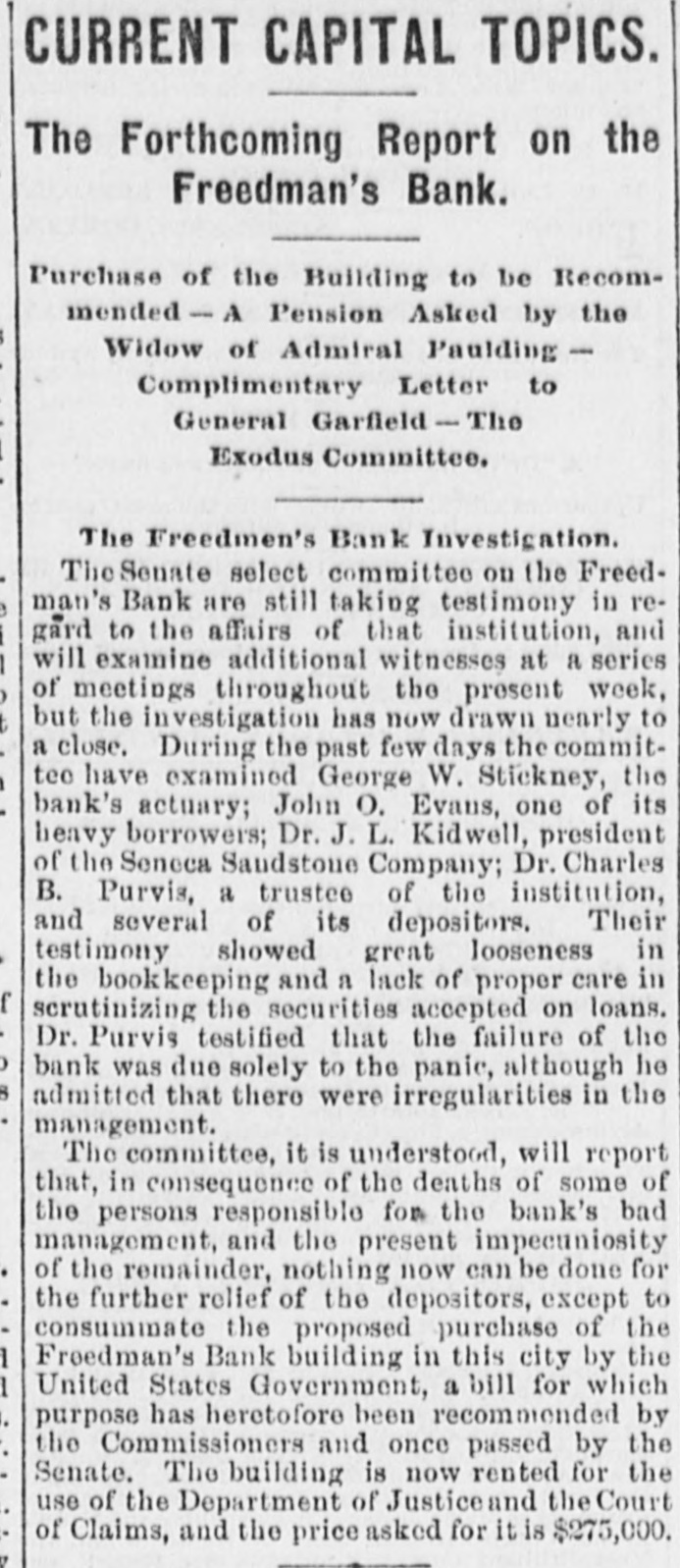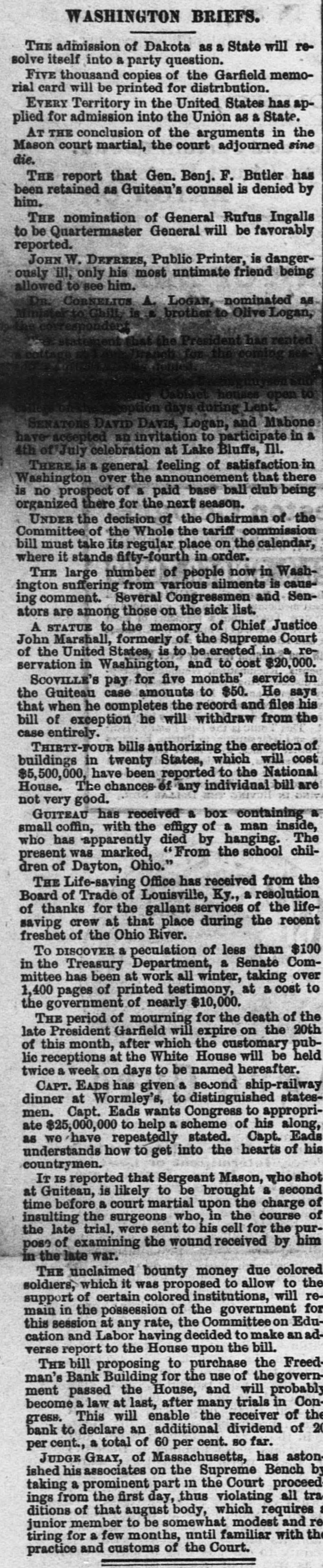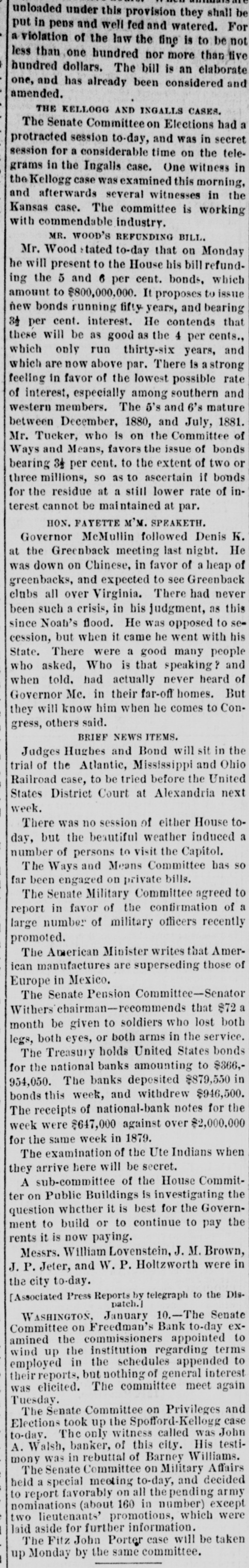 step, in the presence of his family by Mosby's guerrillas, applied for a position in the Treasury Department, having the names of fourteen members of Congress indorsing her ability and respectability; but Mrs. Barnes not being able to organize for Sherman, was unsuccessful, while the Departments are overrun with the proteges of Confederate soldiers. The wife, daughter, son and son-inlaw of Yerger, the ex rebel who assassinated Col. Crane of Dayton, Ohio, of the United States army, at Jackson, Miss, in 1866. are all in the Department here. Secretary Sherman can be asked how it is that the Sherman family are all saddled on the public. Here is the roster of the Sherman family who are now making sacrifices on the altar of their country: W. T. Sherman, General of the Army, $17,700; $4200 is commutation of quarters and fuel, although he has a suite of quarters in the War Department, with fuel and gas, that can not be duplicated in the city for $5000. Secretary John Sherman, $8,000 with carriage and forage. John Sherman j'r, Marshal of New Mexico. $6,000. R. H. T. Lenold, husband of John Sherman's niece, appointed out of the Treasury as commissioner to close up the Freedman's Bank, $5.000. Roger Sherman Bartley, Sherman's nephew, clerk in the New York postoffice, $2500. Frank. Bernard, who married young Bartley's sister, is a $1600 clerk in the Auditor's office of the Treasury, and was detailed from the Treasury to take U.S. bonds to the Syndicate. He has been traveling with his wife several months, and is paid out of the appropriation to place the loan. - Huggins, married to John Sherman's niece, $1800; was in the Treasury Department; now in the public service in California. O. L. Pitnev. Sup't of the U. S. Treasury building, $2400. Pitney was a confidential clerk of John Sherman j'r, and was assigned to that important office, in which he is the purchaser of the furniture and supplies for all the National buildings in the country. The office has been abolished by an act of Congress, the law is evaded by keeping Pitney on the rolls of the Treasury in another capacity, while he is continued on this duty. It is said that Pitney is the right person to consult by the tenants in the forty three-story pressed brick houses owned by Sherman, three squares north of the Capitol building. It is further said that a residence in one of these houses insures an employe of any of the Departments his place indefinitely. I have refrained from mentioning the cousins. and the neices, and the aunts of the female persuasion who are aiding their distinguished relative in his race for the Presidency by drawing Govern. ment salaries, believing the public will give the Sherman clan due credit for what the males are doing.-Cincinnati Enquirer.