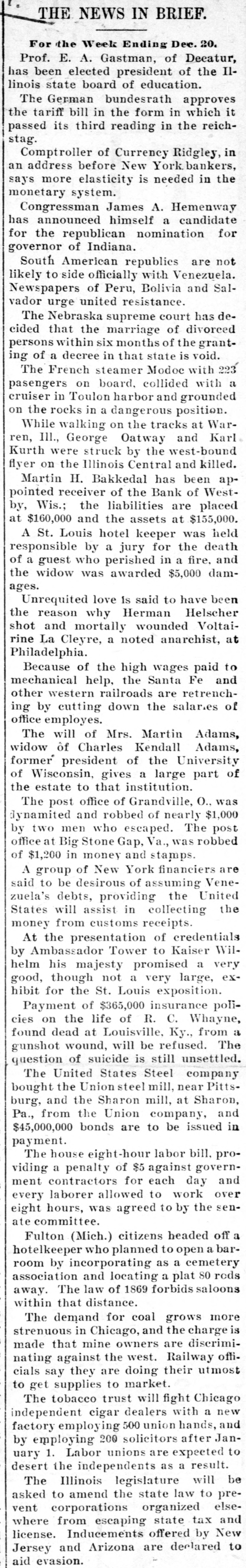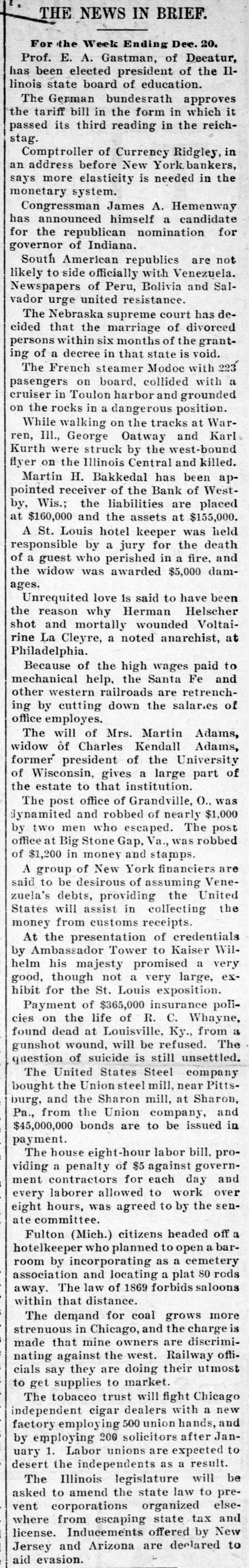 THE NEWS IN BRIEF. For the Week Ending Dec. 20. Prof. E. A. Gastman, of Deeatur, has been elected president of the Illinois state board of education. The German bundesrath approves the tariff bill in the form in which it passed its third reading in the reichstag. Comptroller of Currency Ridgley, in an address before New York bankers, says more elasticity is needed in the monetary system. Congressman James A. Hemenway has announced himself a candidate for the republican nomination for governor of Indiana. South American republics are not likely to side officially with Venezuela. Newspapers of Peru, Bolivia and Salvador urge united resistance. The Nebraska supreme court has decided that the marriage of divorced persons within six months of the granting of a decree in that state is void. The French steamer Modoc with 223 pasengers on board, collided with a cruiser in Toulon harbor and grounded on the rocks in a dangerous position. While walking on the tracks at Warren, III., George Oatway and Karl Kurth were struck by the west-bound flyer on the Illinois Central and killed. Martin H. Bakkedal has been appointed receiver of the Bank of Westby, Wis.; the liabilities are placed at $160,000 and the assets at $155,000. A St. Louis hotel keeper was held responsible by a jury for the death of a guest who perished in a fire, and the widow was awarded $5,000 damages. Unrequited love is said to have been the reason why Herman Helscher shot and mortally wounded Voltairine La Cleyre, a noted anarchist, at Philadelphia. Because of the high wages paid to mechanical help, the Santa Fe and other western railroads are retrenching by cutting down the salar.es of office employes. The will of Mrs. Martin Adams, widow of Charles Kendall Adams, former president of the University of Wisconsin, gives a large part of the estate to that institution. The post office of Grandville, O., was dynamited and robbed of nearly $1,000 by two men who escaped. The post office at Big Stone Gap, Va., was robbed of $1,200 in money and stamps. A group of New York financiers are said to be desirous of assuming Venezuela's debts, providing the United States will assist in collecting the money from customs receipts. At the presentation of credentials by Ambassador Tower to Kaiser Wilhelm his majesty promised a very good, though not a very large, exhibit for the St. Louis exposition. Payment of $365,000 insurance policies on the life of R. C. Whayne, found dead at Louisville, Ky., from a gunshot wound, will be refused. The question of suicide is still unsettled. The United States Steel company bought the Union steel mill, near Pittsburg, and the Sharon mill, at Sharon, Pa., from the Union company, and $45,000,000 bonds are to be issued in payment. The house eight-hour labor bill, providing a penalty of $5 against government contractors for each day and every laborer allowed to work over eight hours, was agreed to by the senate committee. Fulton (Mich.) citizens headed off a hotelkeeper who planned to open a barroom by incorporating as a cemetery association and locating a plat 80 rods away. The law of 1869 forbids saloons within that distance. The demand for coal grows more strenuous in Chicago, and the charge is made that mine owners are discriminating against the west. Railway officials say they are doing their utmost to get supplies to market.