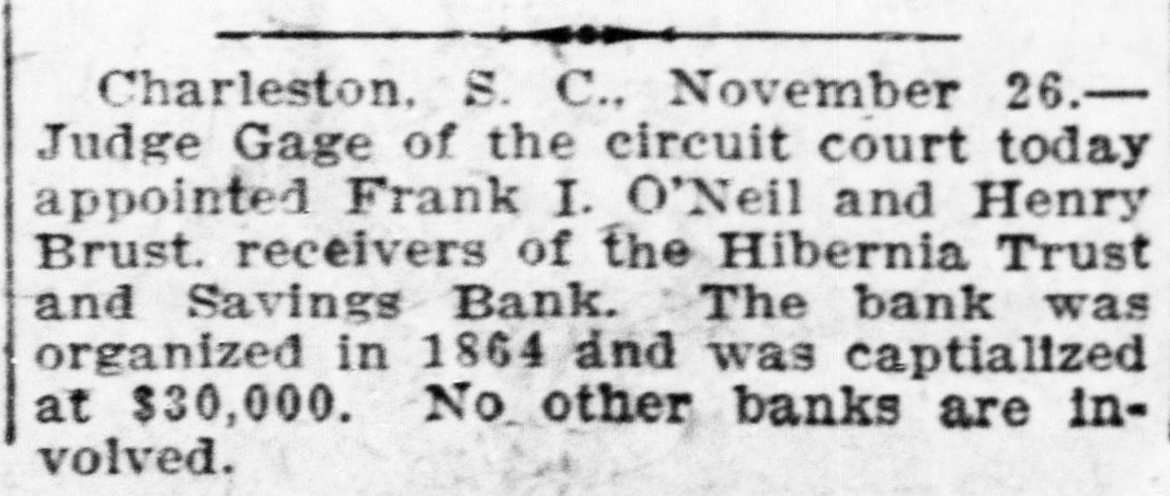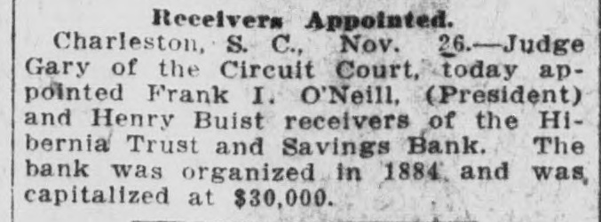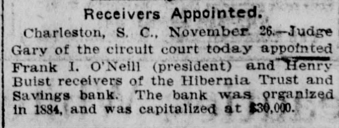 Charleston. S. C., November 26.Judge Gage of the circuit court today appointed Frank I. O'Neil and Henry Brust. receivers of the Hibernia Trust and Savings Bank. The bank was organized in 1864 and was captialized at $30,000. No other banks are involved.