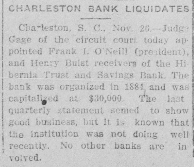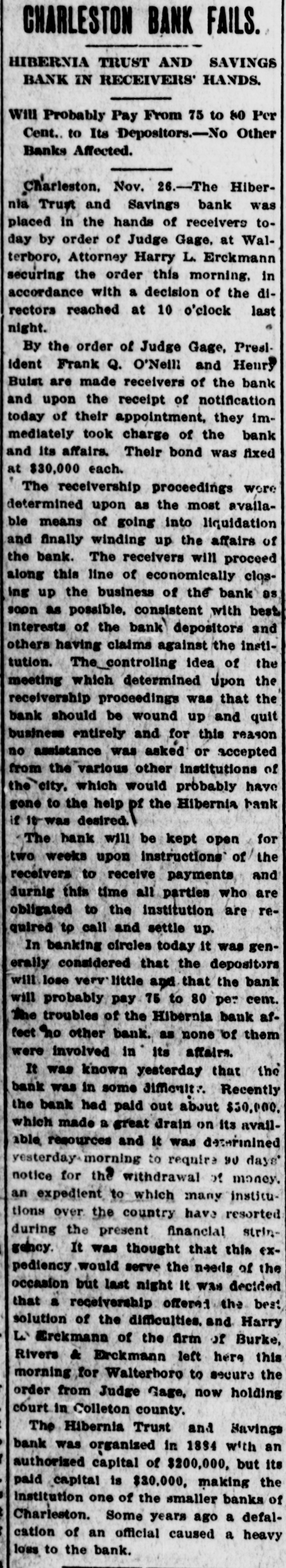 CHARLESTON BANK FAILS. HIBERNIA TRUST AND SAVINGS BANK IN RECEIVERS' HANDS. Will Probably Pay From 75 to 80 Per Cent. to Its Depositors.-No Other Banks Affected. Charleston, Nov. 26.-The Hibernia Trust and Savings bank was placed in the hands of receivers today by order of Judge Gage, at Walterboro, Attorney Harry L. Erckmann securing the order this morning, in accordance with a decision of the directors reached at 10 o'clock last night. By the order of Judge Gage, Presiident Frank Q. O'Neill and Henry Buist are made receivers of the bank and upon the receipt of notification today of their appointment, they immediately took charge of the bank and its affairs. Their bond was fixed at $30,000 each. The receivership proceedings were determined upon as the most available means of going into liquidation and finally winding up the affairs of the bank. The receivers will proceed along this line of economically closing up the business of the bank as soon as possible, consistent with best Interests of the bank depositors and others having claims against the institution. The controling idea of the meeting which determined upon the receivership proceedings was that the bank should be wound up and quit business entirely and for this reason no assistance was asked or accepted from the various other institutions of the city, which would probably have gone to the help of the Hibernia bank if it was desired. The bank will be kept open for two weeks upon instructions of the receivers to receive payments and durnig this time all parties who are obligated to the institution are required to call and settle up. In banking circles today it was generally considered that the depositors will lose very little and that the bank will probably pay 75 to 80 per cent. The troubles of the Hibernia bank affeet no other bank. as none of them were involved in its affairs. It was known yesterday that the bank was in some difficult. Recently the bank had paid out about $50,000. which made a great drain on its available resources and it was determined yesterday. morning to require 90 days' notice for the withdrawal of money. an expedient to which many institutions over the country have resorted during the present financial stringency. It was thought that this expediency would serve the needs of the occasion but last night It was decided that a receivership offered the best solution of the difficulties. and Harry L. Erckmann of the firm of Burke, Rivers & Erckmann left here this morning for Walterboro to secure the order from Judge Gage, now holding