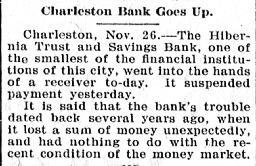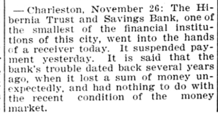 - Charleston, November 26: The Hibernia Trust and Savings Bank, one of the smallest of the financial institutions of this city, went into the hands of a receiver today. It suspended payment yesterday. It is said that the bank's trouble dated back several years ago, when it lost a sum of money unexpectedly, and had nothing to do with the recent condition of the money market.