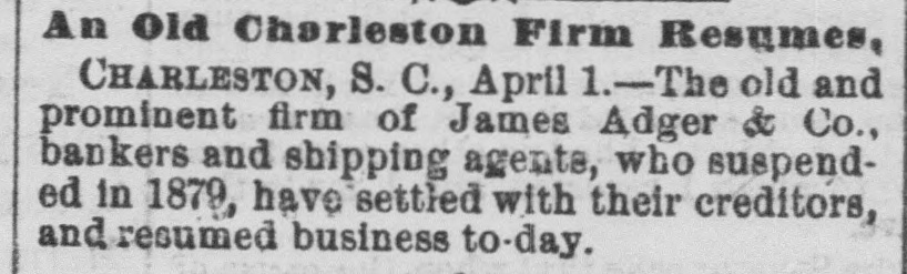 An Old Charleston Firm Resumes, CHARLESTON, S. C., April 1.-The old and prominent firm of James Adger & Co., bankers and shipping agente, who suspended in 1879, have settled with their creditors, and resumed business to-day.