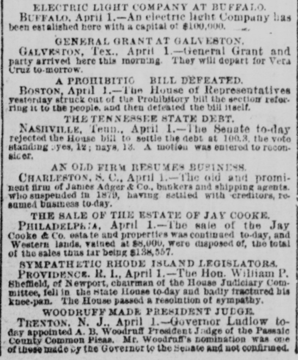 ELECTRIC LIGHT COMPANY AT SUFFALO. BUFFALO. April 1.-An electric light Company has been estalished here with a capital of $100,000. GENERAL GRANT AT GALVESTON. GALVESTON, Tex., April 1.-General Grant and party arrived here this morning. They will depart for Vera Uruz to-morrow. A PROHIBITIC BILL DEFEATED. BOSTON, April 1.-The House of Representatives yesterday struck out of the Prohibitory bill the section refer. ring it to the people. and then defeated the bill itself. THETENNESSEE STATE DEBT. NASHVILLE, Teun., April 1.-The Senate to-day rejected the House bill to settle the debt at 100.3. the vote standing eyes, 12; naya, 13. A motion was entered to reconsicer. AN OLD FIRM RESUMES BUSINESS CHARLESTON, 8. C., April 1.-The old and prominent firm of James Adger & Co., bankers and shipping agents. who suspended in 1879, having satiled with creditors, I'v. samed business to-day. THE SALE OF THE ESTATE OF JAY COOKE. PHILADELPHIA, April 1.-The sale of the Jay Cooke & Co. esta to and properties was continued to-day, and Western lands, vained at $8,000, were disposed of, the total of the sales thus far being $138,557. SYMPATHETIC RHODE ISLAND LEGISLATORA. PROVIDENCE. R. 1., April 1.-The Hon. William P. Sheffield, of Newport, chairman of the House Judiciary Committee, fell in the state House to-day and badly fractured his knee-pan. The House passed a resolution of sympathy. WOODRUFF MADE PRESIDENT JUDGE TRENTON. N. J., April .-Governor Ludlow today appointed A. B. Woodruff President Jadge of the Passaic County Common Pieas. Mr. Woodruff's nomination was one of these made by the Governor to the Senate and not confirmed.