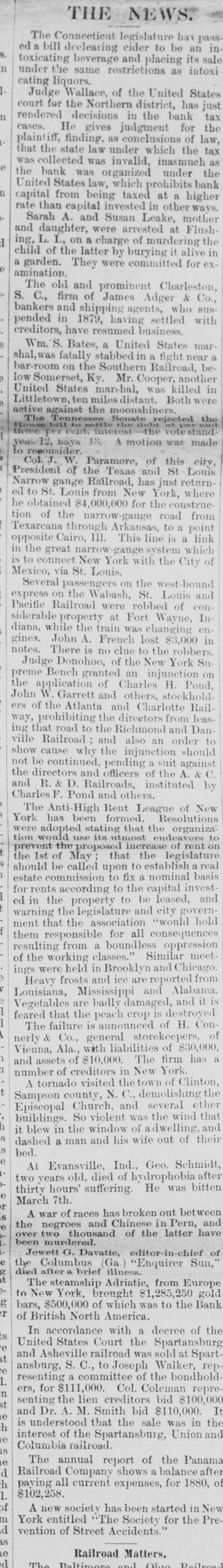 under cating liquors. Wallace, of the United has States just Judge for the Northern district, the bank tax court decisions in for which the plaintiff, rendered cases. He finding, gives law under as judgment conclusions of law, the tax as that collected the state was invalid, inasmuch under the was was organized bank law, which a higher United from being taxed at other ways. capital the bank States invested prohibits in mother than capital Leake, rate Sarah A. and Susan arrested at Flushand daughter, on a were charge of murdering it alive the garden. child ing, L. of I., the They latter were by burying committed for ex- in amination. a and prominent Charleston, & Co., The old James Adger and shipping settled in 1879, pended have resumed S. bankers C., firm of having agents, business. who with sus creditors, Wm. S. Bates, a United a States fight near mar- a shal,was fatally stabbed Southern in Railroad, bebar-room on the Mr. Cooper, another Somerset, Ky. was killed in States distant. Littletown, United low ten miles marshal, moonshiners. Both were the against the Senate rejected active votestand yeas-12, mays three pe Houseber The Tennessee cent interest 18. A the motion The was made city, " to reconsider. W. Paramore, and of this St Louis Col. J. of the Texas has just returnYork, ed to $4,000,000 for road he Narrow President obtained St. gange. Louis Railroad, from New the construc- where from tion of the through narrow-gauge Arkansas, line to is a a point link Texarcana Cairo, 111. This in the great narrow York with the City is via St. Louis. opposite to connect New -gauge system which of Mexico, passengers on the west-bound Louis and Several Wabash, St. of Pacific Railroad at Fort Wayne, property was changing express siderable on the the train were robbed $3,000 con- en- In- in diana, while John A. French lost the robbers. gines. There is no clue to New York Donohoo, of injunction on preme application of others, notes. Judge Bench granted Charles the an stockhold- H. Pond, Su the W. Garrett and and Charlotte Rail- leasJohn of the Atlanta directors from and the Richmond order why suit ers ing ville way, that prohibiting Railroad road to the the injunction also an and against should Dan- to show cause continued, pending of a the A. & C. the not directors be and Railroads, officers instituted by and R. & D. Pond and others. of New Charles Anti-High F. Rent League Resolutions The has been formed. that the endeavors organiza- to York were adopted use stating its ntmost increase of rent on tion prevent would the May proposed that the establish legislature a basis real the 1st of called upon to nominal should commission be to fix a capital invest- and estate according to to the be leased, governwarning ed for in rents the the property legislature association and consequences "would city hold that the for all oppression ment them responsible from a boundless Similar meetthe in were frosts and ice and Alabama. and it is of resulting ings Heavy working held Mississippad classes." Brooklyn reported and Chicago. from Louisiana, badly is destroyed feared is Vegetables the peach crop of H. The failure that are general announcerekeepers. of $30,000, Con- of Vienna, of $10,000. nerly & Ala., Co., with liabilities The York. firm has and assets of creditors the in New town of Clinton, the number A tornado visited N. C., demolishing several other Sampson county, Church, and the wind that and Episcopal So violent was of dwelling buildings blew in the window and his wife out of their At died of He was dashed it bed. Evansville, a man Geo. Schmidt, after thirty two years hours' old, suffering. March 7th. out broken between and Peru, the two negrothousand A war of races and has Chinese of the in latter have of in-chief been over murdered. G. Davatie, editor-i "Enquirer Sun, the after brief from died Jewett Columbus (Ga.) illness. Adriatic1,285,250 Europe gold to The New steamship York, brought of which was to the Bank bars, $500,000 North America. a decree of the Court sold at Spartof United In British accordance States railroad with the was Spartansburg Walker, repand Asheville to Joseph the bondholdansburg, S. committee C., of Coleman repreresenting $111,000. a Col. bid $100,000 the It senting ers, for the M. lien Smith creditors bid sale $110,000. was in of the S and is understood Dr. A. that Spartansburg, the Union and interest Columbia railroad. of the e Panama 1 report a balance after of 1 paying f Railroad The all annual Company current expenses, shows for 1880, in New started 1 1 vention $102,258. A new society "The has Society been for the PreYork entitled of Street Accidents.' Railroad Matters.