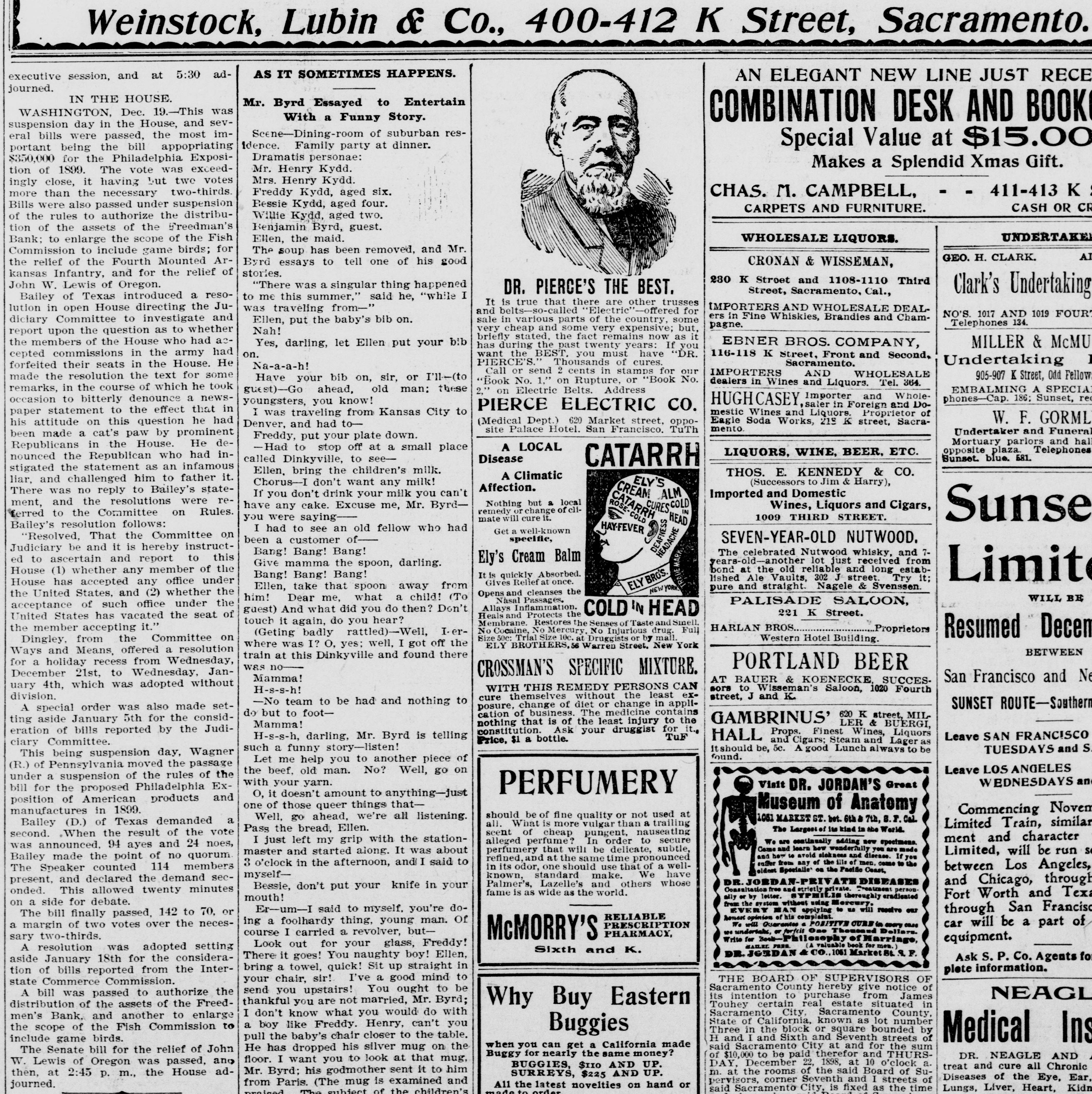 Weinstock, Lubin & Co., 400-412 K Street, Sacramento. AS IT SOMETIMES HAPPENS. executive session, and at 5:30 adAN ELEGANT NEW LINE JUST RECE journed. IN THE HOUSE. Mr. Byrd Essayed to Entertain WASHINGTON, Dec. 19.-This was With a Funny Story. COMBINATION DESK AND BOOK suspension day in the House, and sevScene-Dining-room of suburban reseral bills were passed, the most imIdence. Family party at dinner. Special Value at $15.00 portant being the bill appopriating Dramatis personae: $350,000 for the Philadelphia ExposiMakes a Splendid Xmas Gift. Mr. Henry Kydd. tion of 1899. The vote was exceedMrs. Henry Kydd. ingly close, it having but two votes 411-413 K I Freddy Kydd, aged six. more than the necessary two-thirds. CHAS. M. CAMPBELL, Bessie Kydd, aged four. Bills were also passed under suspension CASH OR CR CARPETS AND FURNITURE. of the rules to authorize the distribuWillie Kydd, aged two. tion of the assets of the Freedman's Benjamin Byrd, guest. UNDERTAKE! WHOLESALE LIQUORS. Ellen, the maid. Bank; to enlarge the scope of the Fish Commission to include game birds; for The soup has been removed, and Mr. AI GEO. H. CLARK. the relief of the Fourth Mounted ArByrd essays to tell one of his good CRONAN & WISSEMAN, stories. kansas Infantry, and for the relief of 230 K Street and 1108-1110 Third John W. Lewis of Oregon. "There was a singular thing happened DR. PIERCE'S THE BEST. Street, Sacramento, Cal., Clark's Undertaking to me this summer," said he, "while I Bailey of Texas introduced a resoIt is true that there are other trusses IMPORTERS AND WHOLESALE DEALlution in open House directing the Juwas traveling from-" and belts-so-called "Electric"-offered for NO'S. 1017 AND 1019 FOUR ers in Fine Whiskies, Brandies and Chamsale in various parts of the country, some diciary Committee to investigate and Ellen, put the baby's bib on. Telephones 134. pagne. very cheap and some very expensive; but, Nah! report upon the question as to whether briefly stated, the fact remains now as it the members of the House who had acYes, darling, let Ellen put your bib MILLER & McMU EBNER BROS. COMPANY, has during the past twenty years: If you want the BEST. you must have DR. on. cepted commissions in the army had 116-118 K Street, Front and Second, PIERCE'S." Thousands of cures. Sacramento. Undertaking 1 forfeited their seats in the House. He Na-a-a-h! Call or send 2 cents in stamps for our IMPORTERS AND WHOLESALE made the resolution the text for some 905-907 K Street, Odd Fellow: Have your bib on, sir, or I'll-(to Book No. 1." on Rupture, or 'Book No. dealers in Wines and Liquors. Tel. 364. remarks, in the course of which he took EMBALMING A SPECIAL guest)-Go ahead, old man: these 2," on Electric Belts. Address Wholeand Importer occasion to bitterly denounce a newsphones-Cap. 186; Sunset, re HUGHCASEY. youngsters, you know! saler in Foreign and DoPIERCE ELECTRIC CO. paper statement to the effect that in I was traveling from Kansas City to mestic Wines and Liquors. Proprietor of W. F. GORML (Medical Dept.) 620 Market street, oppoEagle Soda Works, 218 K street, Sacrahis attitude on this question he had Denver, and had tomento. site Palace Hotel. San Francisco. TuTh Undertaker and Funeral been made a cat's paw by prominent Freddy, put your plate down. Mortuary parlors and hal Republicans in the House. He deA LOCAL -Had to stop off at a small place opposite plaza. Telephones LIQUORS, WINE, BEER, ETC. nounced the Republican who had inSunset. blue. 581. Disease called Dinkyville, to seeCATARRH stigated the statement as an infamous Ellen, bring the children's milk. THOS. E. KENNEDY & CO. A Climatic liar, and challenged him to father it. Chorus-I don't want any milk! (Successors to Jim & Harry), Affection. There was no reply to Bailey's stateALM If you don't drink your milk you can't Imported and Domestic ment, and the resolutions were reNothing but a local have any cake. Excuse me, Mr. ByrdWines, Liquors and Cigars, remedy change of cliferred to the Committee on Rules. 1009 THIRD STREET. you were sayingmate will cure it. Sunse Bailey's resolution follows: I had to see an old fellow who had HAY-FEVER Get a well-known "Resolved, That the Committee on specific, SEVEN-YEAR-OLD NUTWOOD. been a customer ofJudiciary be and it is hereby instructBang! Bang! Bang! The celebrated Nutwood whisky, and 7ed to ascertain and report to this years-old-another lot just received from Ely's Cream Balm Give mamma the spoon, darling. bond at the old reliable and long estabHouse (1) whether any member of the It is quickly Absorbed. Bang! Bang! Bang! Limite lished Ale Vaults, 302 J street. Try it; Gives Relief once. House has accepted any office under Ellen, take that spoon away from pure and straight. Nagele & Svenssen. the United States, and (2) whether the Opens and cleanses the WILL BE him! Dear me, what a child! (To Nasal Passages. PALISADE SALOON, acceptance of such office under the Allays Inflammation. guest) And what did you do then? Don't HEAD COLD 221 K Street. Heals and Protects the United States has vacated the seat of touch it again, do you hear? Membrane. Restores the Senses of Taste and Smell, HARLAN BROS the member accepting it." Proprietors No Cocaine, No Mercury. No Injurious drug. Full (Geting badly rattled)-Well, I.erResumed Decen Size 50c: Trial Size 10c. at Druggists or by Western Hotel Building. Dingley, from the Committee on where was I? o, yes; well, I got off the ELY BROTHERS,56 Warren Street. New York Ways and Means, offered a resolution BETWEEN train at this Dinkyville and found there for a holiday recess from Wednesday, PORTLAND BEER was no CROSSMAN'S SPECIFIC MIXTURE. December 21st, to Wednesday, JanMamma! San Francisco and Ne AT BAUER & KOENECKE. SUCCESuary 4th, which was adopted without WITH THIS REMEDY PERSONS CAN sors to Wisseman's Saloon, 1020 Fourth H-s-s-h! division. street, J and K. cure themselves without the least ex-No team to be had and nothing to SUNSET ROUTE-Southern posure, change of diet or change in