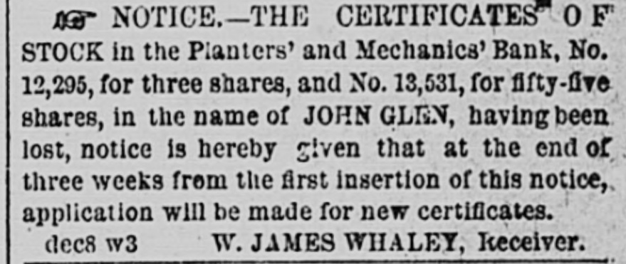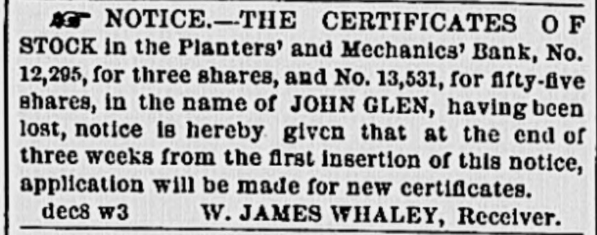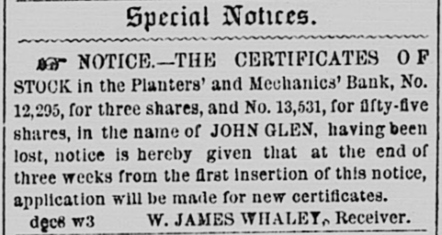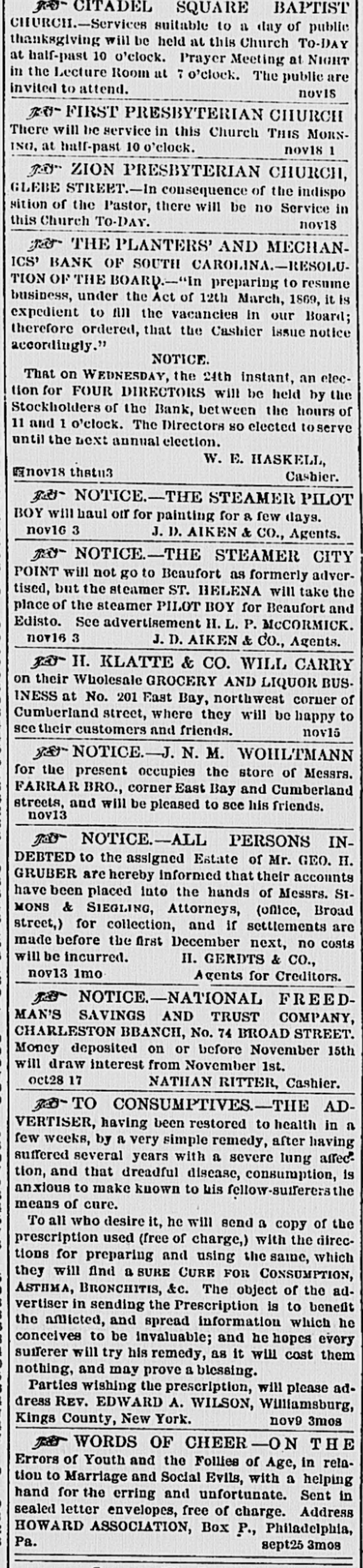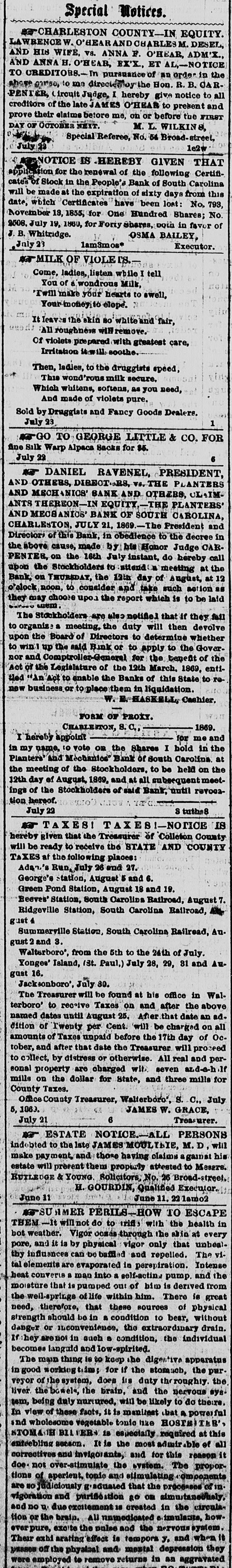 Special Notices. CHARLESION COUNTY- IN EQUITY. DESEL LAWBENCE W O'HEAR AND CHARLEST M. ADM'X. HIS WIFE. vs. ANNA F. O'HEAR, AND ANNA H. O'HEAR, EX'X ET AL,- NOTICE AND CREDITORS - In pursuance of an order CARTO to me directemos the Hon. R. B. to PENTER, ircuit Judge, I hereby give notice and all creditors of the late JAMES O'HEAR to present the FIRST prove their elaime before me, on or before DAY OF OCTOBER NEXT. M. L. WILKINS, was $ July 29 Special Referee, No. 54 Broad-street 1e2w NOTIOE IS HEREBY GIVEN Certifi- HAT olication for the renewal of the following Carolina appl: of Stock in the People'a Bank of South from cates will be made at the expiration of sixty days No. 793, this which Certificates have been lost: November date, 18, 1855, for One Hundred Shares; in favor No of 2508. July 19, 1860, for Forty Shares, DQ J. B. Whitridge. OSMA BAILEY, Jnly 23 1amSmos* Executor ATT MILK OF VIOLE! Come, ladies, listen while tell You of wondrous Milk, Twill make your hearts to swell, Your money elopé. It leaves the skin BO white and fair, All roughney will remove. Of violets prepared with greatest care, Irritation it:will-soothe Then, ladies, to the druggists speed, This wond'rous milk secure. Which whitens, softens, as you need, And made of violets pure. July 23 Sold by Druggists and Fancy Goods Dealers. TO GEORGE LITTLE $5. & CO. FOR fine Silk Warp Alpaca Backs for 6 July 22 DANIEL RAVENEL, PRESIDENT, PLANTERS KT OTHERS, DIRECT vs. THE CLAIM AND MECHANICS' BANK AND OTHERS, PLANTERS' AND THEREON- EQUITY, THE CAROLINA, ANTS AND MECS ANIOS BANK 1869.-The OF SOUTH President and CHARLESTON. this JULY Bank, in obedience to the decree OAR- in Director of cause, made by Honor Judge hereby call the above the 16th July instant, do at the PENTER, on stockholders to attend a meeting at 12 upon the THURSDAY, the 12th day of August, action Bank, on consider and take such be laid o'slock they may noon, choose to upon the report which is to fail to Stockholders even are alea notified that then if they devolve The organiz meeting, the duty to determine will whether upon the Board the said of Directors Bink or to apply to benefit the Gover- of the nor to win'l and up Comptroller- General 12th for March. the 1869, entiLegislature of the this State to reAct of the Act to enable the Banks liquidation. of new tied "An business or toplace W. them E. HASKELL in Cashier. FORM OF PROXY. 1869. CHARLESTON, 8. C., for me and the appoint Shares I hereby vote OR the I hold Carolina in at in my name. 10 Mechanics Bank of South be held on the the Planters' meeting and of the Stockholders. and at all to subsequentmeetings tion hereof. 12th day of the of August Stockholders 1869, of said Bank, until revoeatuthe8 July 22 IS w TAXESI ES of Colleton NOTICE County hereby be ready given that to receive the Treasurer the STATE AND COUNTY TAXES will at the following places 27. Run, July 26 and 19. Adaz's George's station, August 5 and 18 and 6. 7. Green Pond Station, south August Carolina Ratiroad, Railroad, August in Reeves' Bidgeville Station, Station, South Carolina Summer gust guet 4 ille Station, South Carolina Railread, Au Auand 3. the 5th to the 24th of 81 July. and gast 16. Walterboro", Yonges' Island, from 13t. Paul,) July 28, 29, WalJacksonboro', Treasurer July will be 30. found at and his after office the in above amounts named terboro' The dates to receive until August Taxes Cent. 25. on will After be that charged date of an on Oc- all the dition of of Twenty Taxes unpaid per before Treasurer the 17th will day proceed by collect, distress with seven tober, and after that date or otherwise. All real and-e-h and per- If on mills County Taxes. to sonal property the dollar are charged for state, and three mills for S. C., July Walterboro', 1063 6 July 21 office County I Treasurer, JAMES W. Treasurer. GRACE, PERSONS w ESTATE TAMES MOULTHIE, NOTICE.-ALL M. against D, his will estate indebted to the and those having attested claims to Mesers. & EUTLEDGE make payment, present them property No. 26 Broad-street. June 11 June 11. YOUNG. H. GOURDIN, Solicitors, Qualified 221amo2 Executor. TO ESCAPE HMER PERILS HOW with the health in will not do through the unbealTHEM-It SU Vigor Dosas to writte only abio that at every vibot weather. and it is by physical vigor and repelled. The are evaporated in pump and the pore, tal tby elemente influences can into baffled a self-actin perspiration. derived Intense from heat converts a man out of him is is great moisture that is life within him. sources of physical the well-springs pumped There that these bear, without need, therefore, be in a condition extraordinary to drain. strength or should inconvenience, condition, the the individual danger in such a -spirited apperatus If hey languid and the digestive becomes main thing is to keep if the stomach, the pur- the The working time for his duty the roughly. eye in of the system, brain, and the do theirs. liver. vesor good the bowels, nursured, the does will be likely nervous to power being duly it is manitest bat a this tem, In and view wholesome of these vegetable facts, 18 tonic especially like admirable required HOSTEITER at of all ER is the most this reason enteebling correctives getson. and invigolants, the and system. for The omponente propor radioiously doe not over-stimulate tonic and simulating processor's tions of aperient. signated that the vigoration are HO and excitement purindition created 20 in imulants. the circula- how and no u. due All numedicated nervous system. it Hon or the brain. the pulse and the y. and when were employed off the phyatost to remove returns in an Their over pure, exhi exote aratina effect and is tempora mental depression aggravated they