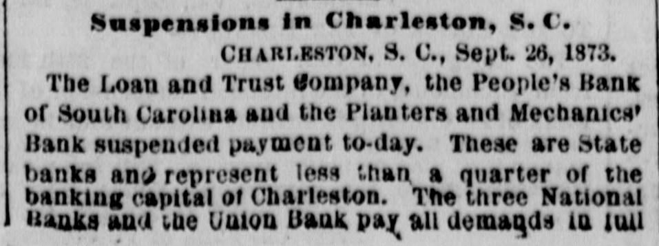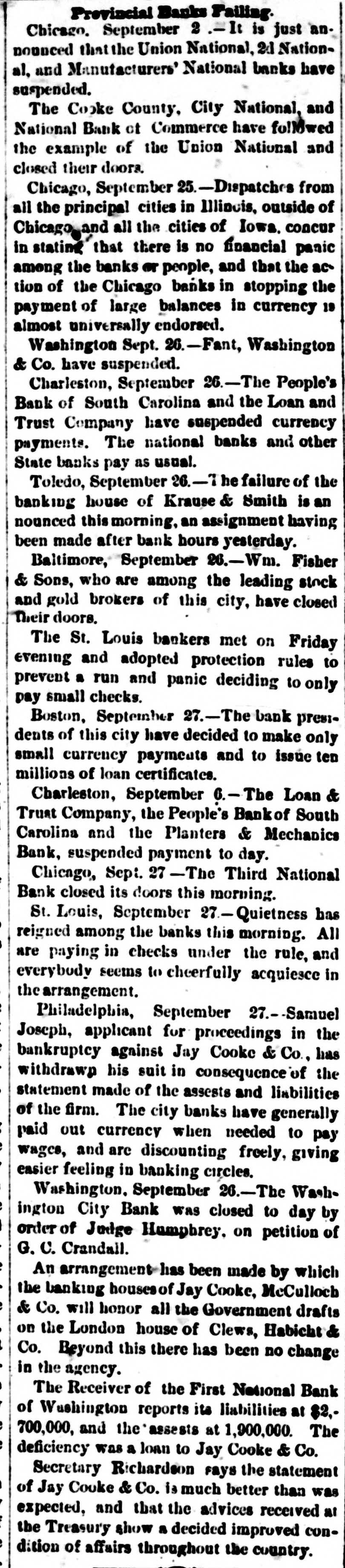 11 TELEGY R A HIC. LATER FROM THE ATLANTIC STATES. y of Henry Claws & Eo. and Resumption Howes s Macey. . YORK, Sept. 26. The Clews resump & e New arrangements of Henry endorsement tion has received general have s Co. number of their customers raccounts e and a in transferring their books. acquiesced special accounts on also been Numerous to new new accounts have ' k opened. Howes & Macey make almost to Messrs. report, all of which goes firms b a similar that the lately suspended customers show the confidence of their men and retain the sympathy of business generally. e Suspensions. r BALTIMORE, Sept. 56. Wim. Fisher stock & who are among the leading closed h Sons, brokers of this city, have been and gold doors. They say they of customers their by delinquencies can colforced suspend business until They they expect to t lect to what every is obligation due them. in full, and only pay ask short indulgence. C a Sept. 26. -The the People's Loan CHARLESTON. South Carolina and e Bank Trust of Co. have suspended banks currency and e and The National usual. e payments. State banks pay as Trust other 27 The Loan & Carolina, Co. 1 Sept. Peoples' Bank of South Rank the the Planters' and Mechanics' These are and suspended payment to-day. less than a State banks, representing of Charlese quarter of the bank capital banks and the S ton. bank pay all Three National demands in full and st Ky., claim Union to be stronger Sept. than yesterday. 27 Consid here to-day. LOUISVILLE, excitement prevailed at an early n erable by the suspension the caused the German Security. Savhour, of Insurance, the Masonic the Central g German Western Bank, Louisville le ings, the German) Bank, the suspended their liabilities. banks Savings Banking have Company. abundant resources The to meet 1Jubilee in Philodelphia. e Masonic Sept. 26. At the to-day ded is PHILADELPHIA, of the Masonic Temple hia turned in ication fifty-nine Lodges of about Philadeli nine thousand al out, numbering The procession was nearly point W members. hours in passing a given e and three was viewed by 200,000 of the persons. Author of e Unveilling Home, of a Statue sweet Home. 11 Sept. 17 _The collossal BrooktNEW YORK, in Prospect Park, author of d bronze statue John Howard Paine, uncovered >f Tyn, Home, of Sweet Home, of was 6,000 persons. to-day in the presence made, children of the is Addresses were " Home, Sweet e public schools and .. America," sang and John G. eSaxe Home" read an original poem. e Railway Collision. n By a collision on the engines Mid, Sept. Railroad 27 yesterday, the the ears s land torn to pieces and the passen1were wrecked, while accident was badly nearly injury. carelessness few The of of a occasioned gers escaped by the who was running 1freight eight minutes conductor. into the time of a pasy senger train. Midland Railroad Disaster. 26. This y is The N. J., Sept. train on the the left e Midland morning PATERSON, railroad, passenger which train near here New at e ran into a freight and firemen f5:54, Both engineers the firemen Durham. hurt, one of were d e fatally; were badly Four or five passengers of n einjured. Fever Abating Only for Lack Yellow Vietims. Within of SHREVEPORT, La., Sept. 29. of the most days several citizens of r'. last four respectable to the and victims I'Shreveport population and the prominent The have fällen has been epidemic. thinned out by sickness fun11 fearfully We have no longer single or two death. followed by one the d e. street erals; carriages, like a hearse, dashes section quickly of A artillery few more through in bodies battle into seeking a position. into coffins, shoved is driven li are drummed and the collection even the hearse cemetery. This is citizens. the case The to the the most prominent have opened an n with Howard Association feeding about e Orphan Asylum the and resident are population. cases d two-thirds fewer of deaths and new 1on h. There because are there are fewer Commissioners people. to Finding* British of the and Mixed American 27.-A Boston Claims. spech. of PITTSBURG, Journal Sept. from New British York says and in the Mixed have madefinal day g ial American to the Claims Commission its business on one awards treaty and concluded fixed by the that al of ahead In brief, of the the result time Government of the inquiry paid is to e the United States by our late war to 2 $1,- per t 1, English of sufferers their claims, amounting American claims 920,819, cent. while the are all disallowed. is g toagainst Financial England Outlook in the advices East. or home rNEW The touching YORK, Sept. the financial 29. All situation reassur- at The day and abroad are of reopening a very of the event et looked upon Stock ing character. Exchange with to-morrow much less is apprehen- an