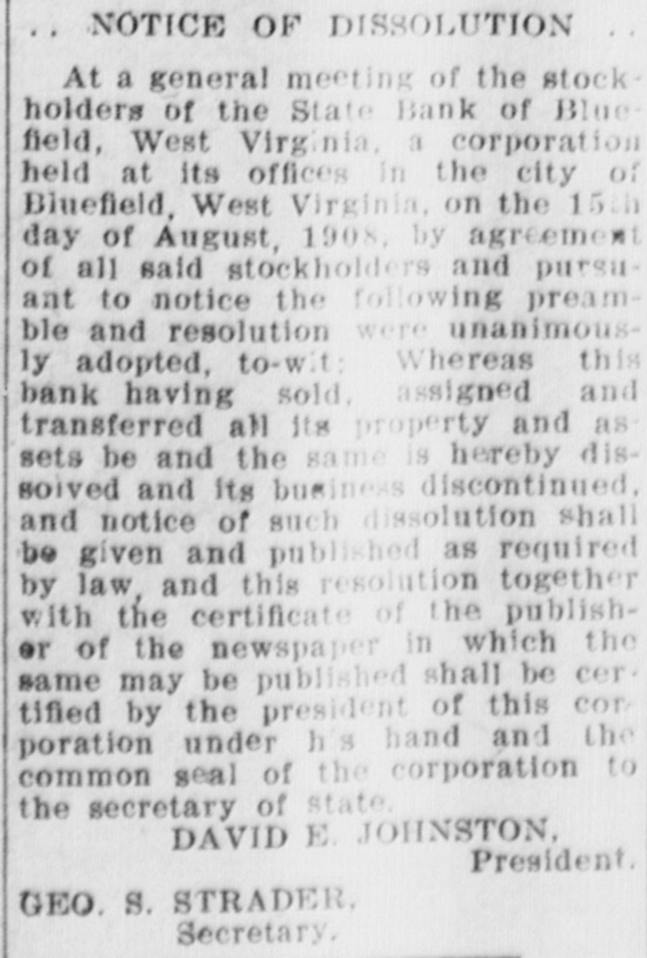NOTICE OF DISSOLUTION At a general meeting of the stockholders of the State Bank of Bluefield, West Virginia, a corporation held at its offices in the city of Bluefield, West Virginia, on the 15th day of August, 1908, by agreement of all said stockholders and pursuant to notice the following preamble and resolution were unanimously adopted, to-wit: Whereas this bank having sold, assigned and transferred all its property and as sets be and the same is hereby dissolved and its business discontinued, and notice of such dissolution shall be given and published as required by law, and this resolution together with the certificate of the publishor of the newspaper in which the same may be published shall be cer. tified by the president of this corporation under his hand and the common seal of the corporation to the secretary of state, DAVID E. JOHNSTON, President. GEO. S. STRADER, Secretary.