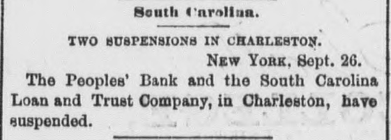 South Carolina. TWO SUSPENSIONS IN CHARLESTON. NEW YORK, Sept. 26. The Peoples' Bank and the South Carolina Loan and Trust Company, in Charleston, have suspended.