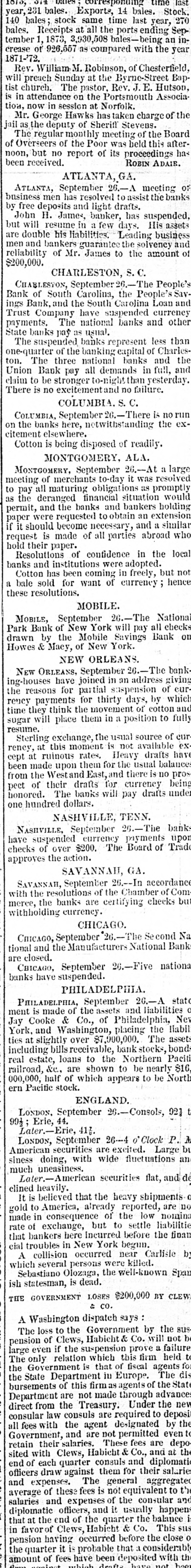 1010, 014 Dates corresponding time last year, 231 bales. Exports, 14 bales. Stock. 140 bales stock same time last year, 270 bales. Receipts at all the ports ending September 1, 1873, 3,930,508 bales-being an increase of 926.557 as compared with the year 1871-72. Rev. William M. Robinson, of Chesterfield, will preach Sunday at the Byrne-Street Baptist church. The pastor. Rev. J.E. Hutson, is in attendance on the Portsmouth Associatioa, now in session at Norfolk Mr. George Hawks has taken charge of the jail as the deputy of Sheriff Stevens. The regular monthly meeting of the Board of Overseers of the Poor was held this afternoon, but no report of its proceedings has been received. ROBIN ADAIR. ATLANTA, GA. ATLANTA, September 26.-A meeting of business men has resolved to assist the banks by free deposits and light drafts. John H. James, banker, has suspended, but will resume in a few days. His assets are double his liabilities. Leading business men and bankers guarantee the solvency and reliability of Mr. James to the amount of $200,000. CHARLESTON, S.C. CHABLESTON, September 26.-The People's Bank of South Carolina, the People's Savings Bank, and the South Carolina Loan and Trust Company have suspended currency payments. The national banks and other State banks pay as usual. The suspended banks represent less than one-quarter of the banking capital of Charleston. The three national banks and the Union Bank pay all demands in full, and claim to be stronger to-night than yesterday. There is no excitementand no failure. COLUMBIA. COLUMBIA, September 26.-There is no run on the banks here, netwithstanding the exeitement elsewhere Cotton is being disposed of readily. MONTGOMERY, ALA. MONTGOMERY, September 26.-At a large meeting of merchants to-day it was resolved to pay all maturing obligations as promptly as the deranged financial situation would permit, and the banks and bankers holding paper were requested to obtain an extension if it should become necessary, and a similar request is made of all parties abroad who hold their paper. Resolutions of confidence in the local banks and institutions were adopted. Cotton has been coming in freely, but not a bale sold for want of currency ; hence these resolutions. MOBILE. MOBILE, September 26.-The National Park Bank of New York will pay all checks drawn by the Mobile Savings Bank on Howes & Macy, of New York. NEW ORLEANS. NEW ORLEANS, September 26.-The banking-houses have joined in an address giving the reasons for partial saspension of currency payments for thirty days, by which time they think the movement of cotton au sugar will place them in a position to fully resume. Sterling exchange, the usual source of currency, at this moment is not available except at ruinous rates. Heavy drafts have been made upon them for the usual balances from the Westand East, and there is no pros pect of their drafts for currency being honored. The banks will pay drafts under one hundred dollars. NASHVILLE, TENN. NASHVILLE, September 26.-The bank have suspended currency payments upon checks of over $200. The Board of Trade approves the action. SAVANNAH, GA. SAVANNAH, September 26.--In accordance with the resolutions of the Chamber of Commerce, the banks are certifying checks bu withholding currency. CHICAGO. CHICAGO, September Second Na tional and the Manufacturers National Bank are closed. CHICAGO, September 26.-Five national banks have suspended. PHILADELPHIA. PHILADELPHIA, September 26.-A state ment is made of the assets and liabilities d Jay Cooke & Co., of Philadelphia, Nev York, and Washington, placing the liabil ties at slightly over $7,900,000. The assets including bills receivable, bank stocks, bonds real estate, loans to the Northern Paciti railroad, &c. are shown to be nearly S16. 000,000, half of which appears to be North ern Pacific stock. ENGLAND. LONDON, September 20.-Consols, 921 99 Erie, 44. Later.-Erie, 414. LONDON, September 26---4 o' Clock P. M American securities are excited. Large bu siness doing, with wide fluctuations an much uneasiness. Later.-American securities flat, and de clined heavily. It is believed that the heavy shipments 0 gold to America, already reported, are no made in consequence of the low nomina rate of exchange, but to settle liabilitie that bankers here Incurred before the finan cial troubles in New York begun. by A collision occurred near Carlisle which several persons were killed. Sebastiano Olozaga, the well-known Span ish statesman, is dead. THE GOVERNMENT LOSES $200,000 BY CLEW & CO. A Washington dispatch says The loss to the Government by the suspension of Clews, Habicht & Co. will not b large even if the suspension prove a failure The only relation which this firm held to the Government is that of fiscal agents for the State Department in Europe. The dis bursements of this firmasagents of the State Department are not made through advances direct from the Treasury. Under the new consular law consuls are required to deposit all fees with the agent designated by the Government, and are not permitted even to retain their salaries. These fees are deposited with Clews, Habieht & Co., and at the end of each quarter consuls and diplomatic officers draw against them for their salaries and expenses. The general aggregated average of these fees is not equivalent to the salaries and expenses of the consular and diplomatic officers, and it usually happens that at the end of the quarter the balance i in favor of Clews, Habicht & Co. This sus pension having occurred before the close o the quarter it is probable that considerable amount of fees have been deposited with th drafts have not been