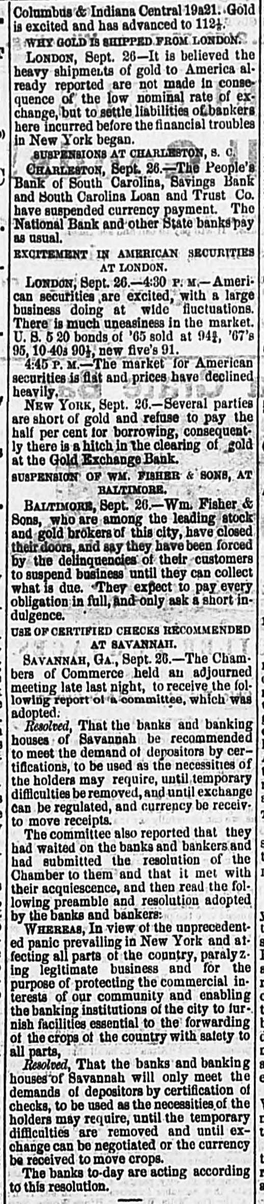 Columbus & Indiana Central 19a21. Gold excited and has advanced to 1124. WHY GOLD IS SHIPPED FROM LONDON. LONDON, Sept. 26-It is believed the heavy shipments of gold to America already reported are not made in consequence of the low nominal rate of exchange, but to settle liabilities of bankers here incurred before the financial troubles in New York began. SUSPENSIONS AT CHARLESTON, S. C. CHARLESTON, Sept. 26.-The People' Bank of South Carolina, Savings Bank and South Carolina Loan and Trust Co. have suspended currency payment. The National Bank and other State banks pay as usual. EXCITEMENT IN AMERICAN SECURITIES AT LONDON. LONDON, Sept. 26.-4:30 M.- American securities are excited, with a large business doing at wide fluctuations. There is much uneasiness in the market. U.S. 20 bonds of '65 sold at 944, '67's 95,10-403 % 901, new five's 91. 4:45 P. M.-The market for American securities is flat and prices have declined heavily, NEW YORK, Sept. 26.-Several parties are short of gold and refuse to pay the half per cent for borrowing, consequently there is a hitch in the clearing of gold at the Gold Exchange Bank. SUSPENSION OF WM. FISHER & SONS, AT BALTIMORE. BALTIMORE, Sept. 26.-Wm. Fisher & Sons, who are among the leading stock and gold brokers of this city, have closed their doors, and say they have been forced by the delinquencies of their customers to suspend business until they can collect what is due. They expect to pay every obligation in full, and only ask a short indulgence. USE OF CERTIFIED CHECKS RECOMMENDED AT SAVANNAH. SAVANNAH, GA., Sept. 26.-The Chambers of Commerce held an adjourned meeting late last night, to receive the following report of committee, which was adopted. Resolved, That the banks and banking houses of Savannah be recommended to meet the demand of depositors by certifications, to be used as the necessities of the holders may require, until temporary difficulties be removed, and until exchange can be regulated, and currency be receivto move receipts. The committee also reported that they had waited on the banks and bankers and had submitted the resolution of the Chamber to them and that it met with their acquiescence, and then read the following preamble and resolution adopted by the banks and bankers: WHEREAS, In view of the unprecedented panic prevailing in New York and at fecting all parts of the country, paralyzing legitimate business and for the purpose of protecting the commercial interests of our community and enabling the banking institutions of the city to furnish facilities essential to the forwarding of the crops of the country with safety to all parts, Resolved, That the banks and banking houses of Savannah will only meet the demands of depositors by certification of checks, to be used as the necessities of the holders may require, until the temporary difficulties are removed and until exchange can be negotiated or the currency be received to move crops. The banks d-day are acting according to this resolution.