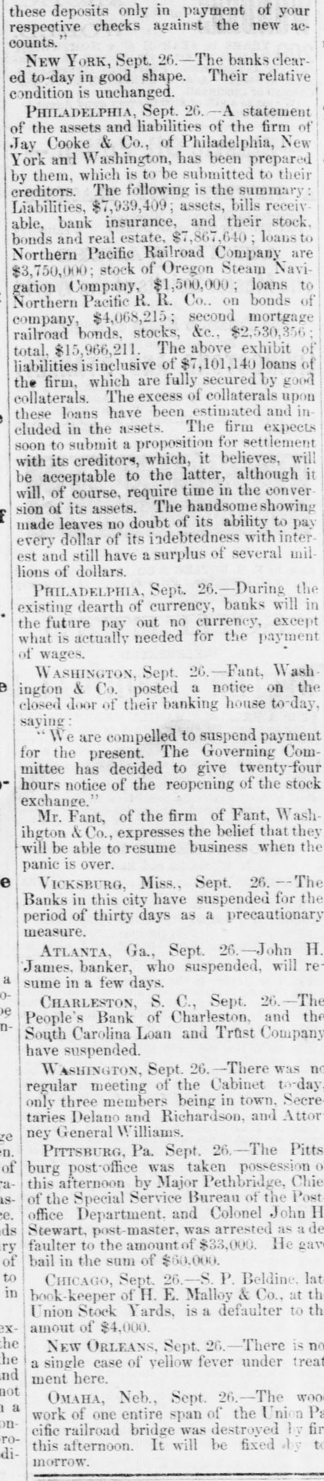these deposits only in payment of your respective checks against the new accounts. NEW YORK, Sept. 26.-The banks cleared to-day in good shape. Their relative condition is unchanged. PHILADELPHIA, Sept. 26.-A statement of the assets and liabilities of the firm of Jay Cooke & Co., of Philadelphia, New York and Washington, has been prepared by them, which is to be submitted to their creditors. The following is the summary: Liabilities, $7,939,409; assets, bills receiv able, bank insurance, and their stock. bonds and real estate, $7,867,640 loans to Northern Pacific Railroad Company are $3,750,000; stock of Oregon Steam Navigation Company, $1,500,000; loans to Northern Pacific R. R. Co., on bonds of company, $4,068,215; second mortgage railroad bonds, stocks, &c., $2,530,356 total, $15,966,211. The above exhibit of liabilities isinclusive of $7,101,140 loans of the firm, which are fully secured by good collaterals. The excess of collaterals upon these loans have been estimated and included in the assets. The firm expects soon to submit a proposition for settlement with its creditors, which, it believes, will be acceptable to the latter, although it will, of course, require time in the conversion of its assets. The handsomeshowing made leaves no doubt of its ability to pay every dollar of its indebtedness with interest and still have a surplus of several millions of dollars. PHILADELPHIA, Sept. 26.-During the existing dearth of currency, banks will in the future pay out no currency, except what is actually needed for the payment of wages. WASHINGTON, Sept. 26. -Fant, Wash e ington & Co. posted a notice on the closed door of their banking house to day, saying We are compelled to suspend payment for the present. The Governing Committee has decided to give twenty four hours notice of the reopening of the stock exchange. Mr. Fant, of the firm of Fant, Washihgton &Co., expresses the belief that they will be able to resume business when the panic is over. e VICKSBURG, Miss., Sept. 26. -The Banks in this city have suspended for the period of thirty days as a precautionary measure. ATLANTA, Ga., Sept. 26.-John H James, banker, who suspended, will re a sume in a few days. CHARLESTON, S. C., Sept. 26.-The be People's Bank of Charleston, and the nSouth Carolina Loan and Trust Company have suspended. WASHINGTON, Sept. 26. -There was no regular meeting of the Cabinet to-day only three members being in town, Secre taries Delano and Richardson, and Attor ney General Williams, re n. PITTSBURG, Pa. Sept. 26.-The Pitts of burg t-office was taken possession o a this afternoon by Major Pethbridge, Chie isof the Special Service Bureau of the Post e. office Department. and Colonel John H ds Stewart. post-master, was arrested as a de faulter to the amount of $33,000. He gay ry of bail in the sum of $60.000. to CHICAGO, Sept. 26.-S. P. Beldine, lat in book-keeper of H. E. Malloy & Co., at th Union Stock Yards, is a defaulter to th ex amout of $4,000. the NEW ORLEANS, Sept. 26. -There is no the a single case of yellow fever under treat nd ment here. not OMAHA, Neb., Sept. 26.-The woo 1 a work of one entire span of the Union Pa oncific railroad bridge was destroyed by fir rothis afternoon. It will be fixed by t dimorrow.