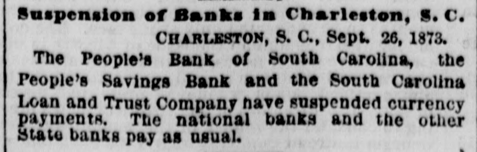 Suspension of Banks in Charleston, s.c. CHARLESTON, S. C., Sept. 26, 1873. The People's Bank of South Carolina, the People's Savings Bank and the South Carolina Loan and Trust Company have suspended currency payments. The national banks and the other State banks pay as usual.