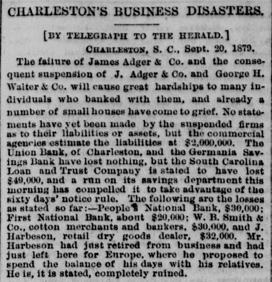 CHARLESTON'S BUSINESS DISASTERS. [BY TELEGRAPH TO THE HERALD.] CHARLESTON, S. C., Sept. 20, 1879. The failure of James Adger & Co. and the consequent suspension of J. Adger & Co. and George H. Walter & Co. will cause great hardships to many individuals who banked with them, and already a number of small houses havecome to grief. No statements have yet been made by the suspended firms as to their liabilities or assets, but the commercial agencies estimate the liabilities at $2,000,000. The Union Bank, of Charleston, and the Germania Savings Bank have lost nothing, but the South Carolina Loan and Trust Company is stated to have lost $49,000, and a run on its savings department this morning has compelled it to take advantage of the sixty days' notice rule. The following are the losses as stated so far:-People's National Bank, $30,000; First National Bank, about $20,000; W. B. Smith & Co., cotton merchants and bankers. $30,000, and J. Harbeson, retail dry goods dealer, $32,000. Mr. Harbeson had just retired from business and had just left here for Europe. where he proposed to spend the balance of his days with his relatives. He is, it is stated, completely ruined.