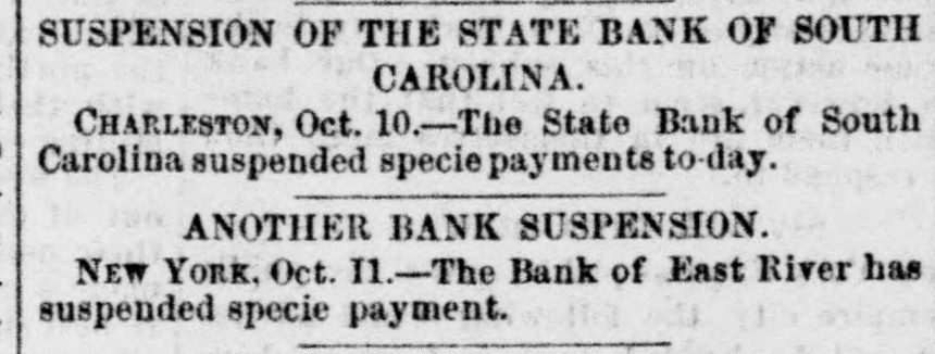 SUSPENSION OF THE STATE BANK OF SOUTH CAROLINA. CHARLESTON, Oct. 10.-The State Bank of South Carolina suspended specie payments to-day. ANOTHER BANK SUSPENSION. NEW YORK, Oct. I1.-The Bank of East River has suspended specie payment.