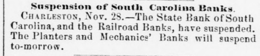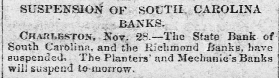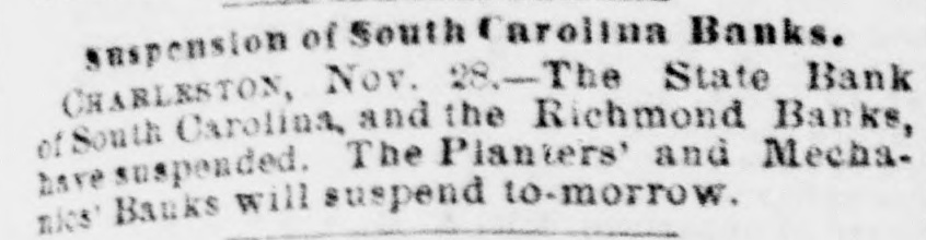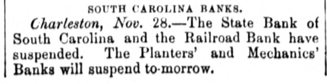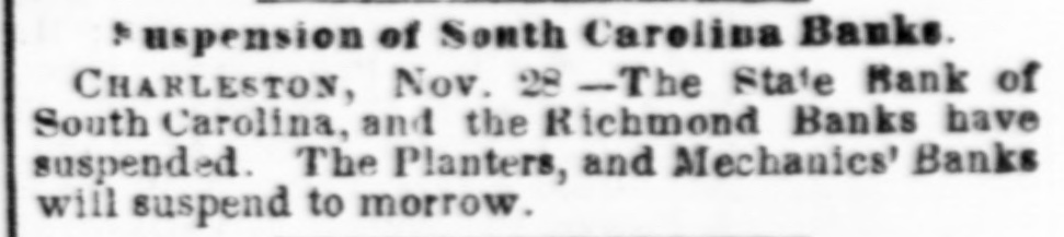 SUSPENSION OF SOUTH CAROLINA BANKS. CHARLESTON, Nov. 28.-The State Bank of South Carolina, and the Richmond Banks, have suspended. The Planters' and Mechanic's Banks will suspend to-morrow.