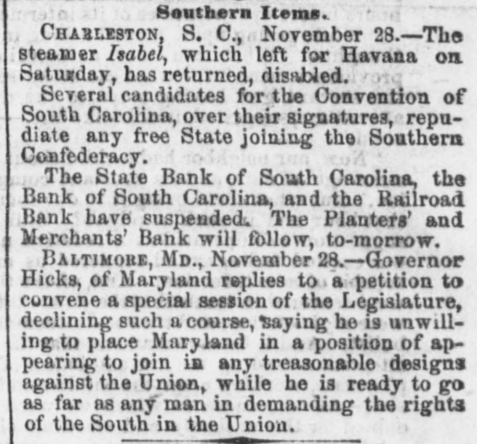 Southern Items. CHARLESTON, S. C., November 28.-The steamer Isabel, which left for Havana on Saturday, has returned, disabled. Several candidates for the Convention of South Carolina, over their signatures, repudiate any free State joining the Southern Confederacy. The State Bank of South Carolina, the Bank of South Carolina, and the Railroad Bank have suspended. The Planters' and Merchants' Bank will follow, to-morrow. BALTIMORE, MD., November 28.-Governor Hicks, of Maryland replies to a petition to convene a special session of the Legislature, declining such a course, saying he is unwilling to place Maryland in a position of appearing to join in any treasonable designs against the Union, while he is ready to go as far as any man in demanding the rights of the South in the Union.