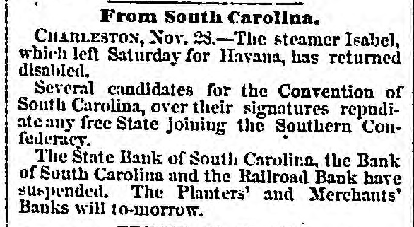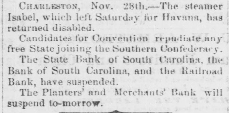From South Carolina. CHARLESTON, Nov. 28.-The steamer Isabel, which left Saturday for Havana, has returned disabled. Several candidates for the Convention of South Carolina, over their signatures repudiate any free State joining the Southern Confederacy. The State Bank of South Carolina, the Bank of South Carolina and the Railroad Bank have suspended. The Planters' and Merchants' Banks will to-morrow.